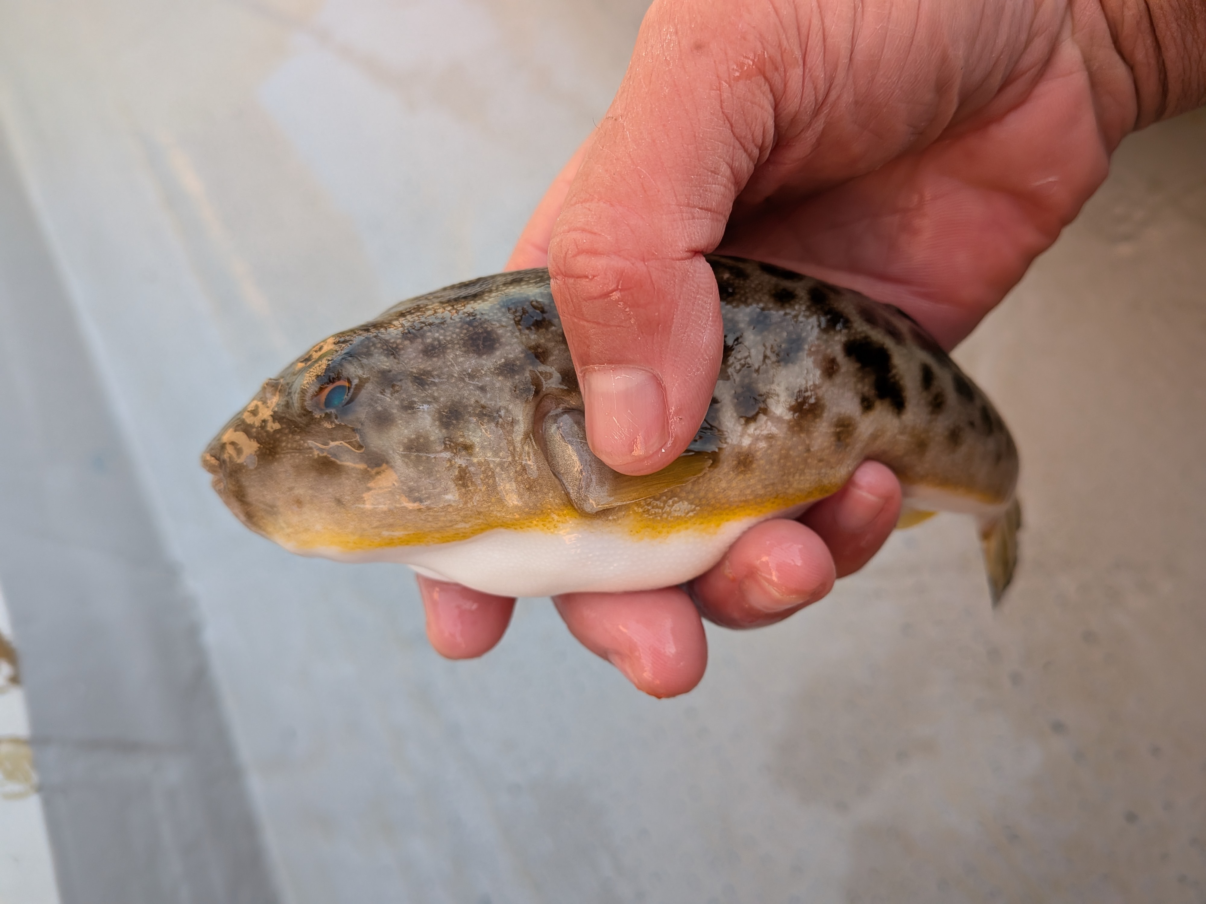 まだシーズン序盤で水温が高いからかアタリは多くもリリースサイズのショウサイフグと磯ベラのアタリが激しく本命があたる前にエサが取られます。