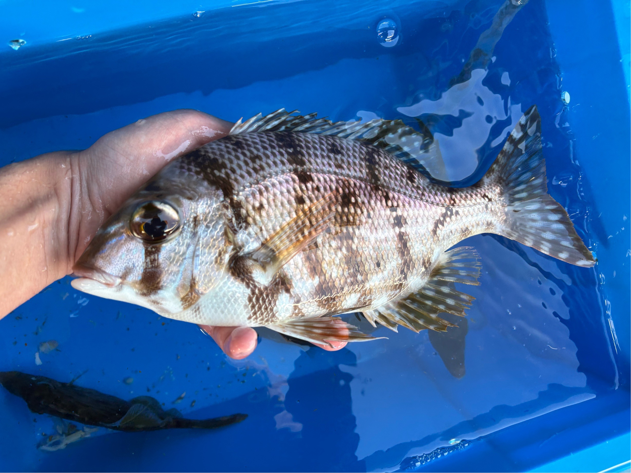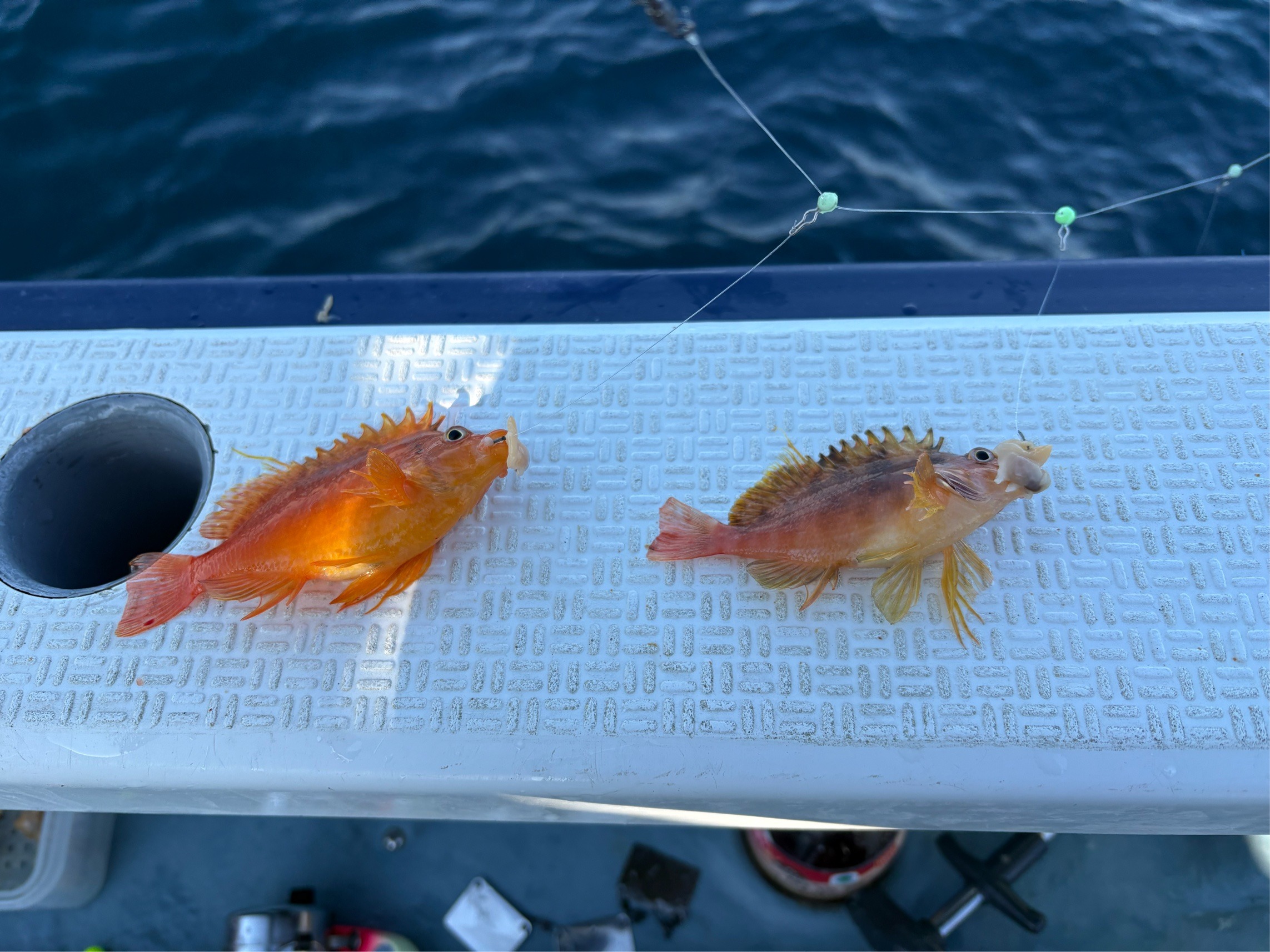 こちらの船宿さんは2度目、前回と同じ10号船の同じ釣り座。 大きな活かし桶と船縁下のドリンクホルダーの穴?(違うかも)が嬉しいです。