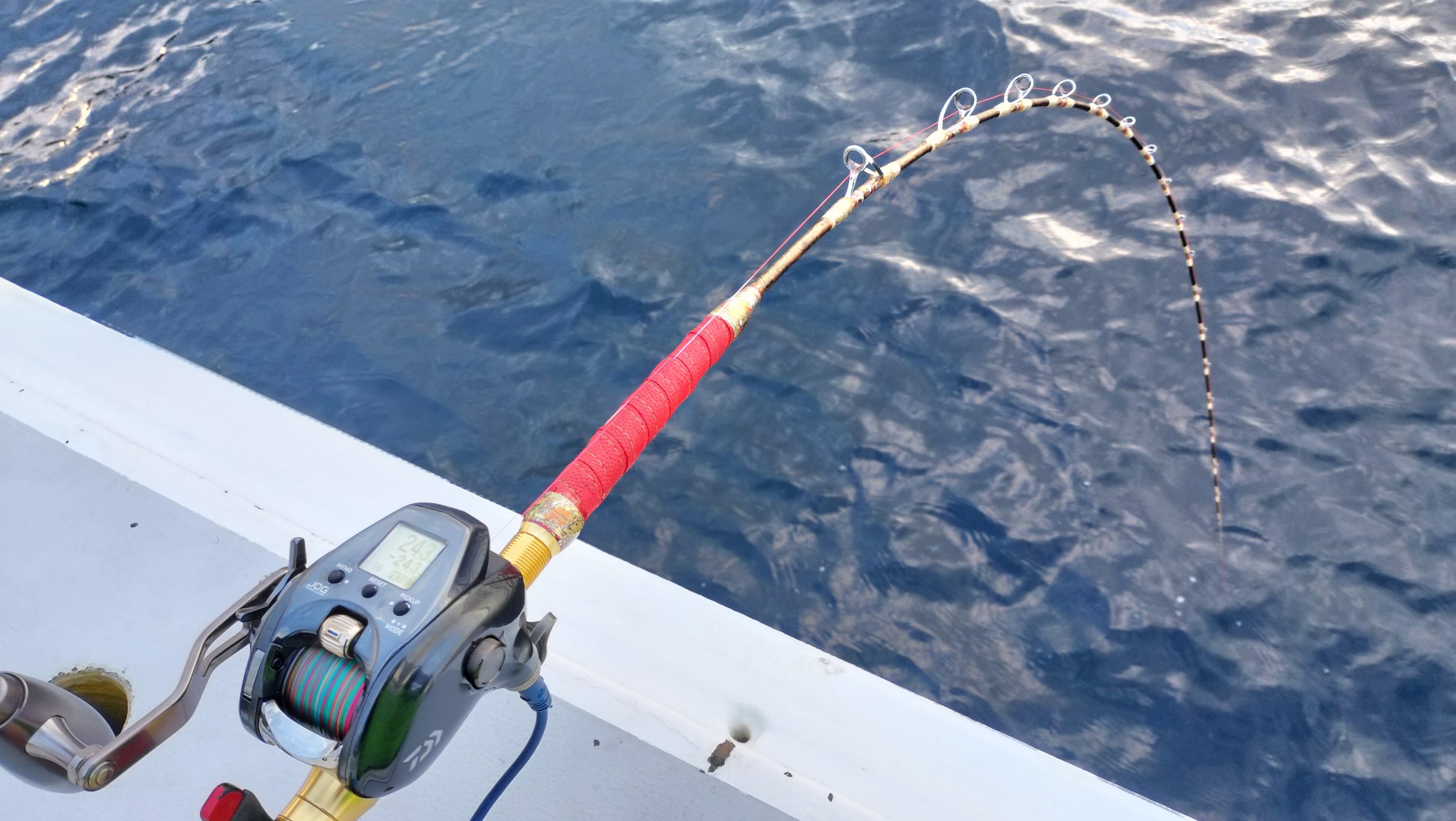 6時半過ぎに出船となるが群青色の澄み切った潮色のせいか、航程5分の真沖で投入するも魚探(探見丸)に映る反応とは異なり誰のロッドも曲がらずに移動となる。