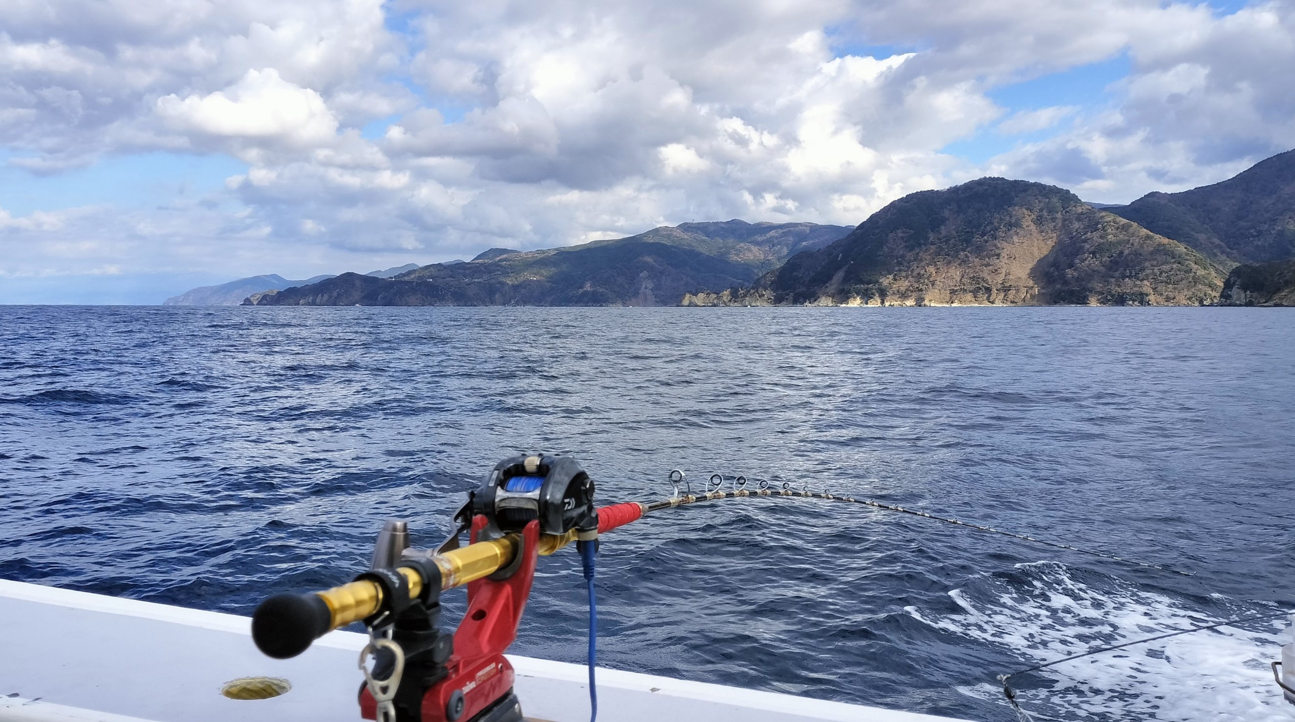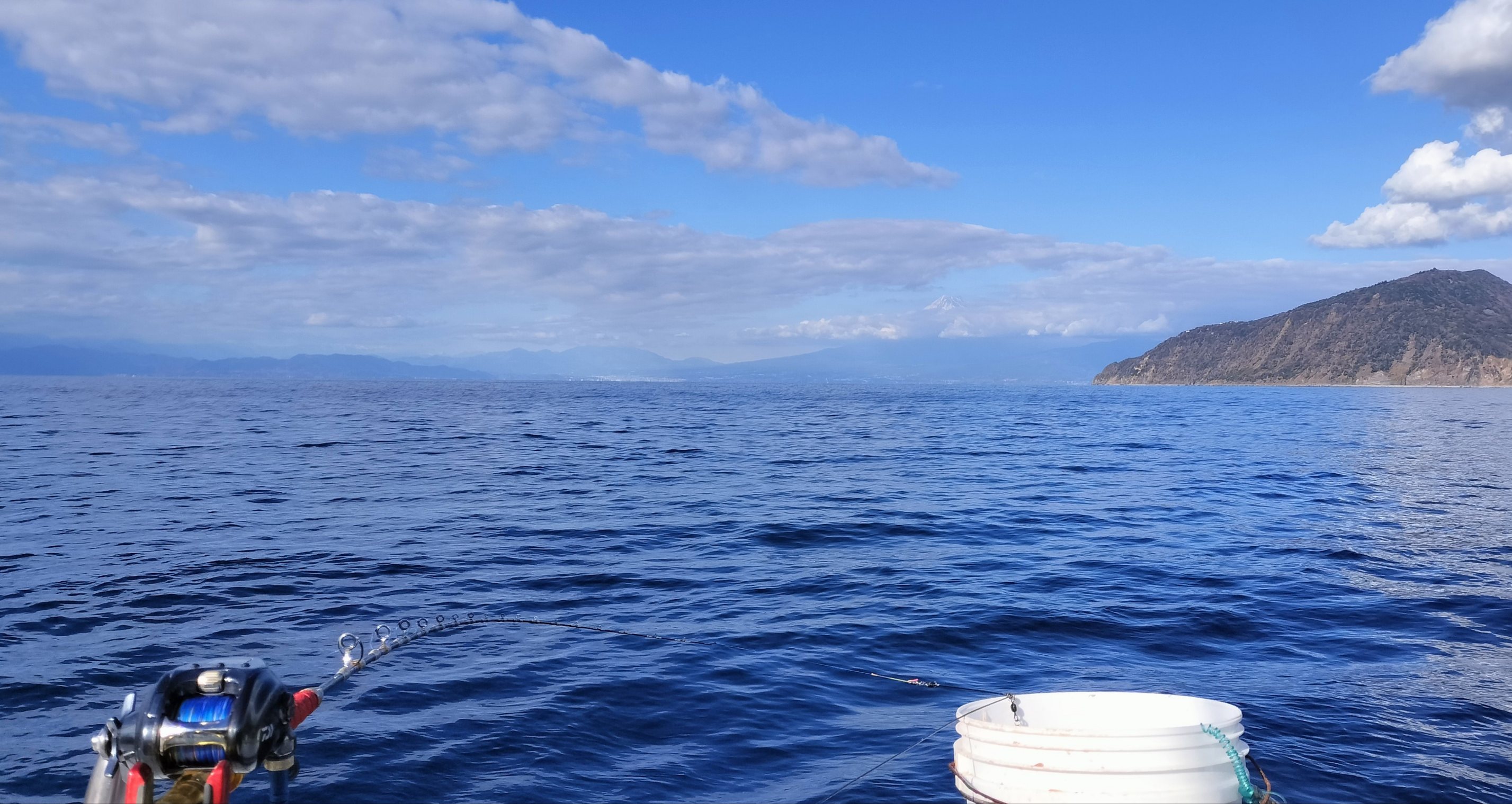 その後も恋人岬下、宇久須沖、安良里沖の好ポイントを流すも潮の澄み加減が激しいせいか、まるでハリの付いたエサを見極められているかの様にヒットは出ずに折り返しポイントの田子島周りに到着。