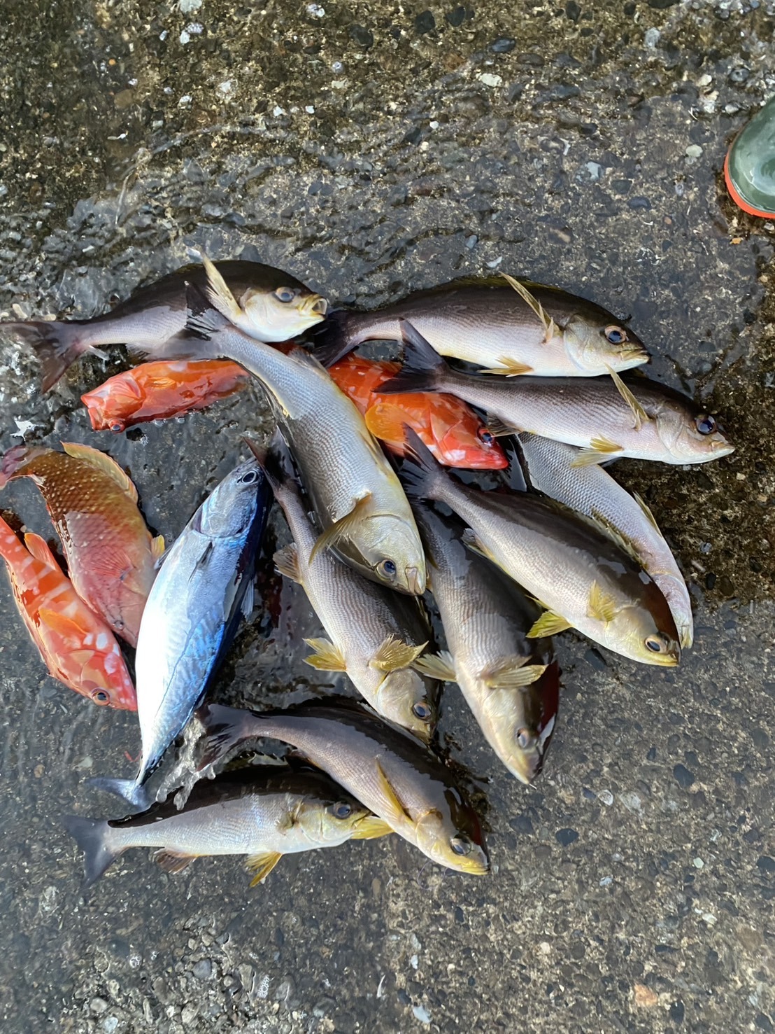 2026.01.05 印刷する カセ 五目釣りDAY1 魚種 イサギ/イサキ サイズ 42cm 数 イサキ/10匹 カツオ/1匹 アカハタ 釣り方 ☆船五目 場所 和歌山県 天候 晴れ スタッフ 森下章広 店舗 本社 釣行日 2025.12.28 コメント 今日は友人とのんびりカセ釣りです。 何釣りをしてもいいのですが、今日はフカセメインでグレ、イサキを狙い、合間に底物狙いで色々なことを試してみようと思っています。 まずはフカセ釣りで、仕掛けは基本磯での仕掛けとかわらないのですが、船上ということもあり、竿は3.8mと短めにしています。リールはレバーブレーキ2500番で道糸はいつも磯では1.5号を使っていますが、2号スタートです。 エサもオキアミに集魚剤をまぜ、今日は遠投は必要ないので少しや柔らかめに調整します。 まずは撒き餌をいて潮の流れを確認しますが、いい感じで北向きに流れています。 早速撒き餌と仕掛けを同調させ、フリーで流していきます。 これを数投繰り返すと、早速30mほど流したところで、バチバチッと道糸がスプールから引っ張り出されます。 ファーストヒットは30cmほどのイサキで嬉しい1匹です。 その後もこのパターンがハマり、2.3匹追加です。 さらに流していると突然強烈なアタリがあり、今までと全く違う引きが竿に伝わります。 ドラグが音を立て引き出され、一気に底まで走られ、結局なすすべもなく根に潜られてしまいました。 こうしたとてつもない大物が当たってくるのもカセ釣りの魅力です。 結局その後もコンスタントに色々な魚種を釣ることができ、正月の食材は何とかゲットできました。 使用した釣具 竿 シマノ ボーダレス380H リール ダイワ トーナメント競技2500LBD