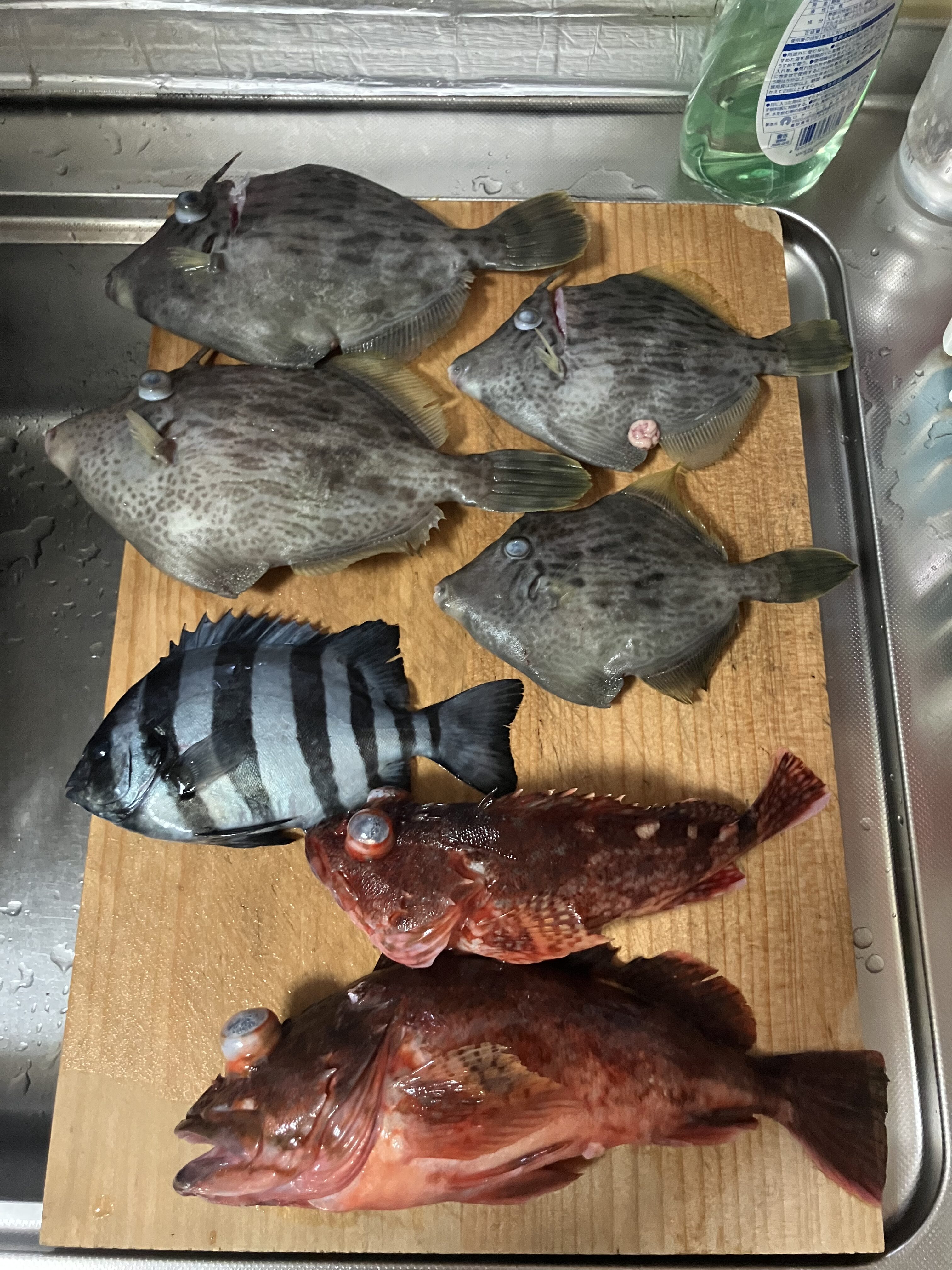 ダイワの針付き仕掛けに集魚板、ブンブンシンカーをつけ、カワハギげっちゅーとイカの短冊をつけ投入…直ぐに小気味良いコンコンという当たり、小さいながら本命のカワハギですね。そこからポツポツカワハギが釣れます。中にはいいサイズのガシラも混ざって楽しめました。しかし途中から誘いなのか、棚なのか、わかりませんが、ベラのオンパレードになってしまいました。13:00納竿とし、港に帰った頃にかなりの風吹きました。船長のいい判断でした。