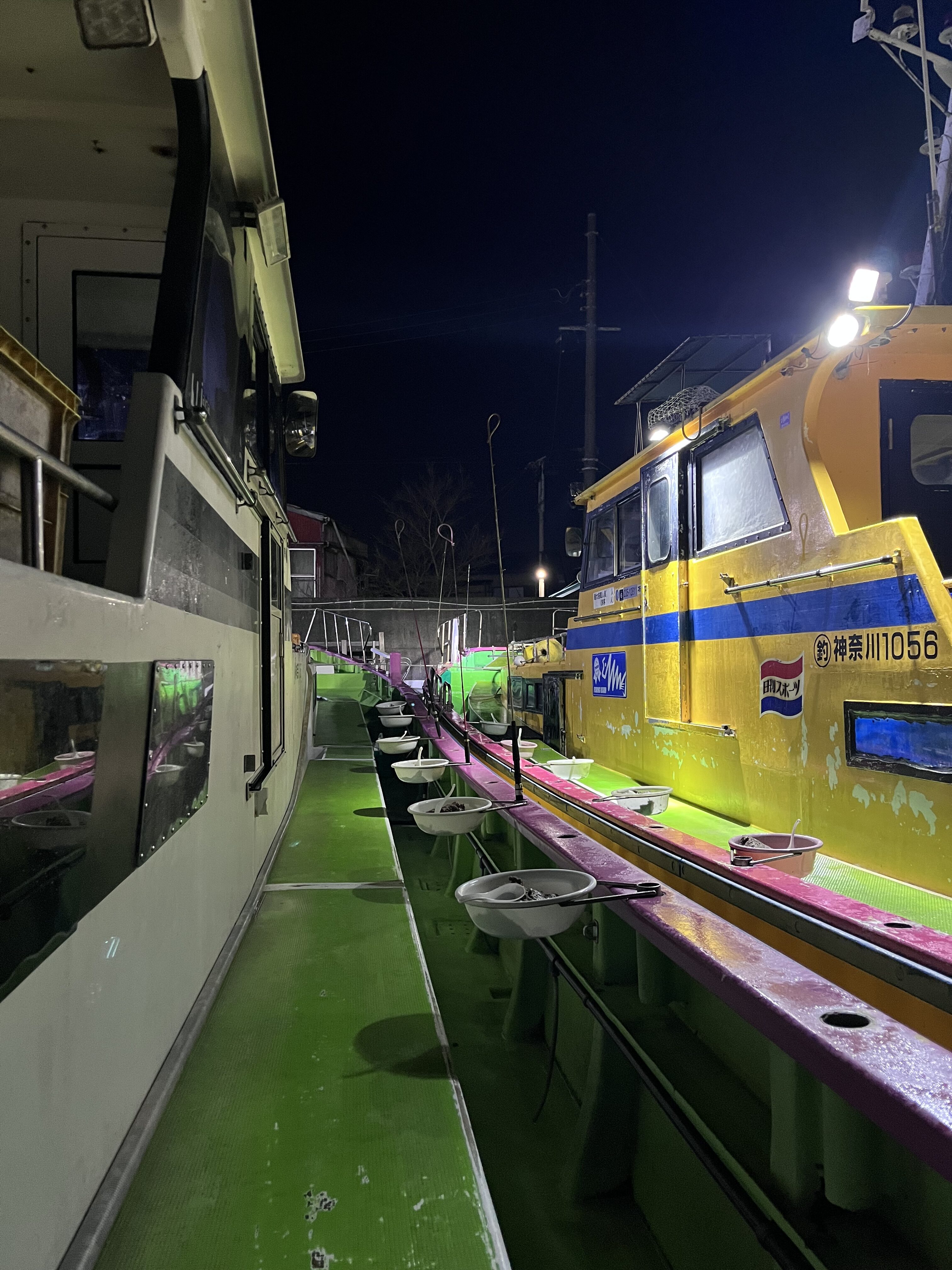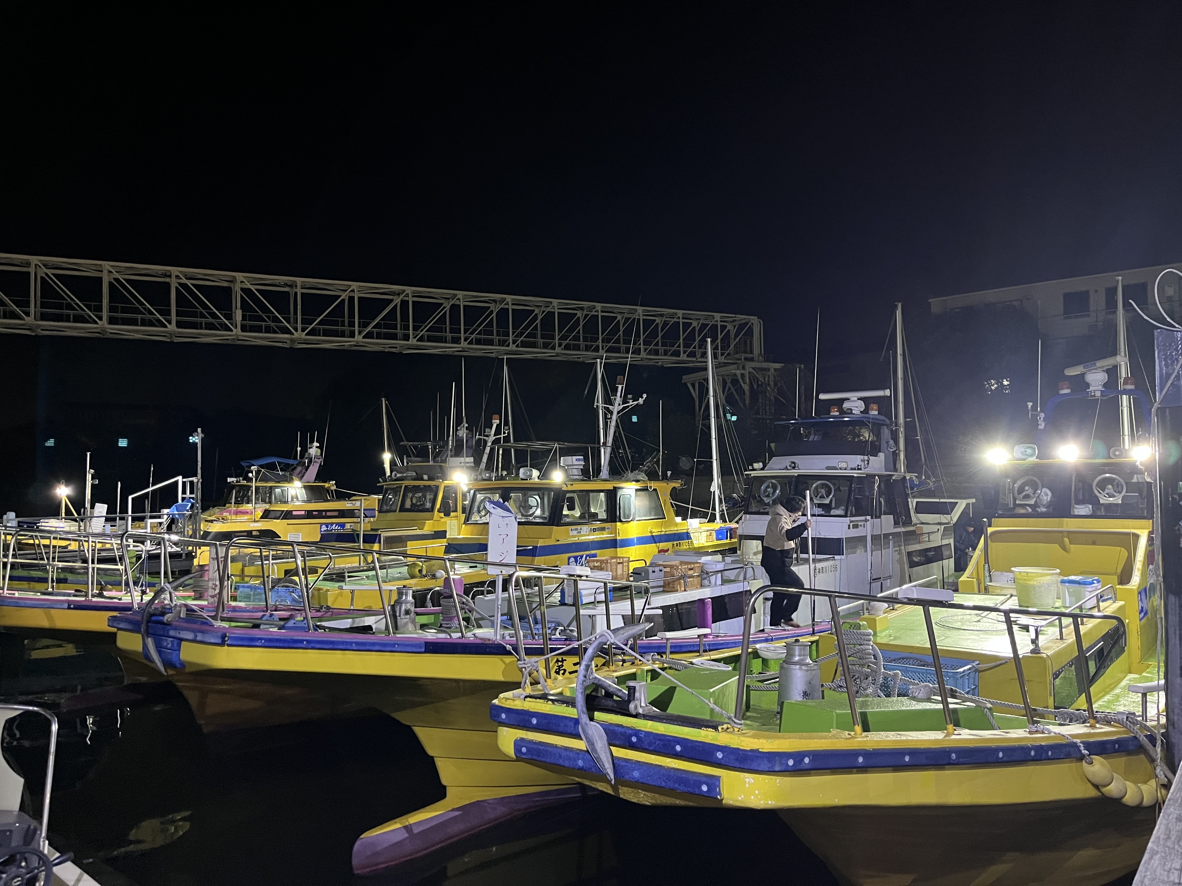朝まだ夜明け前に船宿に到着し受付をして乗船、釣座は先着順、係の人により決められていきます