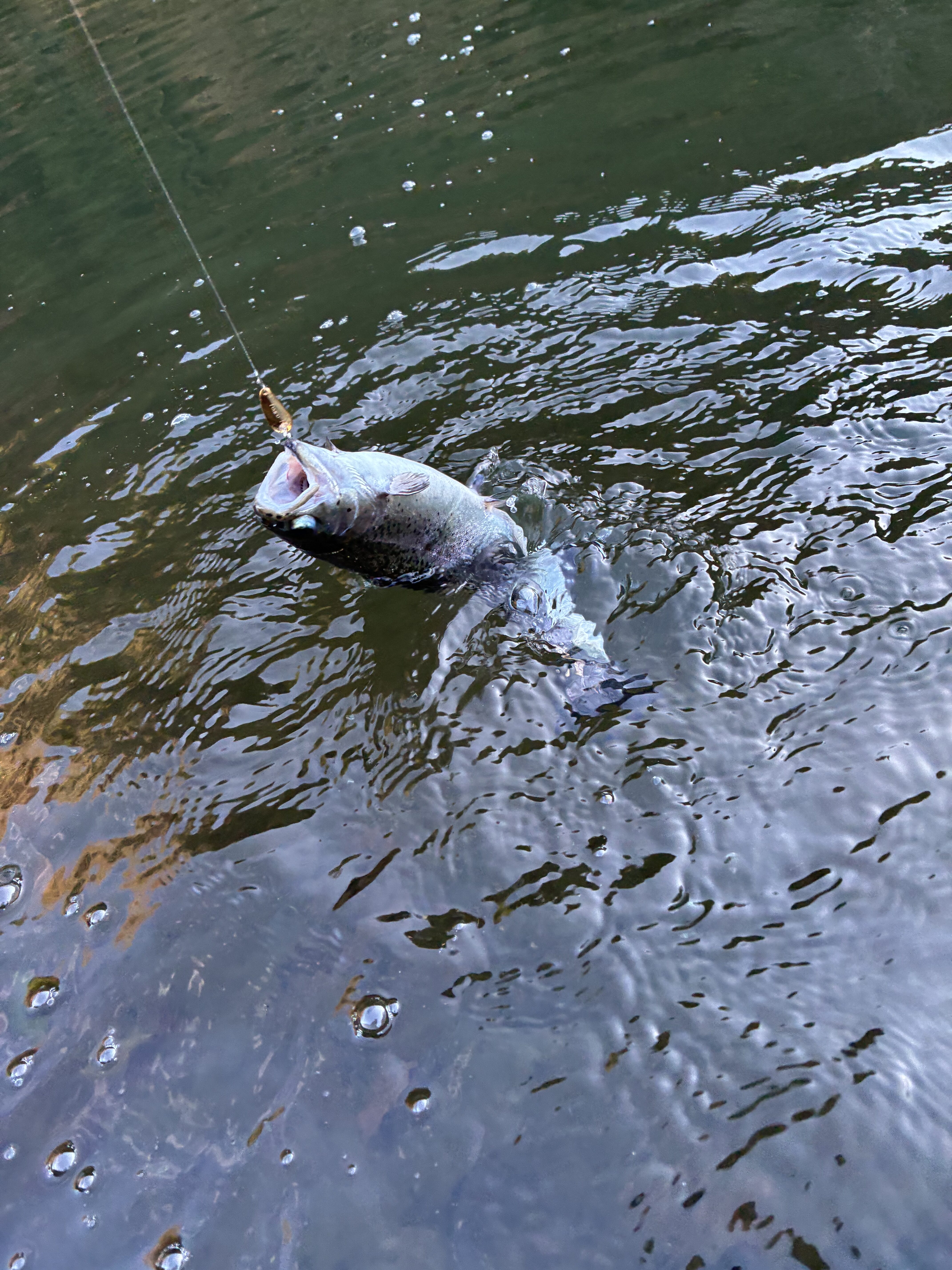意外と水深もあってどうやら魚は下の方に溜まっている模様!下の方に居る魚を取るためボトムプラグを投げますが、藻がすごくプラグでは釣りにならない状況のためスプーンでボトムを探っていく事に!