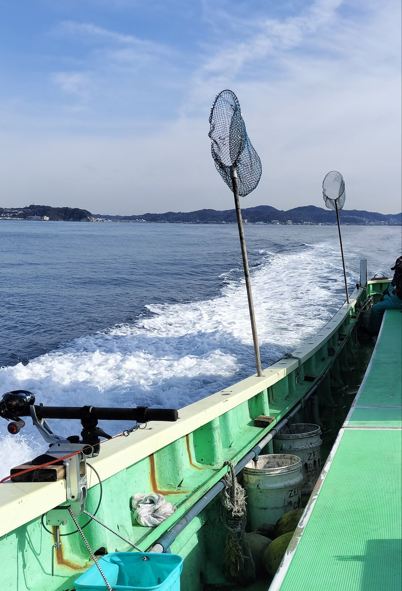 昼頃からシケ気味になりそうとの予報のせいか、4隅のみ4名の大名釣り状態で6時20分頃に出船(自分は最後に空いていた右舷ミヨシに着座)。