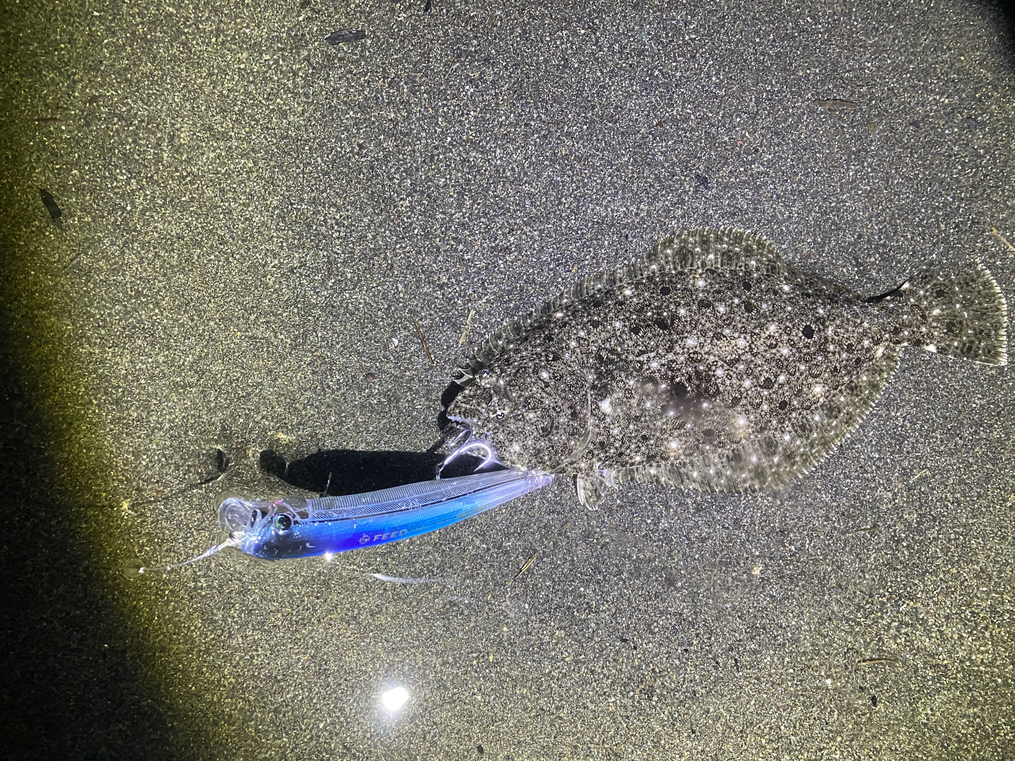 河口はベイトも入っており雰囲気マンマン!シーバス狙いに変更してタックルハウスのフィードシャロー128を投げていると、微かな当たりが⁉️