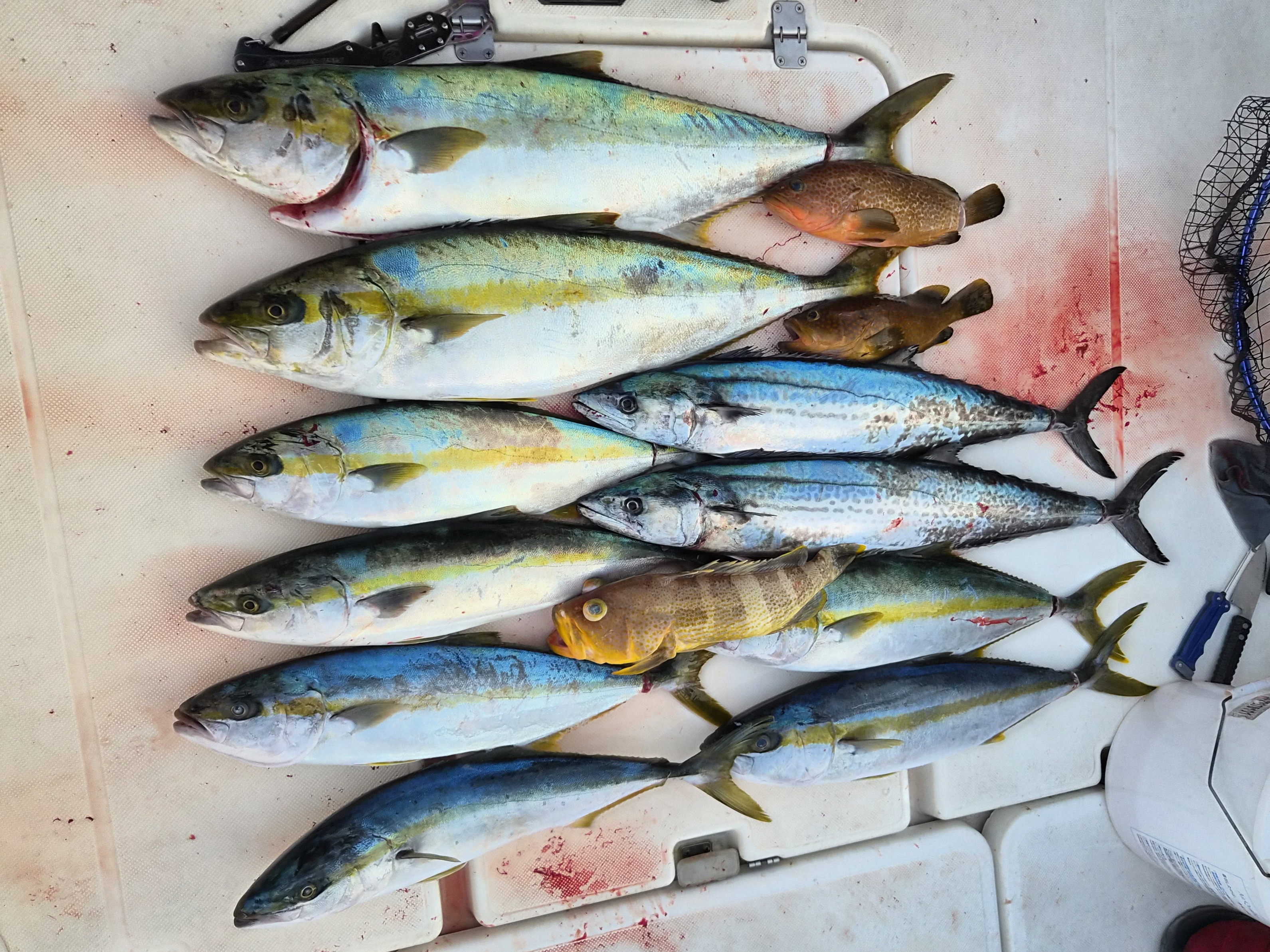 2026.01.21 印刷する 五目ジギングタイラバ@小浜 魚種 ヒラマサ 数 キジハタ×2 カサゴ×1 アオハタ×1 ヒラマサ×2 サワラ×1 釣り方 ☆ジギング ☆タイラバ 場所 中部 福井県 スタッフ 吉田 店舗 中部 岐阜店 釣行日 2026.01.16 コメント こんにちは岐阜店スタッフ吉田です 1月16日、福井県は小浜市よりプレジャーボートでジギング・タイラバを楽しんできました 小浜湾内〜湾口周辺、水深は20〜60m程度 今回はいろいろな魚を狙いたかったので、まず朝イチはお土産釣りでタイラバ 岩礁帯を流していくとすぐに反応があり、キジハタをゲット その後も同じところを流し直すともお1匹キジハタに、かわいいカサゴちゃん(リリース) 3匹とも〚タナジグ あいや〜タコカーリー〛が活躍してくれました ジギングをしていた本日の船長さんは、ヒラゴをキャッチしていましたよ ポイントを変えて、次は私もジギングで青物狙い 中層までシャクり、フォールをさせると糸がピタッと止まったのでフッキング すごく青物感のある喰い方でしたが、あがってきたのはまさかのアオハタでかい!! シービーワン C1ロングライド 110g 赤金にて いい反応が入ると船中全員ヒット! 私もヒラマサとヒラゴをキャッチ シービーワン C1ロングライド 110g 赤金でヒラマサシービーワン C1 100g 緑金でヒラゴ その後また強烈な反応入るとサワラがヒット!ドラグを緩めに設定して無事キャッチできましたヒットルアーはシマノTGガトリング 80g ピンクフラッシュYOKOHAMAにて 3人での釣果はこちらっ! とっても楽しめました! 使用した釣具 ロッド ①ダイワ 紅牙MX②シマノ グラップラー リール ①ダイワ 紅牙②シマノ オシアコンクエスト ライン ①PE0.8号②PE1.5号