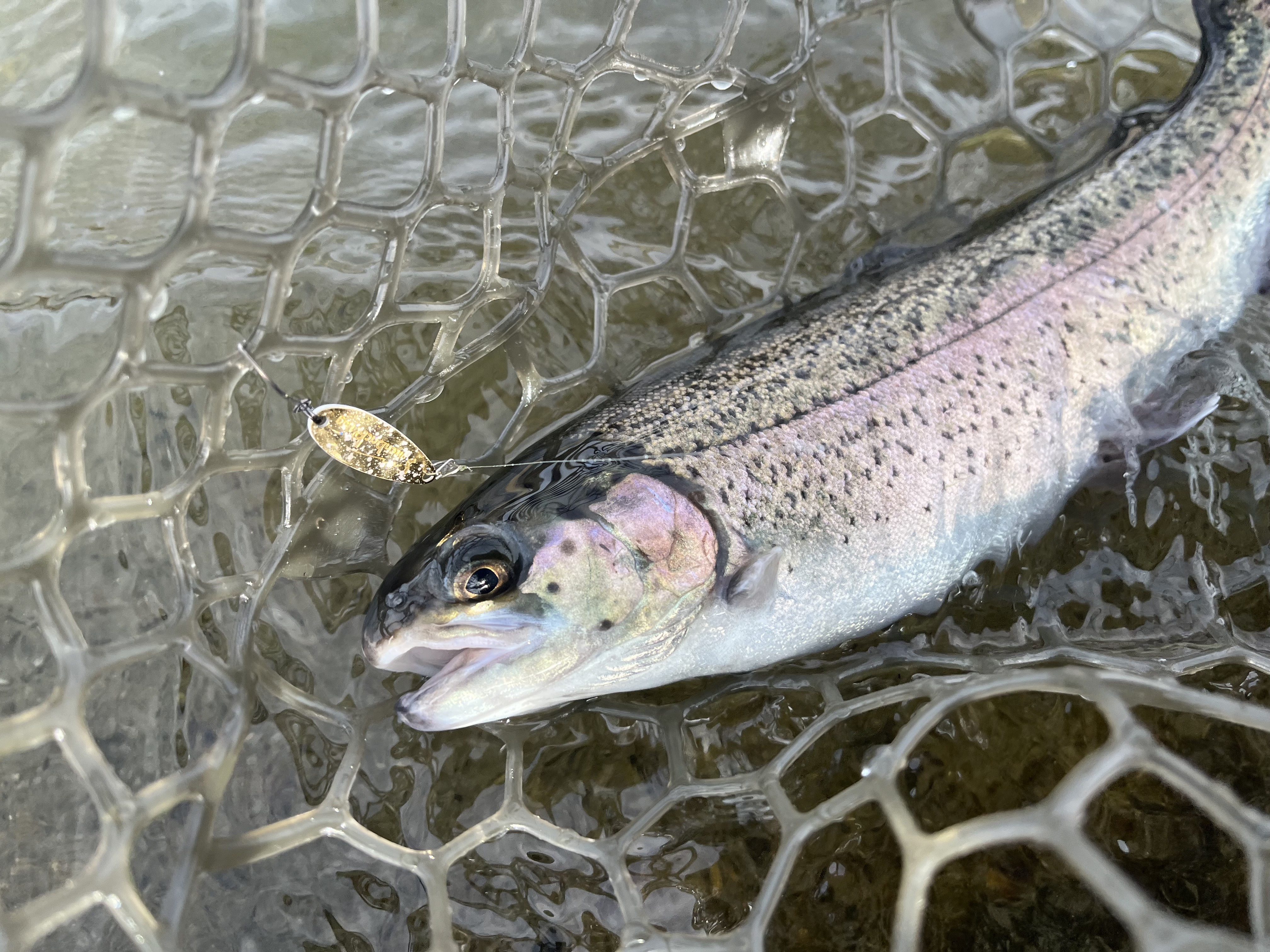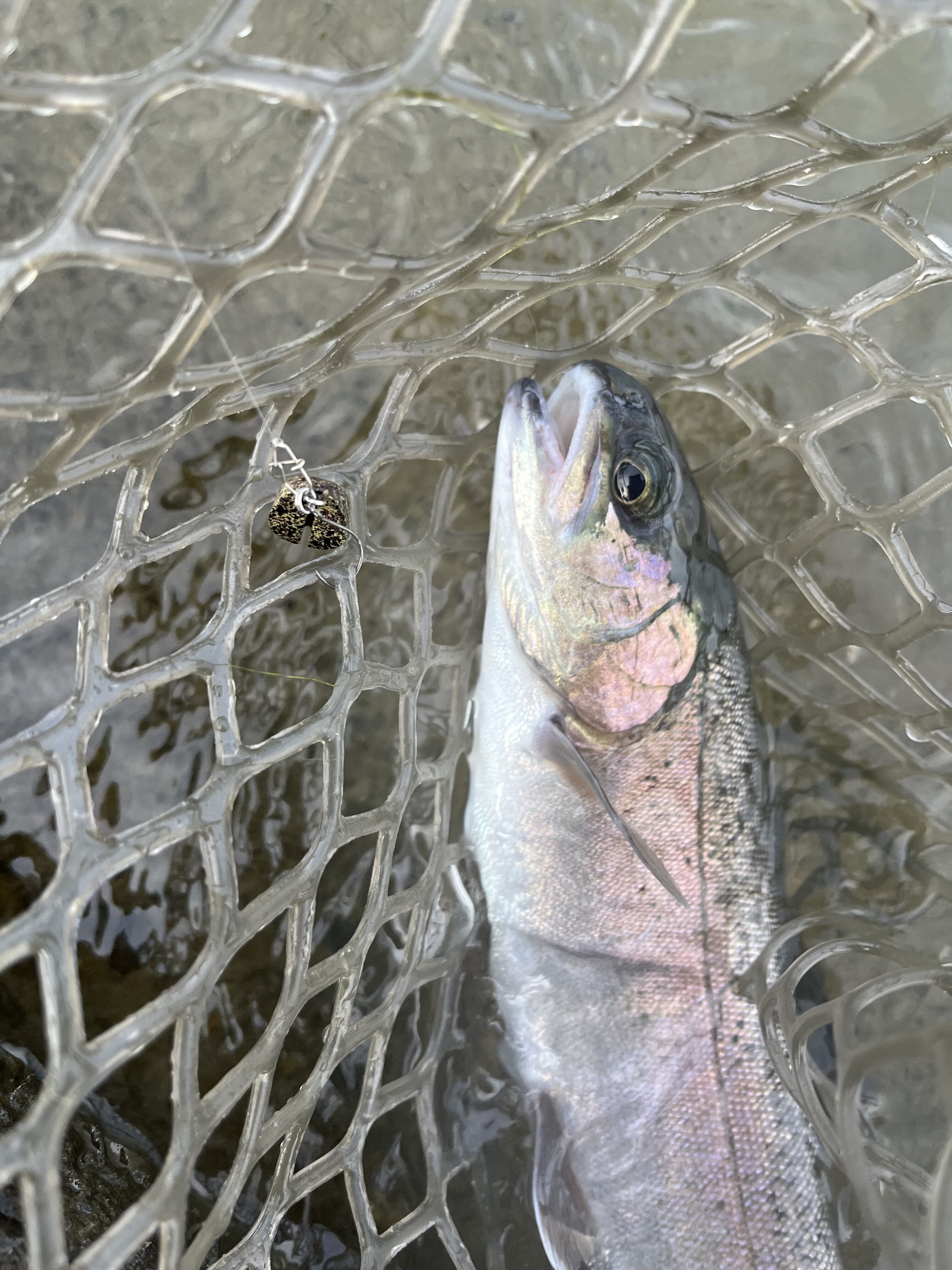 その後はライズしている魚が見えたのでポッピンバグを放置して1尾追加、グロー金カラーの有効性の確認でデイジー1.3gのグロー金を投入して1尾で終了!