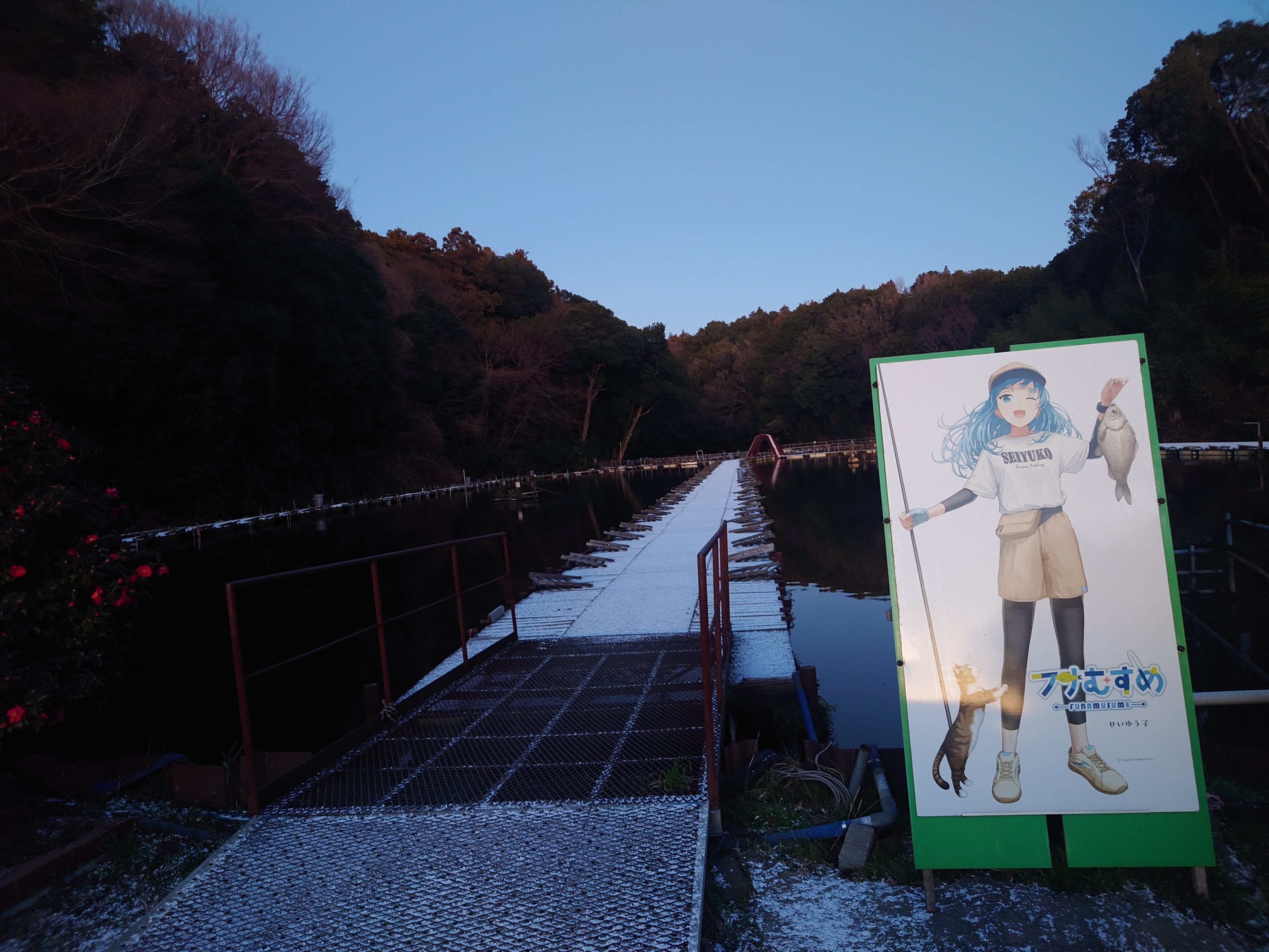 夜中に雪が降っていたらしく、駐車場に着くとあたり1面真っ白でビックリ!桟橋も雪が残っててめちゃくちゃ寒そう……