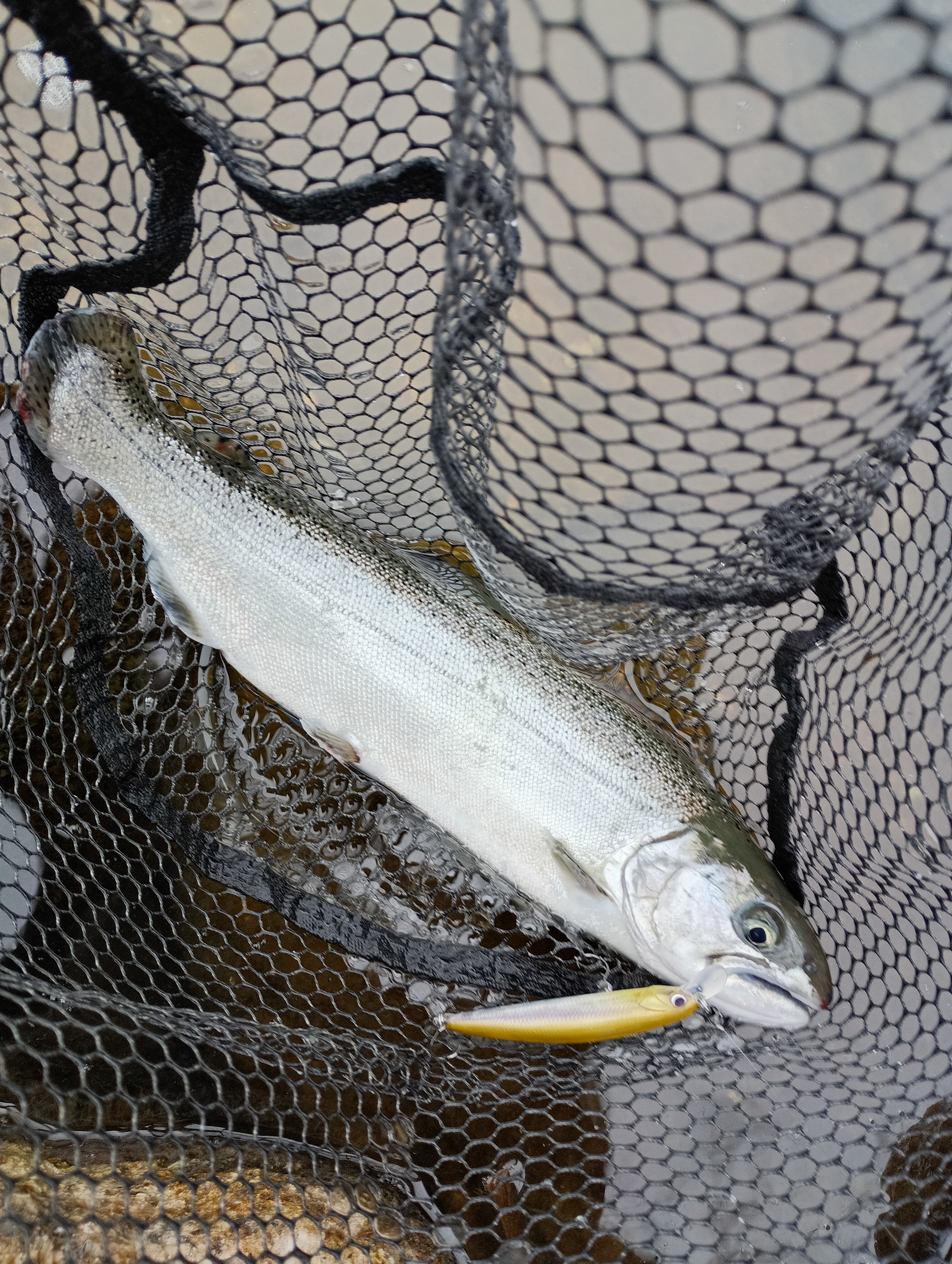 2026.02.02 印刷する 高島の泉でエリアトラウト4 魚種 サクラマス ニジマス/レインボートラウト サイズ 40cm級 数 ニジマス・サクラマス 約25匹 釣り方 ☆エリアトラウト 場所 滋賀県 天候 雨時々雪 スタッフ 松田侑也 店舗 京都 伏見店 釣行日 2026.01.28 コメント 滋賀方面に用事があった為、滋賀県の高島の泉に釣行してきました。 釣り場に8時頃にエントリー。 天気予報では曇り予報でしたが、雨・雪が振る状況。 今回もサクラマスやイトウねらいで、前回調子のよかったOSPのドゥルガ73SPやジャクソンのメテオーラなど試していくも、イマイチ反応が悪い。 ポツポツと釣れるものの、連発せず。 クランクやスプーンも試すもこちらも今一つ。 周りでもあまり釣れていないので、全体的に活性も低そう。 高島の泉は基本表層で良く釣れるパターンが多いので、あまりボトム狙わないのですが、サーキットバイブのトラウトチューン使ってみて反応探っていくと反応あり、ニジマス中心にポツポツ釣れたのですが、サーキットバイブのフォールにサクラマスが好反応示していたので、表層をジャークするとワインドの様にスライドするので、それで興味を示させ、フォールで喰わせるパターンでようやく連発。 一日通してかなり渋い日でしたが、25匹程釣れた所で納竿時間となりました。 伏見店ではエリアトラウト用品も取り揃えておりますので、釣行前に是非お立ち寄りくださいませ。 使用した釣具 ロッド ダイワ プレッソ61UL-SVF、シマノ カーディフ70L リール ダイワ プレッソ1003、シマノ ツインパワー2500S ルアー メテオーラ52、イーグルプレイヤー50スリムGJ、ソウルシャッド45SP、ドゥルガ73SP等々
