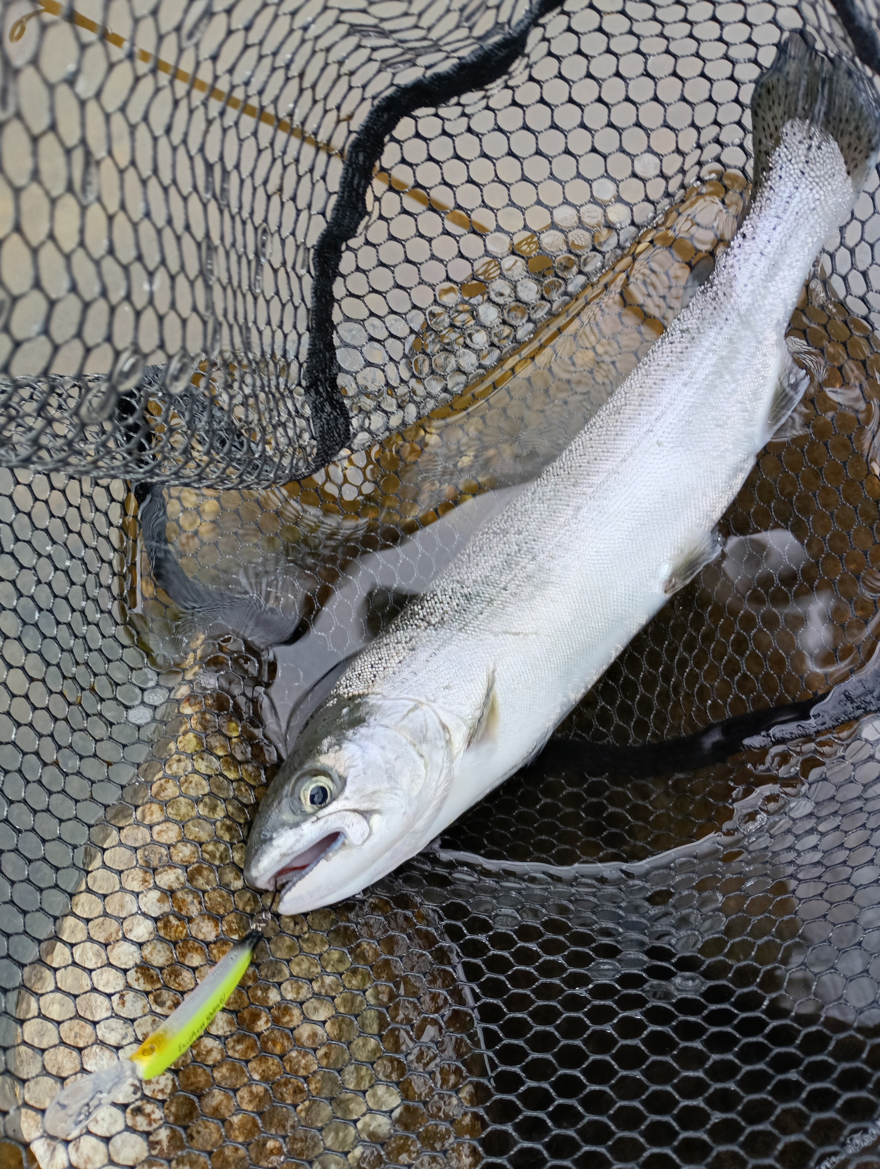 高島の泉は基本表層で良く釣れるパターンが多いので、あまりボトム狙わないのですが、サーキットバイブのトラウトチューン使ってみて反応探っていくと反応あり、ニジマス中心にポツポツ釣れたのですが、サーキットバイブのフォールにサクラマスが好反応示していたので、表層をジャークするとワインドの様にスライドするので、それで興味を示させ、フォールで喰わせるパターンでようやく連発。