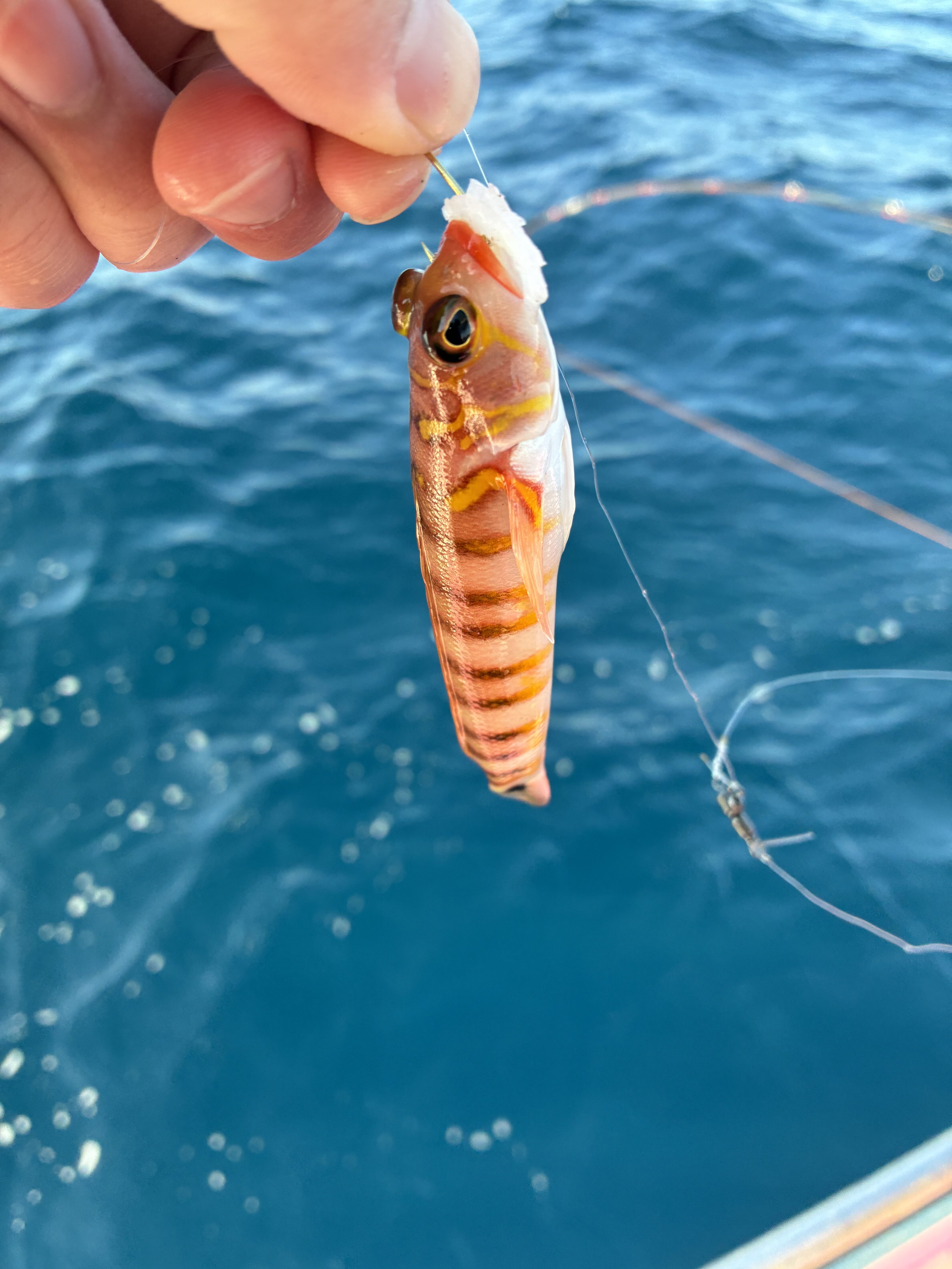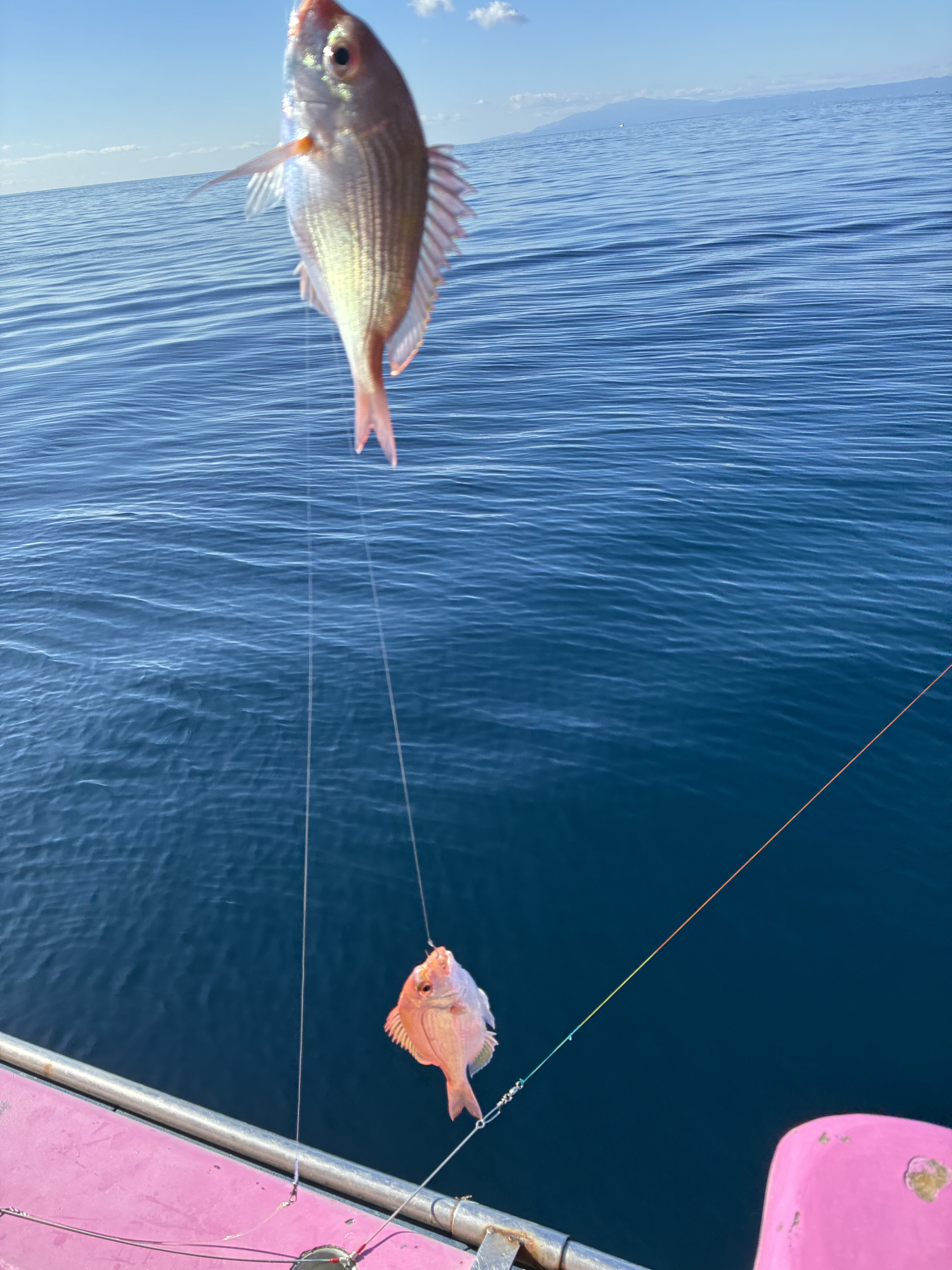その後、一緒に行っていた方も40cm越えのアマダイをゲット!しかしここから苦戦モードに、、今まで誘い上げ等で出ていた外道のアタリも出ず、オキアミの頭が残って帰ってくるようになります、、そして終了間際、安定のトラギスを釣って終了としました!