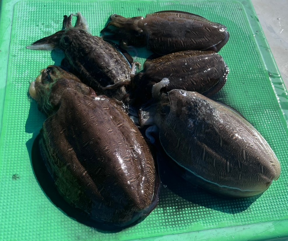 本命のアオリイカは澄み潮のせいか姿を見せず。コウイカ系はモンゴウイカのみで0〜5杯、船中7名で12杯でした。