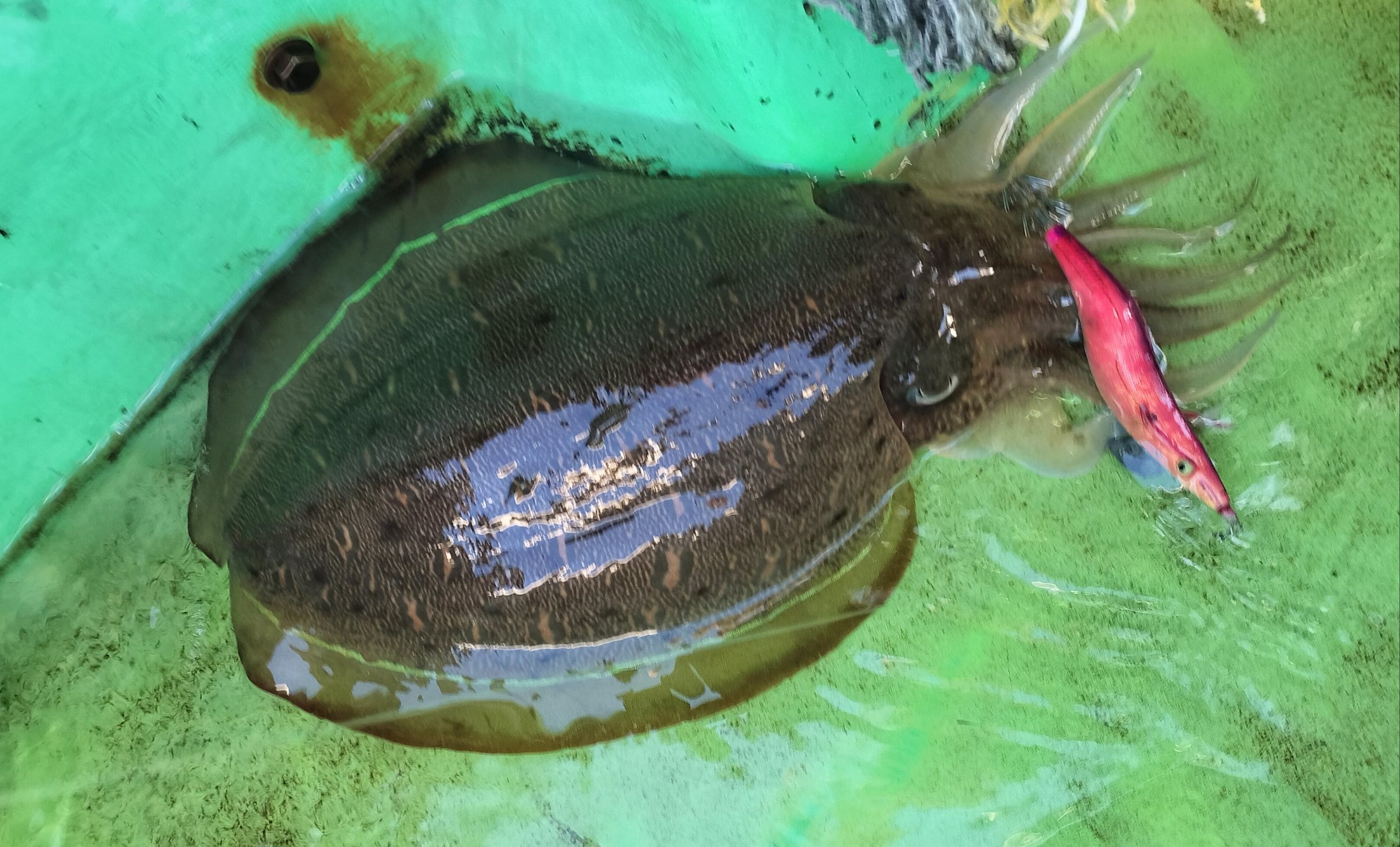 その後も10時過ぎまでモンゴウイカ狙いを続けて自分が良型を含む3杯を追加、左舷トモ氏が2杯を追加したタイミングでアオリイカ狙いに戻る。