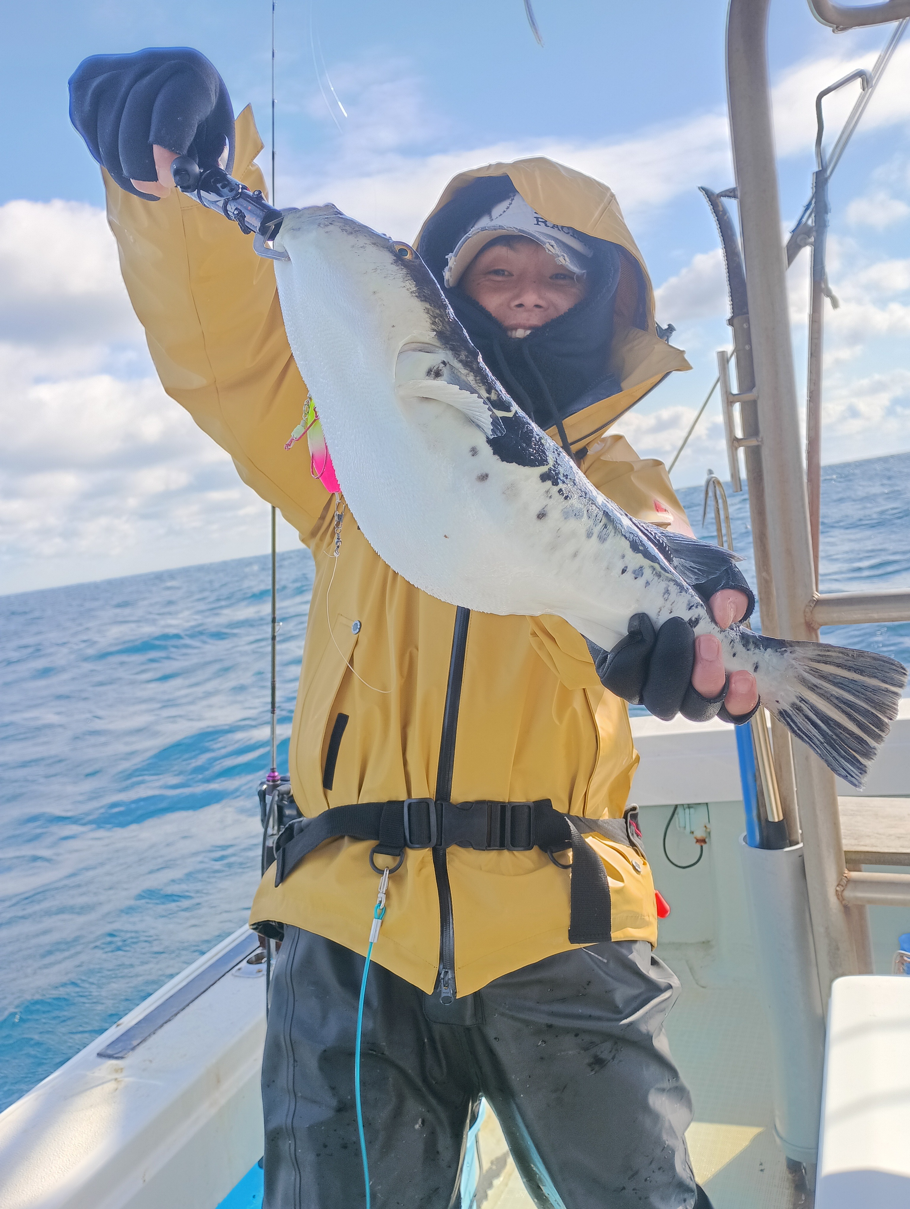 2026.02.03 印刷する 初めてのトラフグ便♪ 魚種 フグ サイズ 50センチ 数 サメ/1匹 釣り方 ☆カットウフグ 場所 三重県 天候 晴れ スタッフ 平川葉子 店舗 堺店 釣行日 2026.01.31 コメント 今日は三重県鳥羽市の魚勘丸さんにお世話になり、初めてのトラフグチャレンジに、堺店のお客さんとやってきました 名阪国道は所々脇に雪が残っているところもあり少しビビりましたが 深夜、魚勘丸さんに到着。 旅館で名簿を書いたり船代を払ったりして車で港へ。 気温は1℃。かなり冷えます。船で走ると寒いですが餌のイワシを切ったり準備をしていると気持ちが高ぶります♪ 堺店のお客さん3人と平川の4人で乗り込み、他には私達を含めて10人ほど乗船されてます さすが三重県。富士山もチラッと見えていました! 40分ほど船で移動しポイントへ到着。 仕掛けはカットウフグとは違い、60号のオモリの上にオフセットフックのハリが3本付いたのをセットして、針にイワシの切り身や、アルゼンチン赤エビなど付けます 潮が速い時はこの仕掛けの上にカットウシンカー20号を付けるそうです。 60号で底が取れるため、そのままで始めます 仕掛けを落として40mほどの水深で誘います 船中は誰も当たらず静かです 1時間ほど誘っていると、アタリ! 結構な引きです…必死で巻き上げると50~60センチのサメ(笑) 残念… 気を取り直してまた仕掛けを入れます 船中は静かなまま。 すると30分ほどしたら堺店のお客さん(この方も初めてのトラフグ)にアタリ! 皆さんは「サメかー?サメちゃうのー?」と はやし立ててましたが、あがってきたのはドデカイ、トラフグ!! 船中、大盛り上がり(笑) 俄然、やる気になりました(笑) 船を何度か移動させて流し直し、お昼になるかというところで もう一人の堺店のお客さん(この方も初めてのトラフグ)にアタリ! カメラを用意して上がってくるのを待ってると これまた、ドデカイ、トラフグ! すごーーーい!! 残り時間も頑張りましたが、私はサメのみでした(笑) 船中、堺店のお客さん二人の釣ったトラフグ2匹のみと、厳しい結果でしたが 捌かれて手渡された身の入った袋はかなり大きく…てっちりで食べれるように捌かれています 皮も湯引きに出来るように小分けされています いやぁ…羨ましい♪天然のしかも2キロに迫るドデカイ、トラフグ! 夢がある♪ 釣れなかった堺店のお客さんは「リベンジに行く!!」と、おっしゃってました。 堺店では、トラフグ仕掛けを豊富にご用意。また、トラフグ釣りに精通したスタッフも常駐しています。 そして、堺店主催の釣行会もご準備しておりますので ぜひ気になる方はお立ち寄り頂き、お気軽にスタッフにお尋ねください お待ちしております 使用した釣具 竿 シマノ サーベルマスター リール シマノ オシアコンクエスト200HG