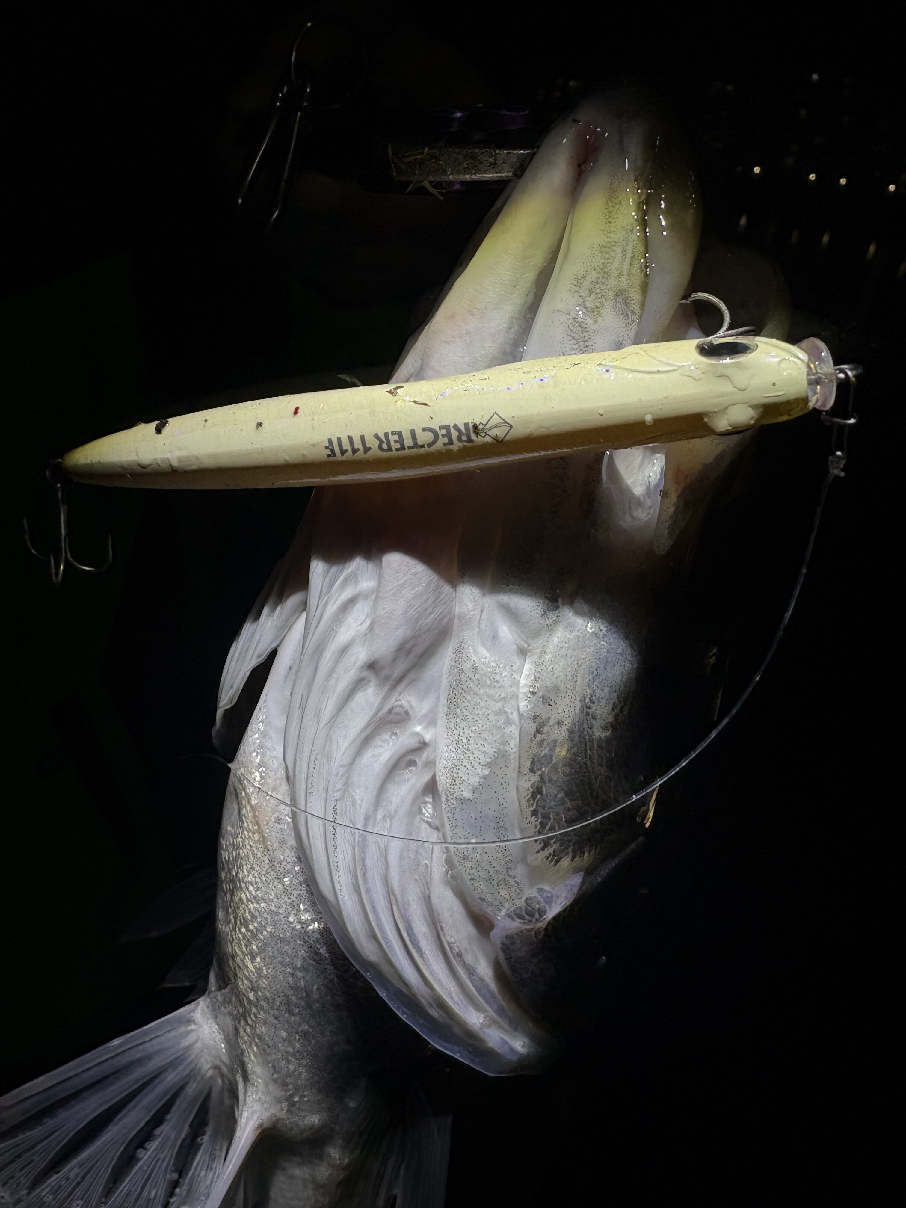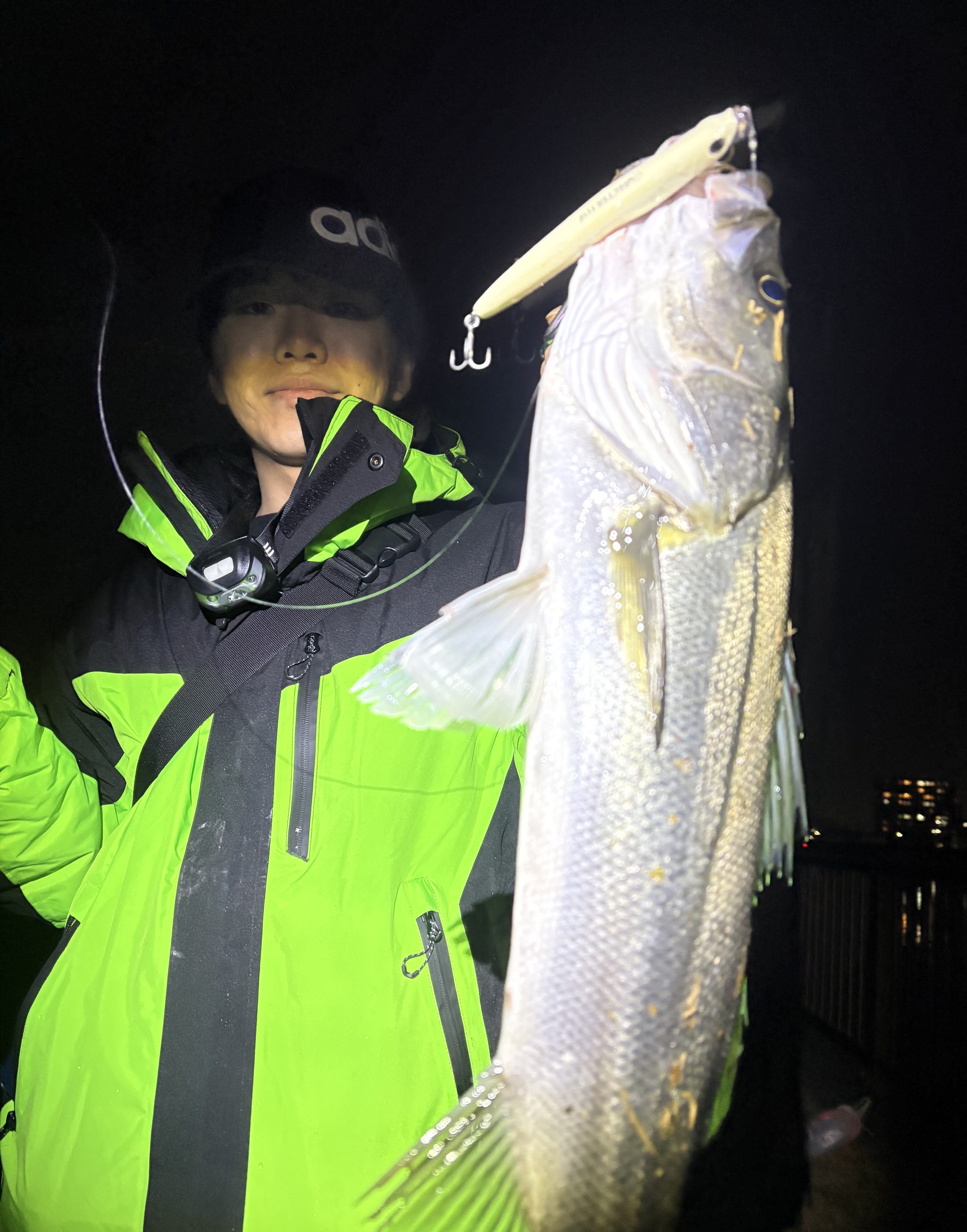 2026.02.09 印刷する 午夜のバチ合わせ 魚種 シーバス/スズキ サイズ 70cm 数 シーバス1匹 釣り方 ☆シーバス 場所 関東 東京都 天候 晴れ スタッフ 碇山篤志 店舗 関東 柏店 釣行日 2026.02.05 コメント こんばんは碇山(いかりやま)です スタッフ5人でバチ抜け開幕戦に行ってきました 早めにポイントに着き準備を進めその時を待つ 日没を迎え、まだ上げ潮だが少しずつ流れが緩んできた 無風に緩む流れまだ抜けないバチ そこでマニックスロー135を遠投し少し沈めゆっくり引いてくると待望のヒット! 激戦区でのファーストヒットいを頂き、サイズも70cmといいサイズ マニックはバチパターンでは最も信頼をおけるルアーで飛距離も出て使いやすくとにかく釣れます! 今回は初めてマニックスローを使いましたが、流れやレンジで使い分けれるので攻略の幅がさらに広がりそうです その後ようやくポツポツとバチが抜け始め水面にも反応が出始めた するとスタッフ郡上くんにもヒット レクター111Fにヒット 潮が止まりバチが浮き始めフローティングでの表層狙いが良かった様子 さらに続けて周りでヒット&バラシもありこれからか?と思われたが、逆にバチが多く抜けすぎて釣りづらく魚の反応もなくなってしまい、潮止まり前後の短い時合がチャンスタイムだった様子 まだまだ夜は寒いので防寒対策と温かい飲み物もあると集中力を維持出来るので短い時合を逃さず集中して釣りましょう 使用した釣具 ロッド Gクラフト セブンセンス ミッドナイトジェッティMJS-932-LR リール シマノ ステラ3000MHG+PE0.8+フロロ16lb. ルアー マニック135スロー、マニック135、115、スウォーム130