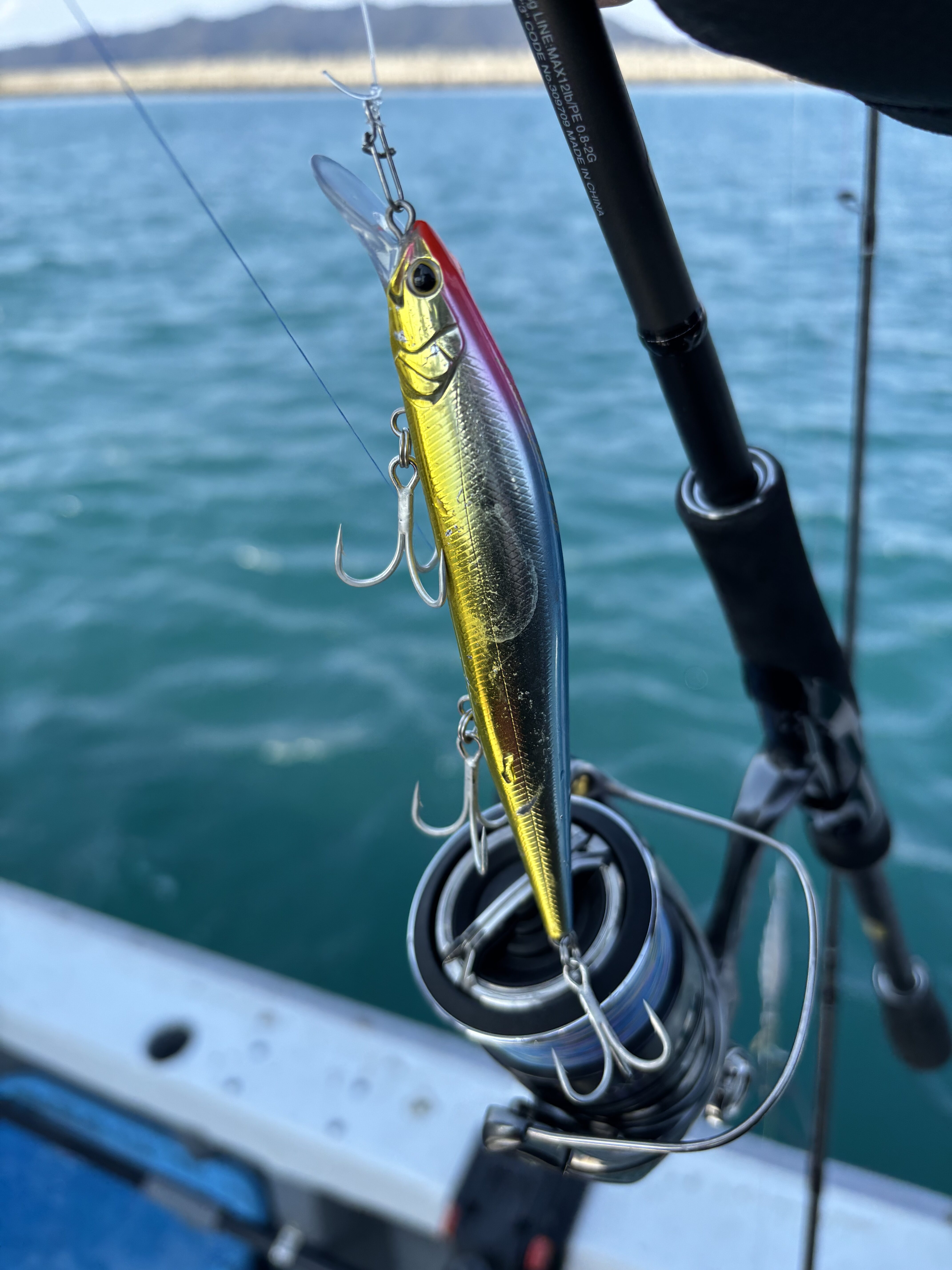 当日はオシア ラウドジャーク120SとオシアMDザンバーノ115Sの2ルアーを使用。同じジャークベイトながら、ラウドジャークはシャロー〜中層、ザンバーノは約2mレンジまで入るため、状況に応じた使い分けが有効でした。実際にラウドジャークで反応が途切れたタイミングでザンバーノにローテーションすると、ひったくるようなバイトがありヒットし、追加キャッチに成功。レンジ変化による反応の違いを実感しました。途中、煙樹ヶ浜沖でサワラ狙いのポイント移動もありましたが反応はなく、この日は湾内中心の釣果となりました。船長によると反応はあるものの食い渋る一日だったとのこと。例年3月頃まで狙える釣り物のため、今後も期待できそうです。