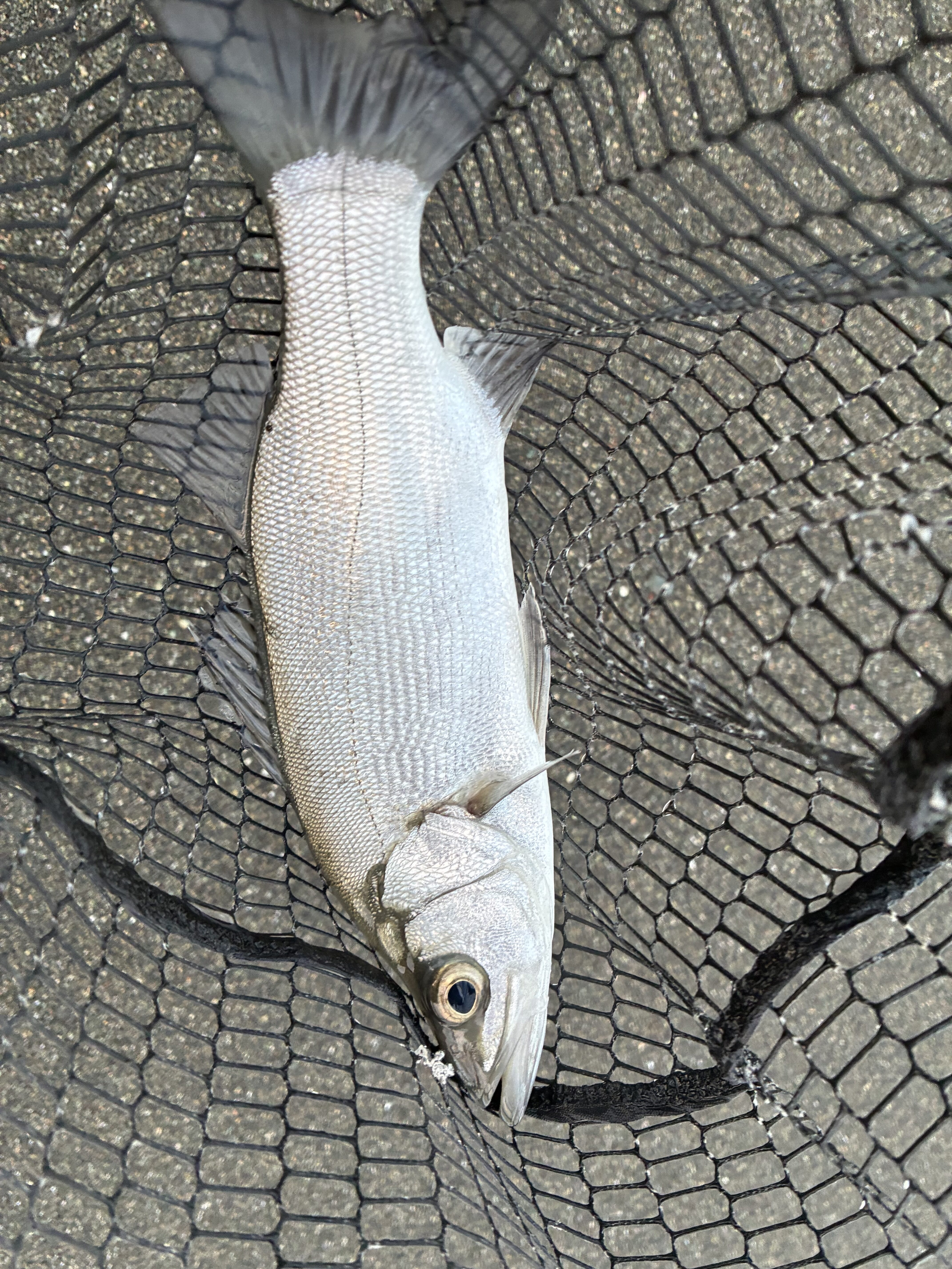 このタイミングで少し波も出てきたので、波打ち際のサラシが出るポイントを丁寧に撃っていく作戦に!するとガッと押さえ込まれる様なバイトが!すかさず合わせを入れます!サイズはそこまで大きく無いようですが上がってきたのはヒラセイゴ!ここまで5時間と少し、、報われました笑