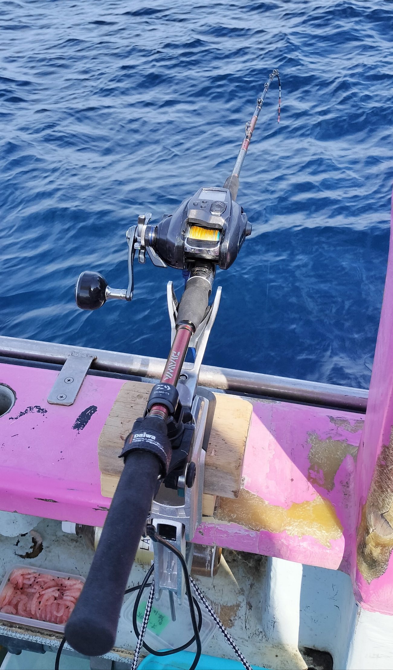 すると水深100m前後のポイントでポツポツとアカアマダイが姿を見せて自分も30センチの本命をゲットも、追加はあるものの適度に潮が流れている割にはアタリが乏しく船長は再び浅場に移動。