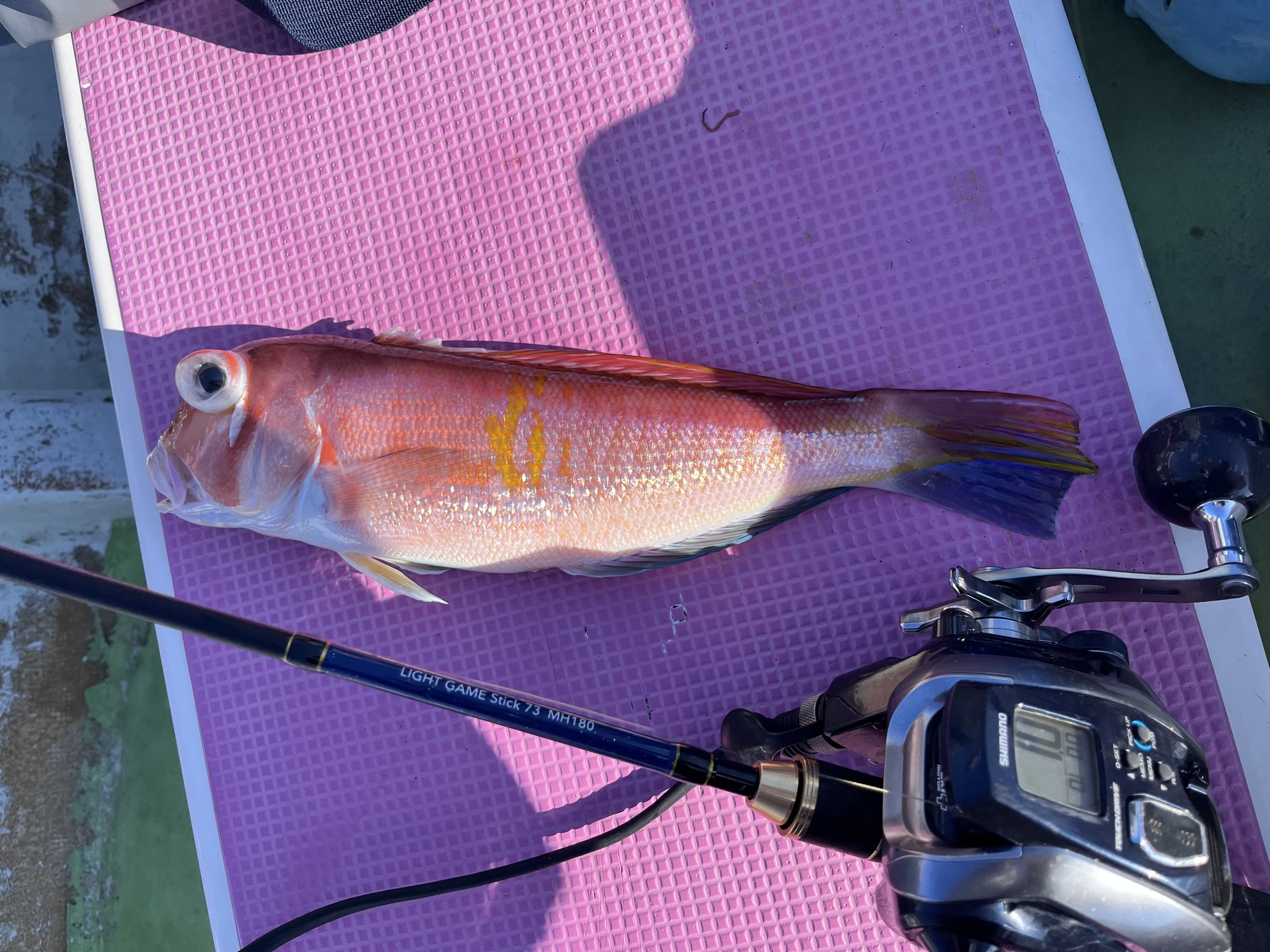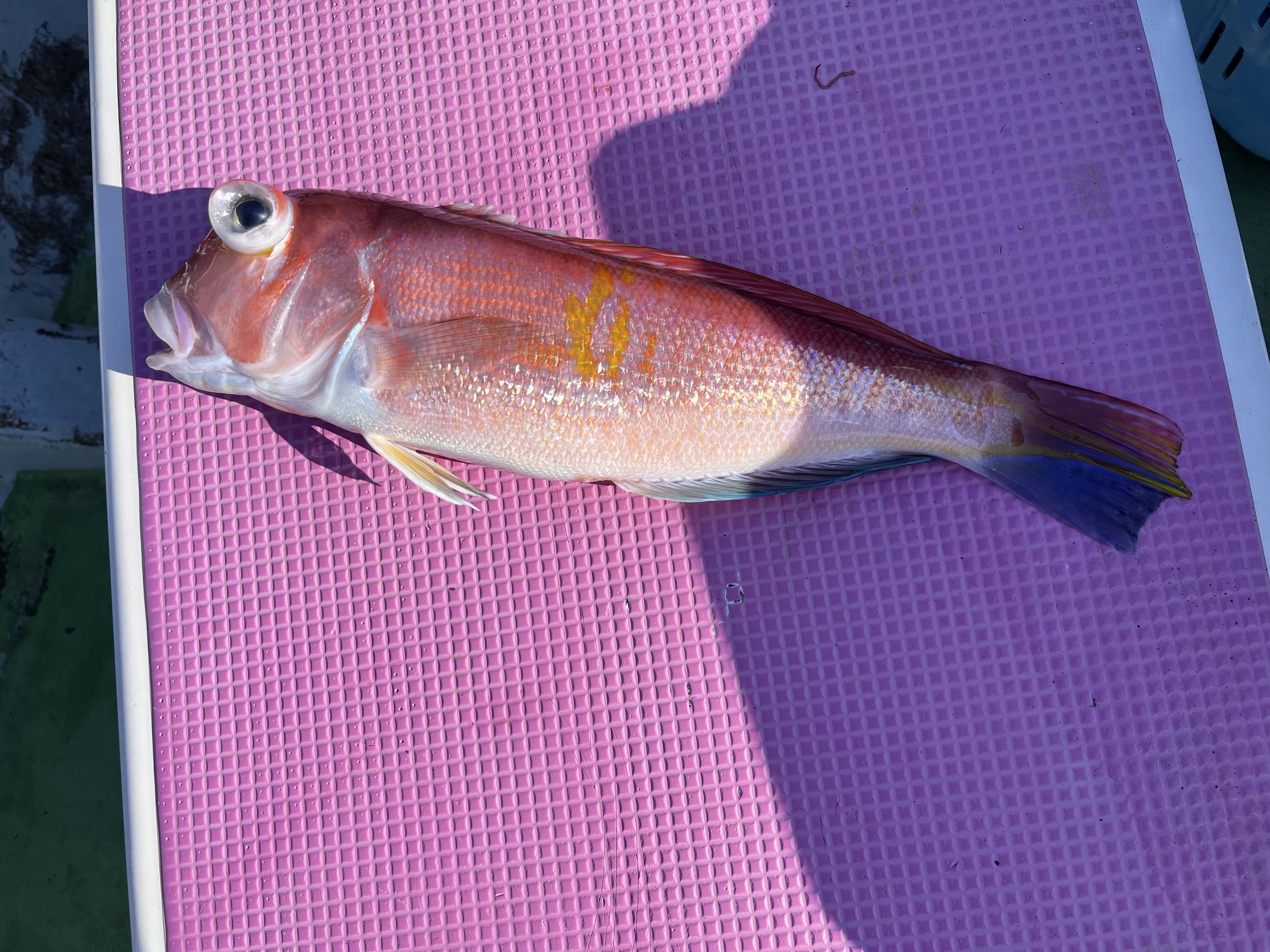 水深60mほど…セオリー通りに落として底トントン…1m浮かせて待つ…の繰り返し…船内どうやら大艫の方でフグの猛攻がありワイワイしております🤣艏の方はフグの被害はあまりなくひたすらにアタリを待ちますがなく…そして深場へと移動後…大艫川口さんが本命アマダイが釣れたのを見て良いなぁ〜と横目にしているとツンツンっとアタリ✨ググっと入り込んで合わせを入れて慎重に上げてみると本命ではなかったがお刺身で美味しいオニカサゴが釣れてとりあえず一安心😋1匹釣れると少し気が楽になり何度かの誘いを入れているとモゾモゾ?としたアタリがあり食い込むまで待って上げてみると本命30㎝程のアマダイ釣れましたー😊良かったです✨