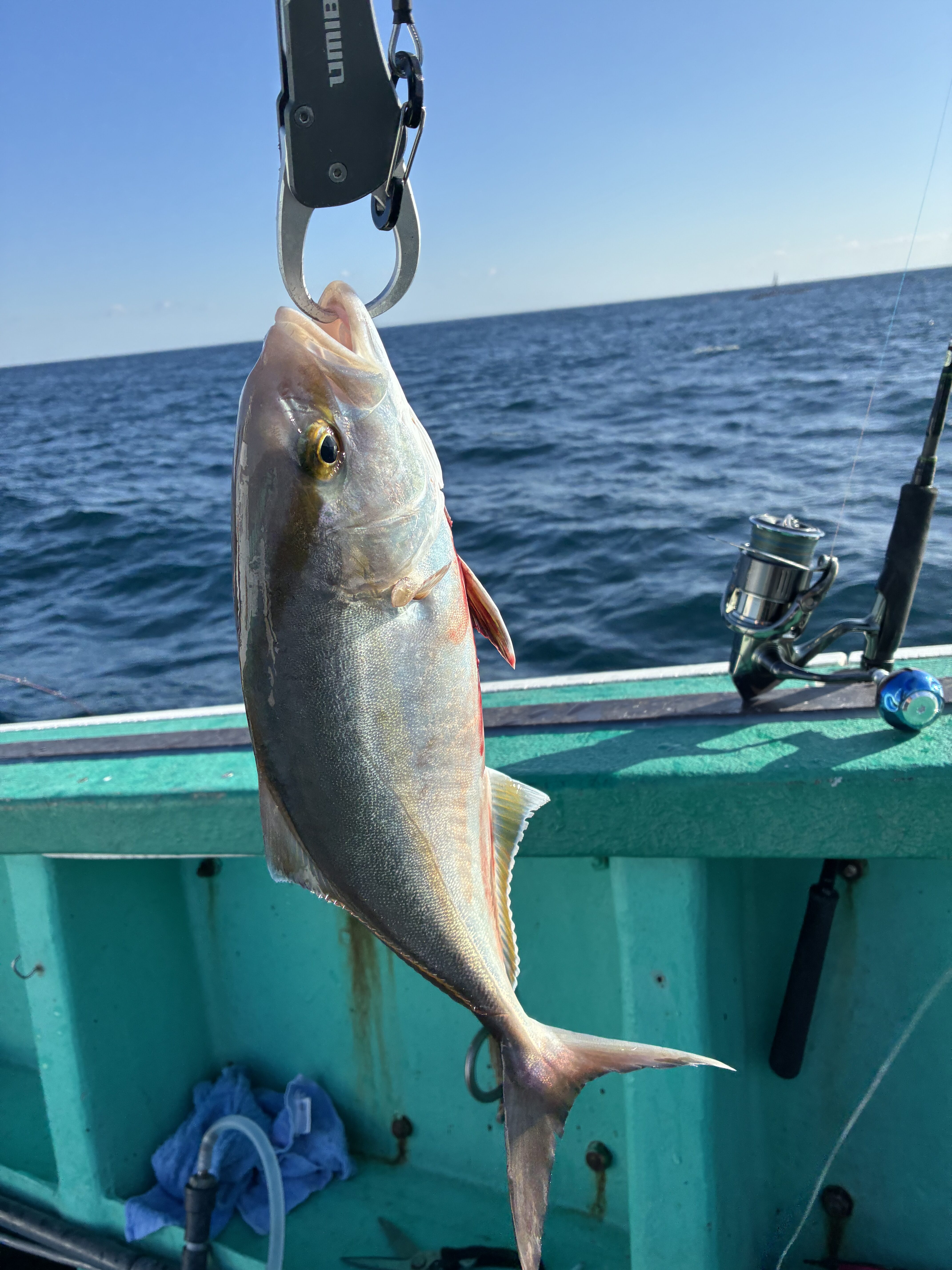 その後一旦港に戻り、午後のジギングの準備を済ませまた出船!いい反応につけて貰いますが中々口を使わず…こんな時こそ丁寧なしゃくりに意識するとグンッと重くなります!何とか3流し目ほどで船中1匹目のカンパチをゲット!