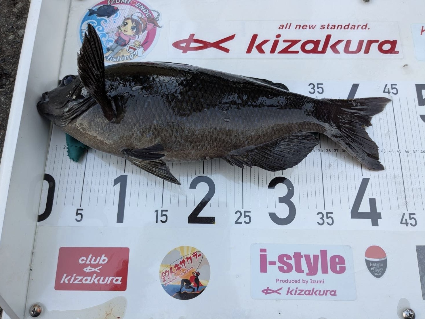 まずはキザクラ i-style beppin 0号ウキを使用し、ガン玉無しの全遊動仕掛けで足元を探ると、大型のアオブダイがヒット。その後、もう少し縦の釣りを意識し、i-style beppin ガンマG5にガン玉を打った半遊動仕掛けに変更。吸い込まれるポイントで良型グレ45cmを釣り上げることができました。自己新記録更新です!
