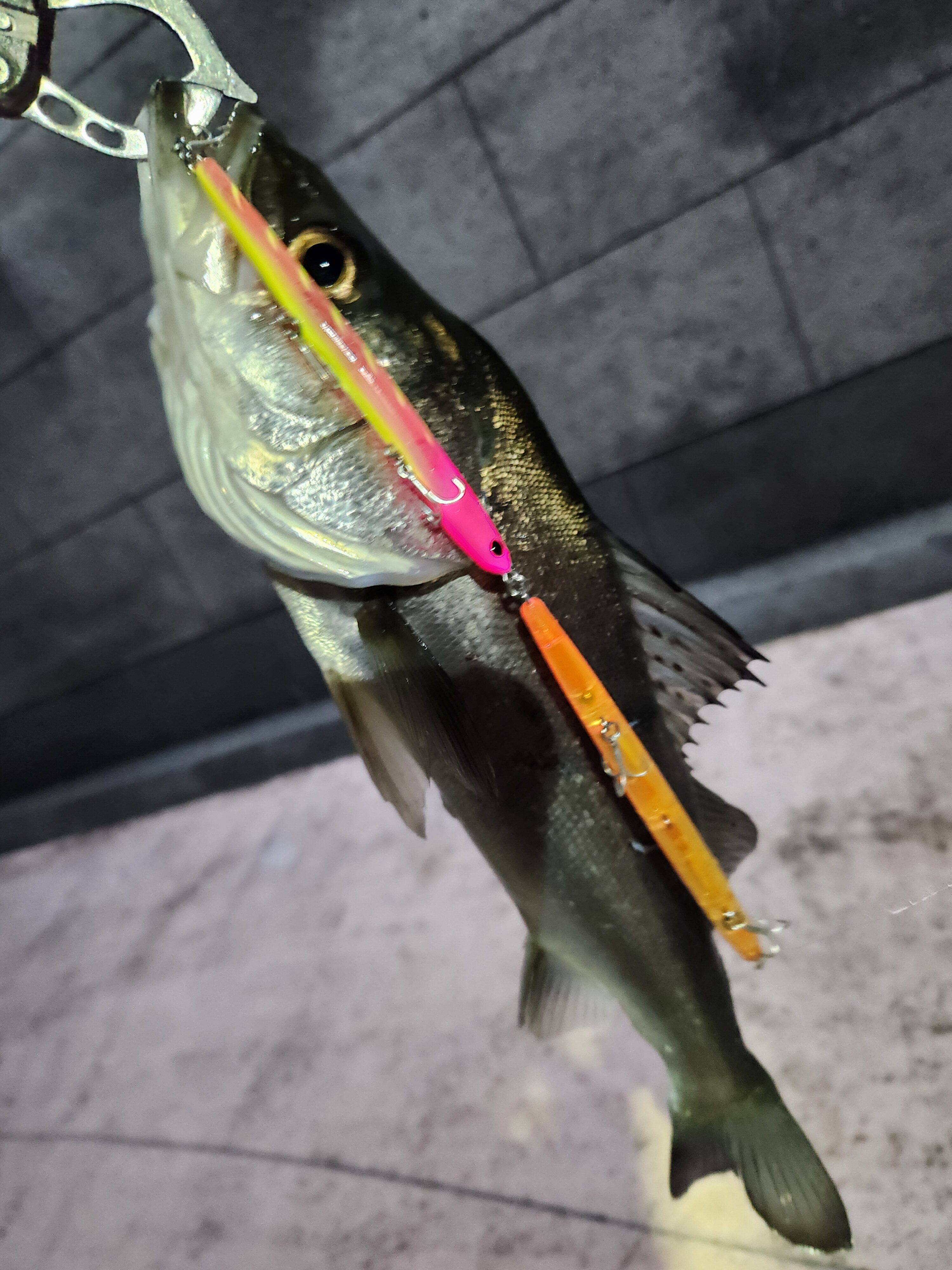 2026.02.24 印刷する バチ抜けシーバス!秘策は二連ルアー!? 魚種 シーバス/スズキ サイズ シーバス40cm前後 数 シーバス/1匹 釣り方 ☆シーバス 場所 東京都 スタッフ 恒松祐輔 店舗 埼玉狭山店 釣行日 2026.02.18 コメント 狭山店スタッフの恒松です! 先日、東京湾奥河川へバチ抜けシーバスへ行ってきました! 暗くなる直前にポイントへ着くと10m間隔で人が並んでおりなんとか空いている場所を見つけて釣り開始! バチが抜けすぎると魚がルアーを見つけてくれなくなり、バイトが少なくなるので、バチ抜けが確認できる前から釣り開始! はじめはスイッチヒッタースリムDHからスタート! 表層から底まで幅広く探るも反応無し。 しばらくするとバチが抜け始めたので、アピール力を上げるためにルアーチェンジ! フィール120と100を連結し、使用! 表層をゆっくりリトリーブするとグン!とヒット! 40cm程のセイゴですが、ゲット! その後はバチがかなり抜け始め、当たりはポツポツありますがヒットに至らずに終了。 アピール力を増した連結フィールが魚を釣れてきてくれました! 今年のバチ抜けはかなり調子が良いみたい!メーターオーバーの釣果も聞こえています! 2つのルアーを繋げるだけ!皆さんも是非フィールを連結させ、バチ抜けシーバス行ってみてください! 使用した釣具 ロッド ブリーデン 83ディープ リール 13セルテート2508
