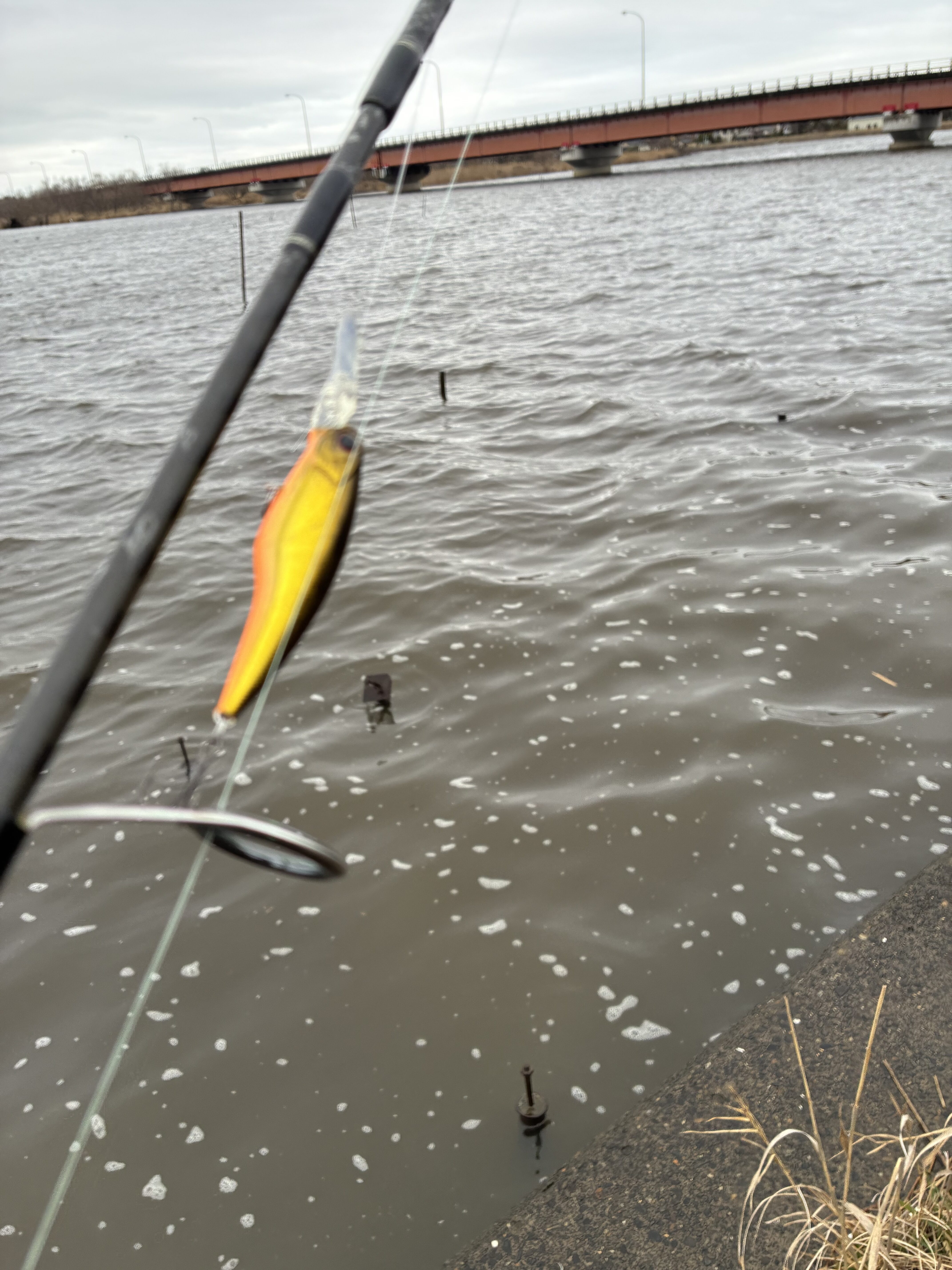 ベイトが寄っていればフィーディングしている個体が入るはずと考え、シャッドやミノー、スピナーベイトをテンポ良く巻いて広く探っていきます。気温はそこまで低くないものの爆風で体感はかなり寒く、防寒を強化しながら護岸際から少し沖まで丁寧にチェック。