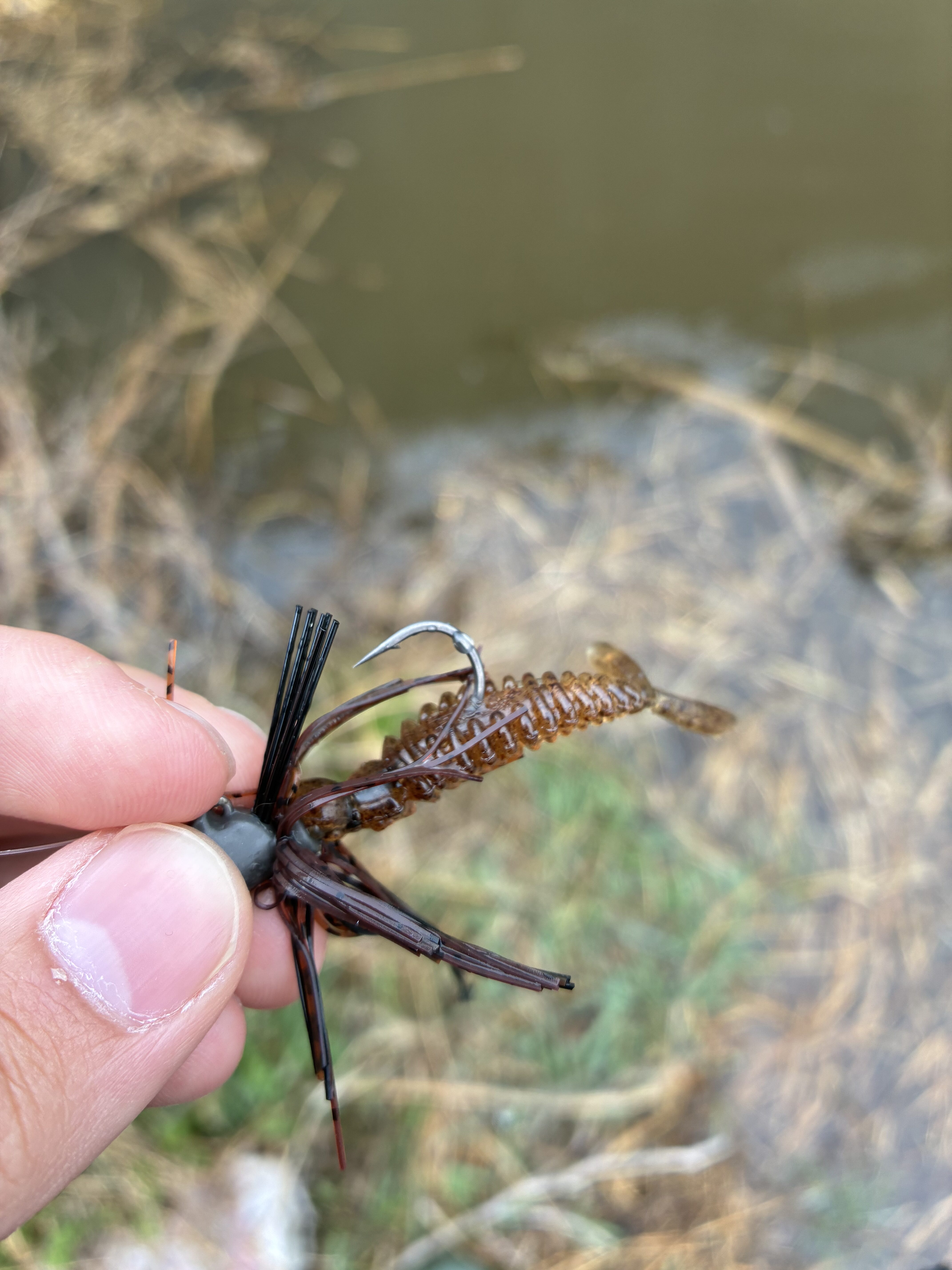 しかし反応は得られず、やはり簡単にはいきません。午後になるとさらに風が強まったため風裏へ移動し、スモラバでフローティングカバーをじっくりシェイクして低活性の魚を狙います。それでも無反応。最後は流入で巻き切りましたが結果は無念の敗北。霞ヶ浦水系の厳しさを改めて認識しました…笑