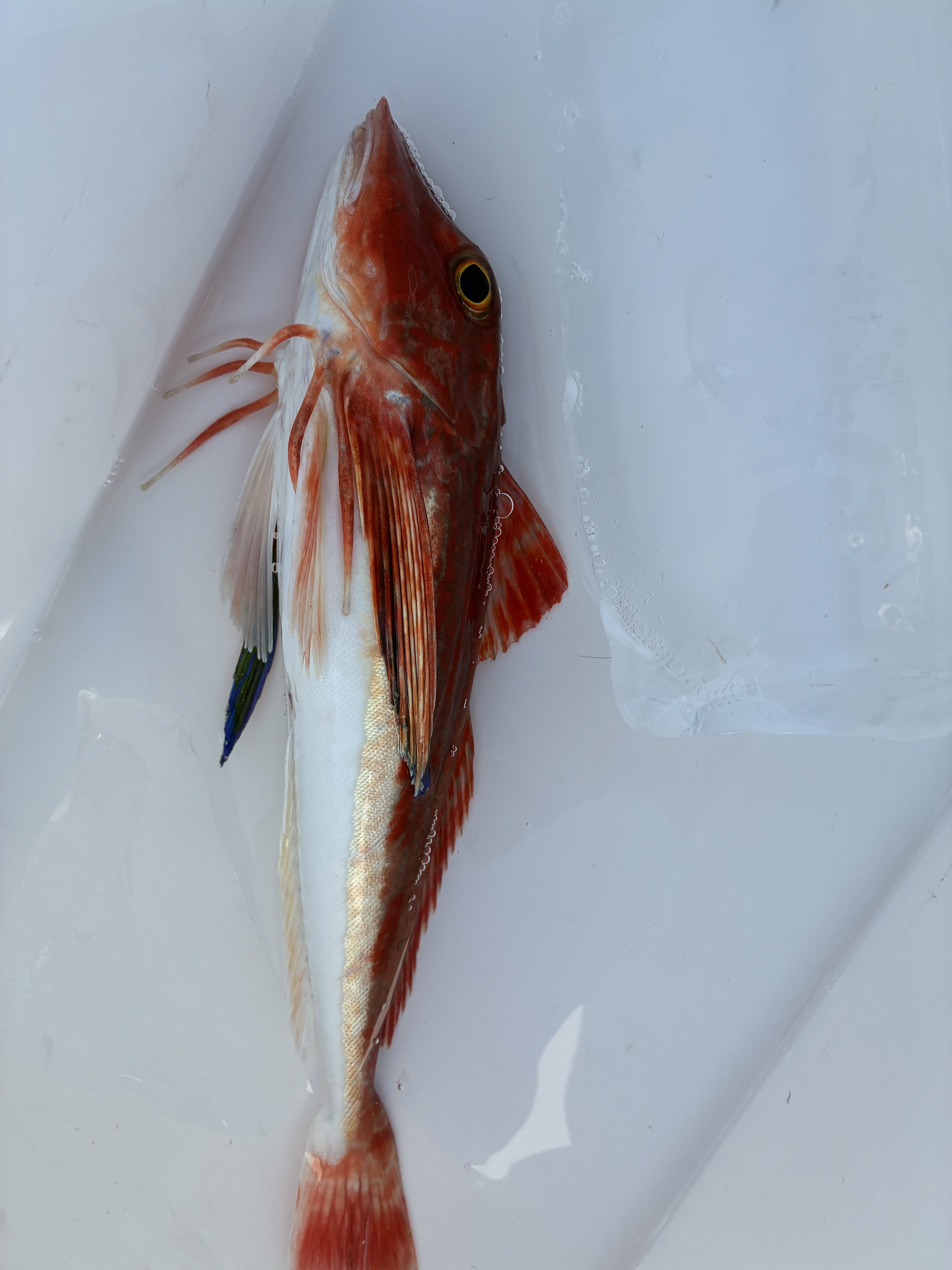 ベイト反応はあるもののヒットに持ち込めず、我慢の時間が続きます。それでも最後のポイントに入り、何度か流し直していると中層で明確なアタリ!しっかりフッキングを決めて慎重に巻き上げてくると、上がってきたのは良型のホウボウでした!本命とはなりませんでしたが、厳しい状況の中での貴重な一尾!イルカの影響もあり難しい釣行となりました。