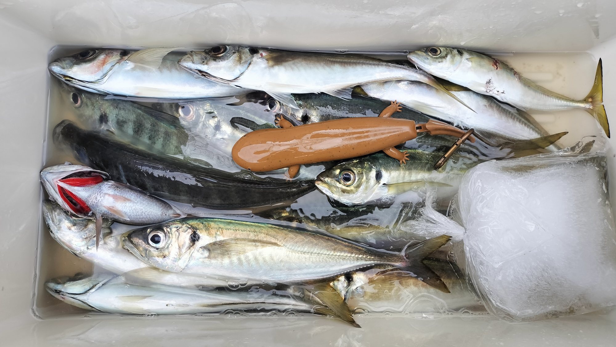 幸いにしてリカバリー後もアタリは出続けて追釣すると中型のアジも混じり始めて、右舷トモ氏は早々に泳がせ釣りを開始。