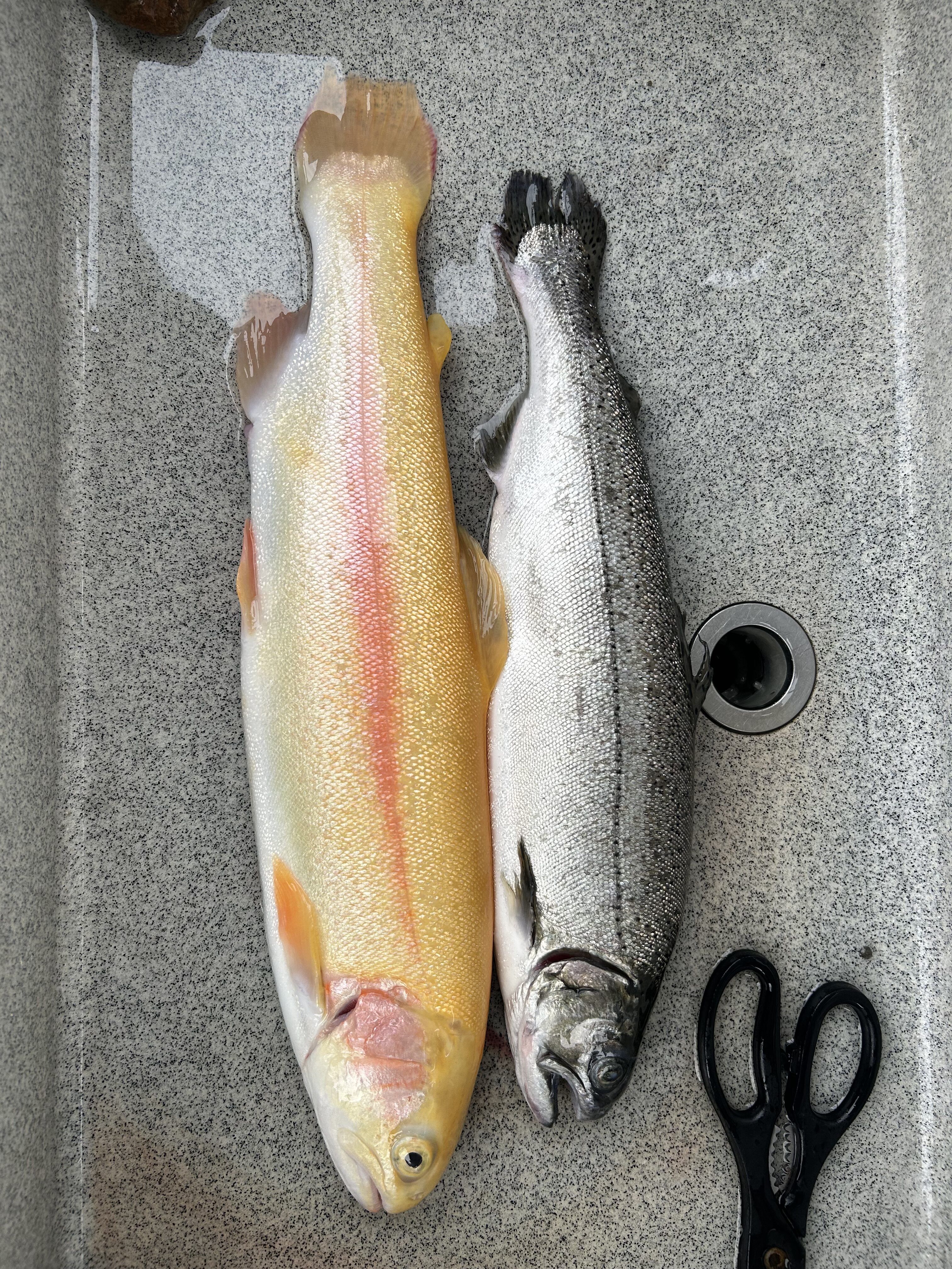 2026.03.09 印刷する ・高島の泉釣行 ミノーイングでアルビノ🎣 魚種 サクラマス ニジマス/レインボートラウト サイズ Max46cm 数 サクラマス、アルビノ、ニジマス計20匹以上 釣り方 ☆エリアトラウト 場所 京都府 天候 曇り スタッフ 大石悠樹 店舗 京都 伏見店 釣行日 2026.03.02 コメント 伏見店スタッフの大石です。 先日、滋賀県の高島の泉でベイトタックル1本でミノーイング釣行してきました💪 午前9時頃釣りを開始、1投目からミノーに反応を示しチェイスはするものの、バイトまで行かず低活性な状況。試しにミノーのアクションのペースを落としてみたところサクラマスの反応が上がり、ポツポツとキャッチ。 40cm台の良い型も釣れたところでお昼休憩を挟み、釣り再開。 午後も活性は高くないですが、ポツポツと釣れ、気分転換にドゥルガエリアFを変えてみると近くにいたアルビノが反応しそのままキャッチに成功。 受付で計測したところ46cmで記念に撮影してもらいました📸 エリアトラウトはスピニングタックルが多く使用されていますが、ミノーイングの場合はベイトタックルもおすすめです✨ ぜひミノーで高島の泉の美味しいトラウト狙ってみてください! 使用した釣具 ロッド シマノ カーディフストリームプレミアムB64L リール シマノ 23カルカッタコンクエストBFSXG ルアー OSP ドゥルガエリアF、ハルシオンシステム ラプス73S、ハンクル ザッガー65SS