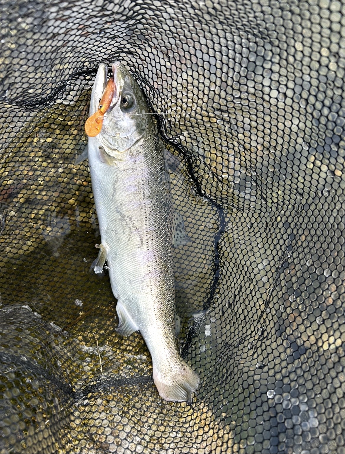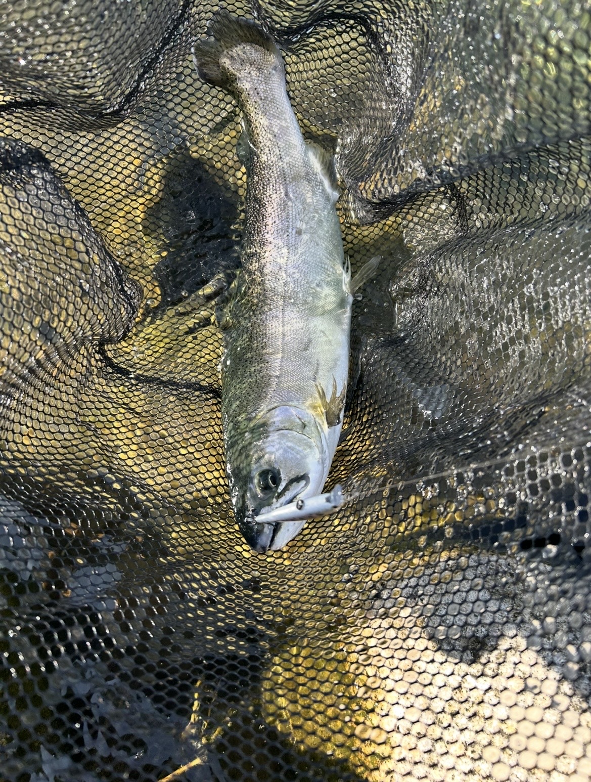 午前9時頃釣りを開始、1投目からミノーに反応を示しチェイスはするものの、バイトまで行かず低活性な状況。試しにミノーのアクションのペースを落としてみたところサクラマスの反応が上がり、ポツポツとキャッチ。