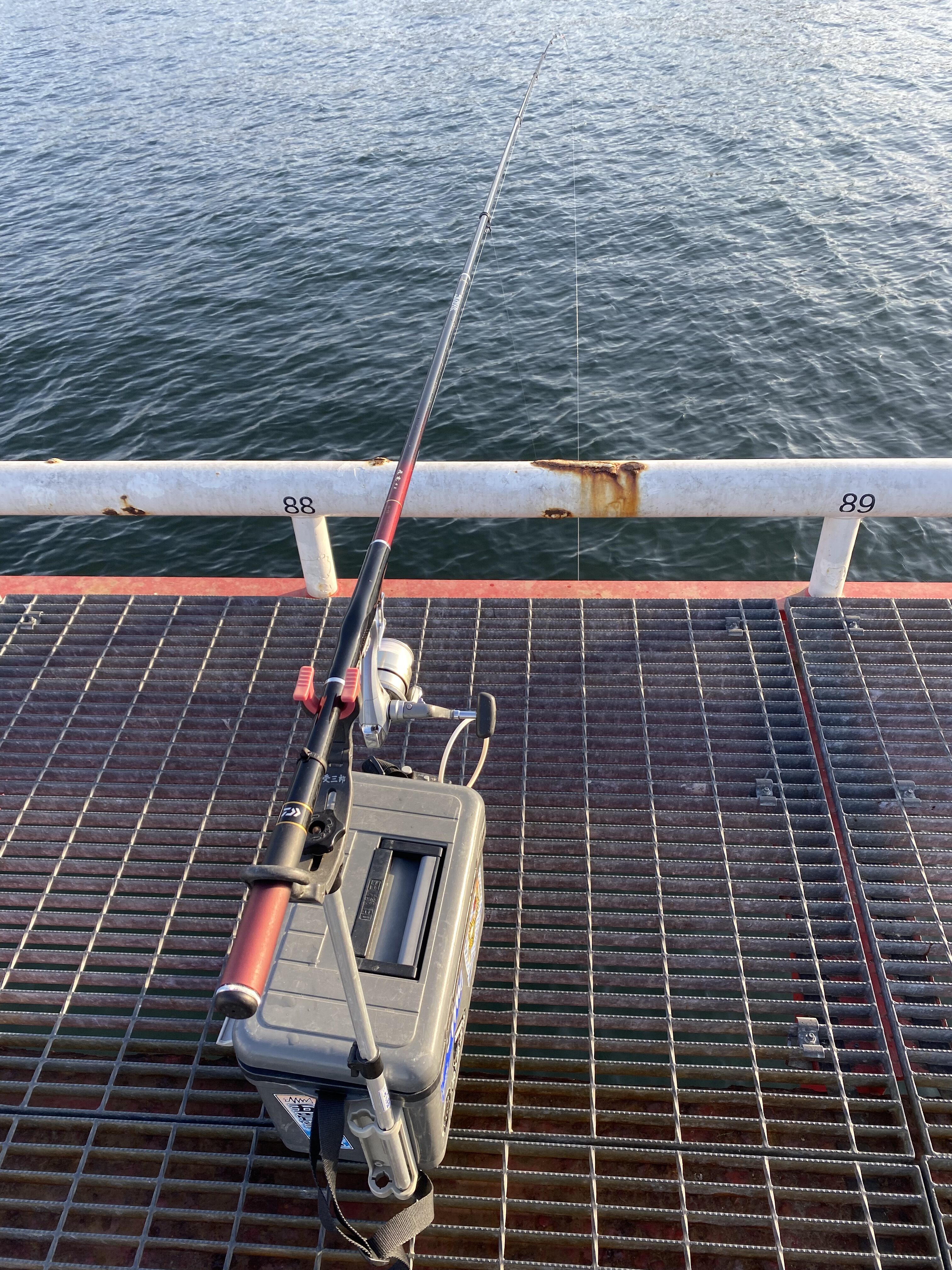 オープンからスタート!平日にも関わらず多くのお客さんでいっぱい🈵最近は桟橋周りがいいらしく、足元ギリギリ狙い。棚は4ヒロ~5ヒロ 低水温なのでまだ底付近。