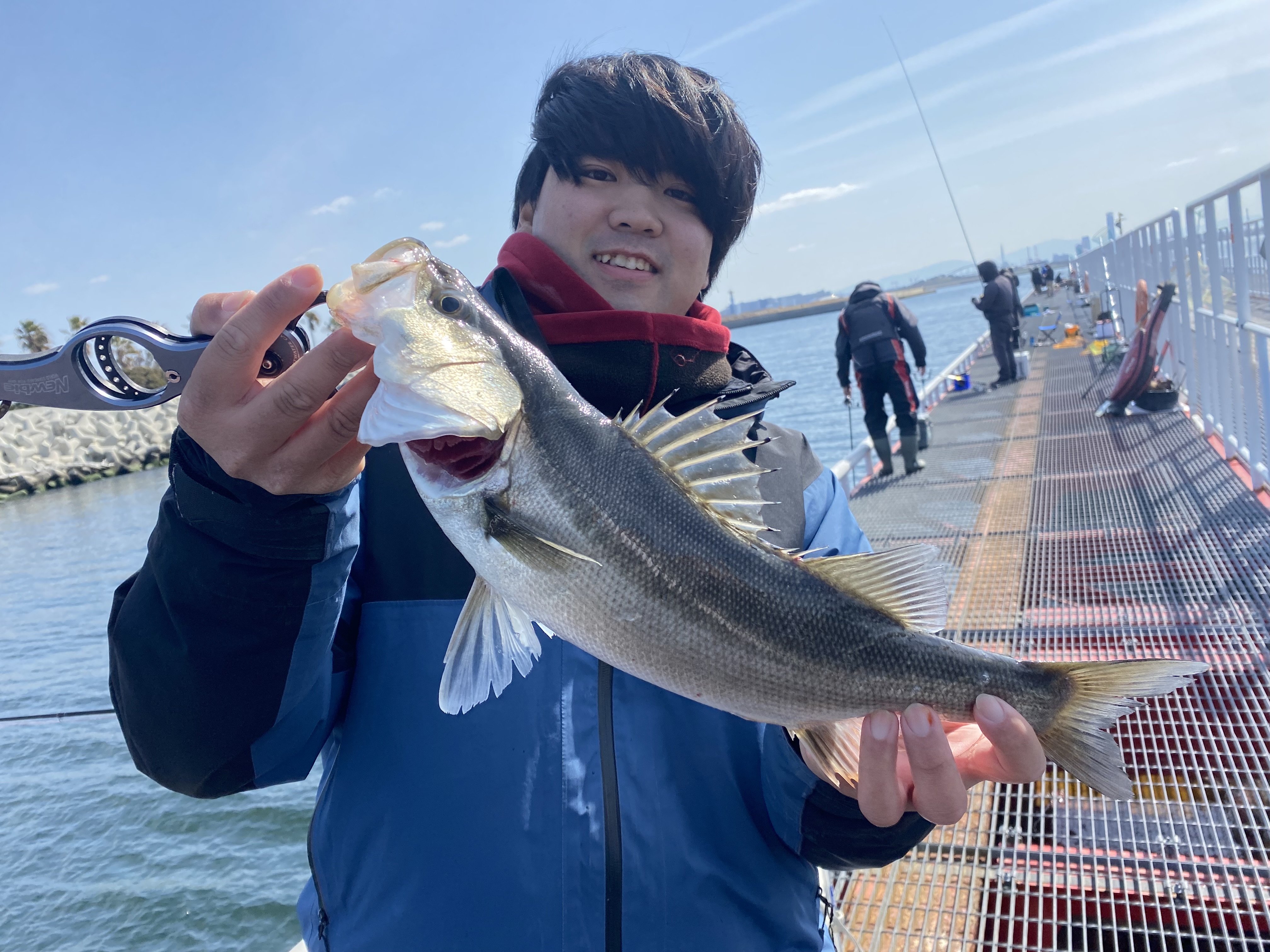 鳥居が桟橋の柱ギリギリに仕掛けを送り狙っているとイイアタリが!!慎重にファイトし上がってきたのはいいコンディションのハネ!!