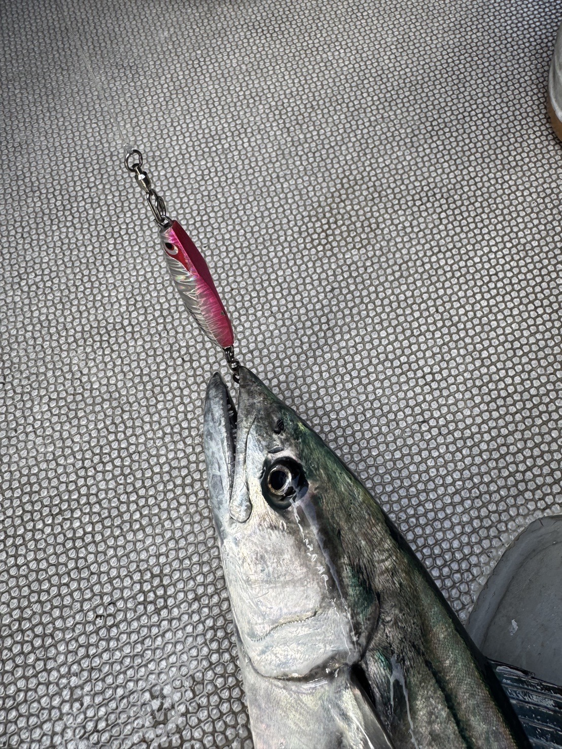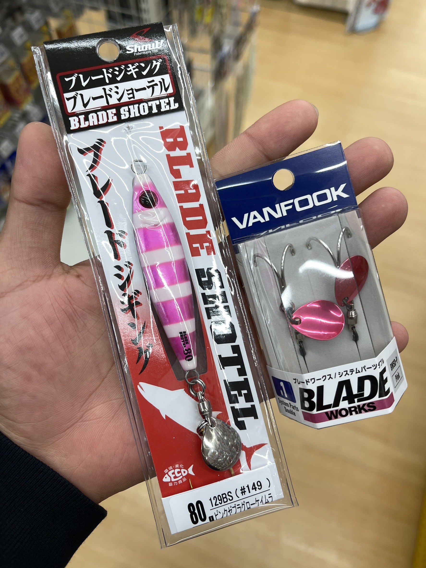 そして今回釣れるキーになったのは、今のメインベイトになってるであろう、シラス アミエビパターンが有効のようで、少し小さめのシルエットで40〜80gが当日も効き、船中のヒットルアーはキャラックのトレイルジグ、グローエッジスケピンク60g、シャウト ブレードショーテル80gピンクセブラ、撃投ジグレベル40gゴールドピンクリップグローで、フックは皆、ヴァンフックのブレードワークスシステムパーツダブルのピンクの#1、#1/0を付けての釣果でした(≧▽≦)