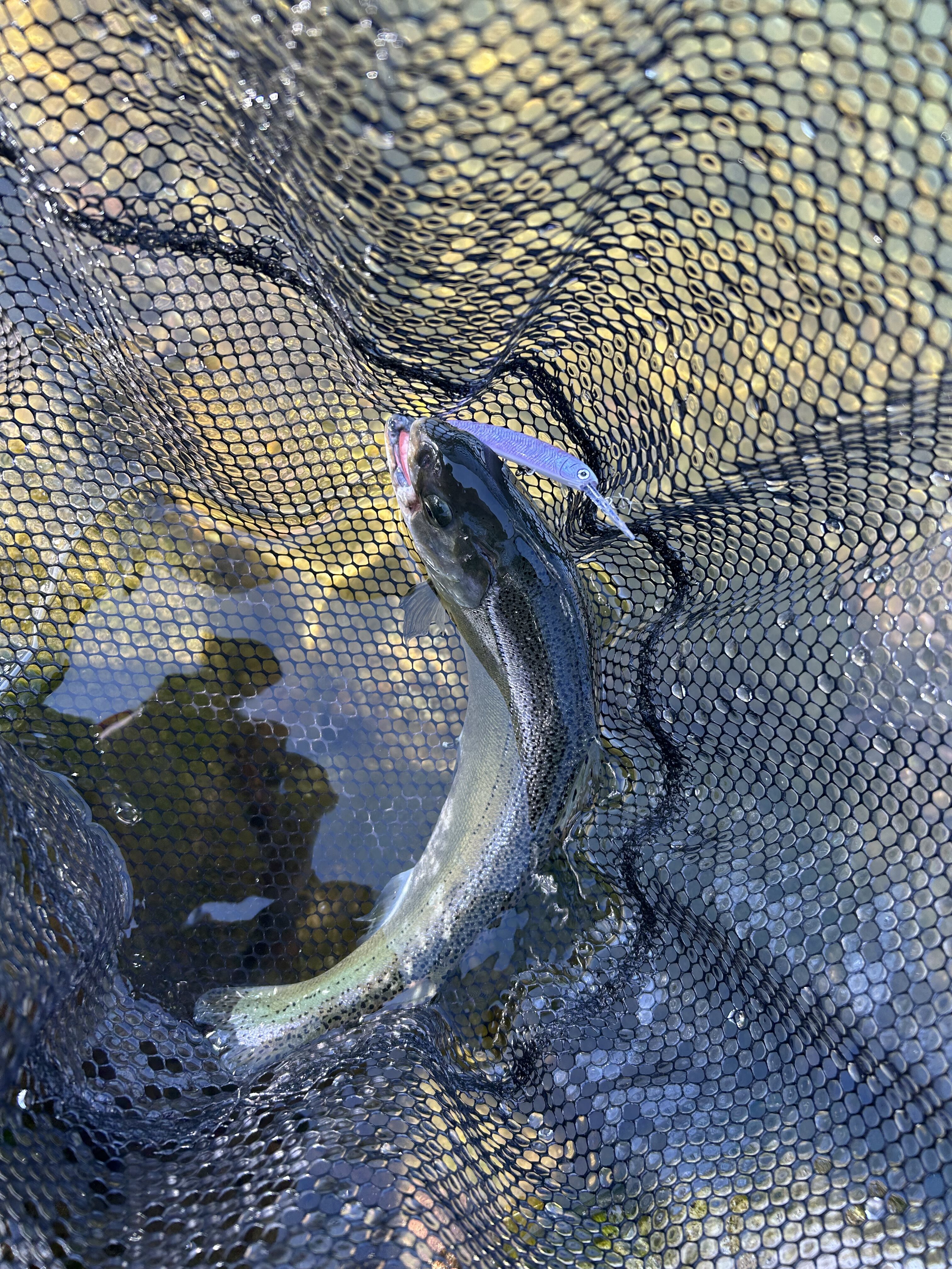 大物狙いを続け、お昼を過ぎた頃、近くに来たイトウにハンクルシャッド55SSを投げると一瞬だけ反応を示したので、絶対に魚体にルアーを当てないよう慎重に近くを数回通したところ、いきなりバイト‼️