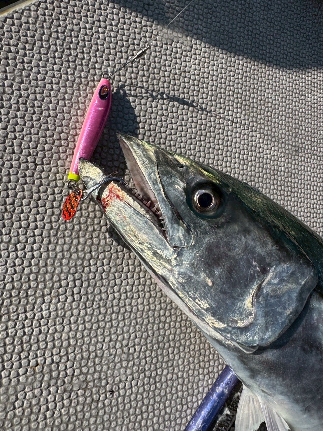 朝の時合に入ると、船中ではポツポツとヒットが続く展開。ここ最近の状況の通りベイトはアミエビらしく、シルエットの小さいピンクカラーのブレードジグへの反応が良く、バイトが集中しました。