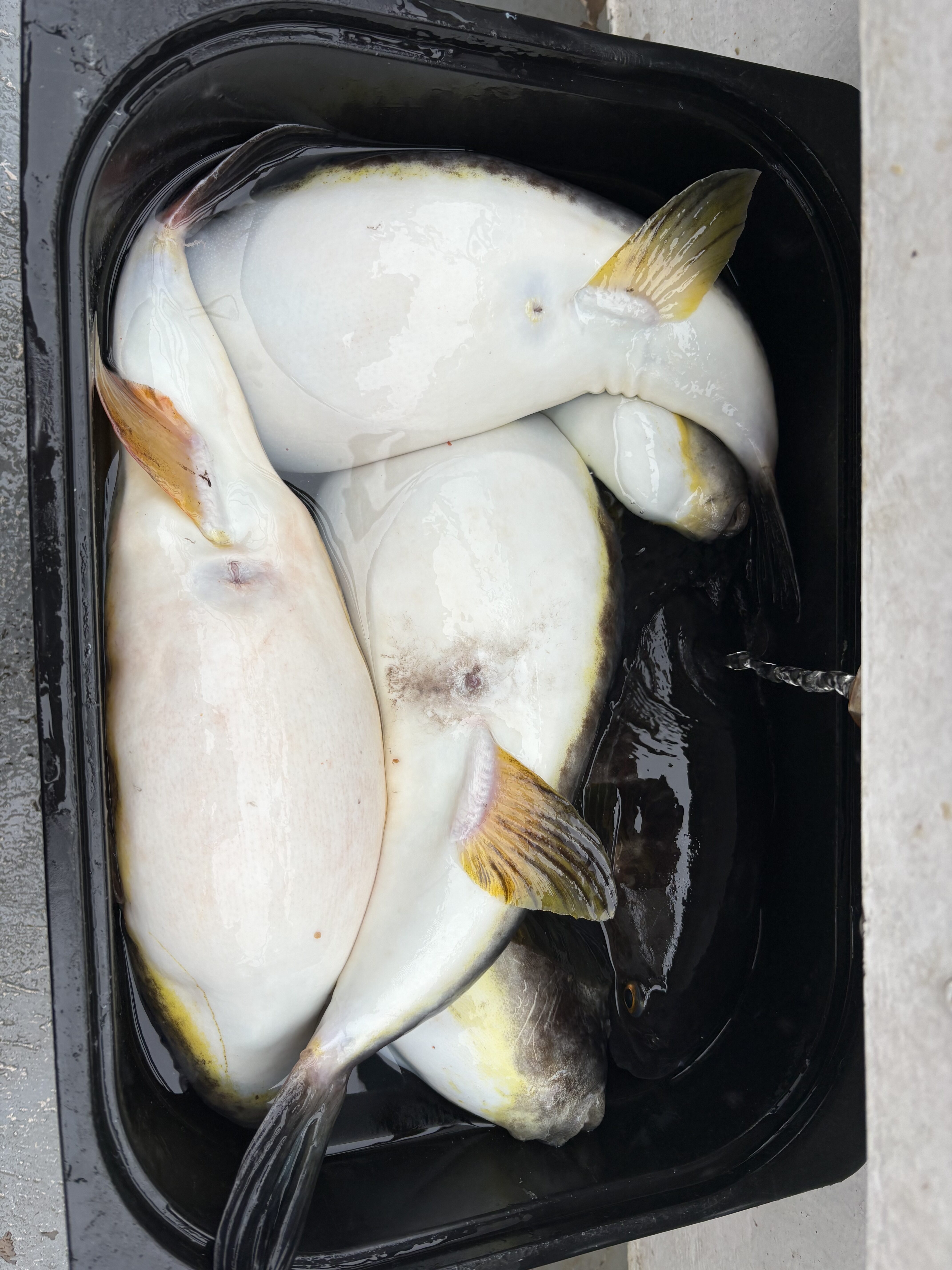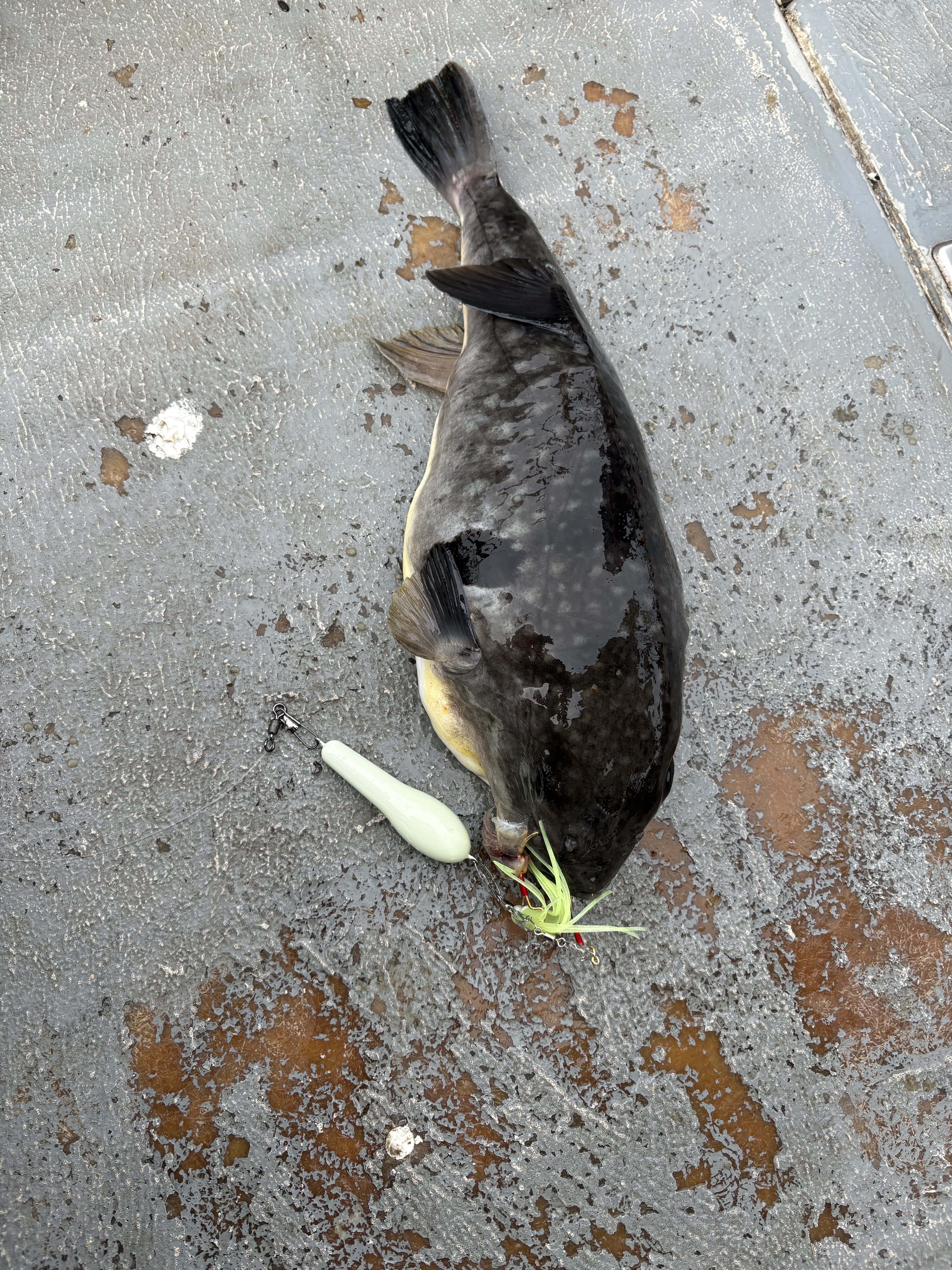すると中層でアタリ!しっかり食い込ませてアワセ!かなりの重量感!上がってきたのは良型マフグ!