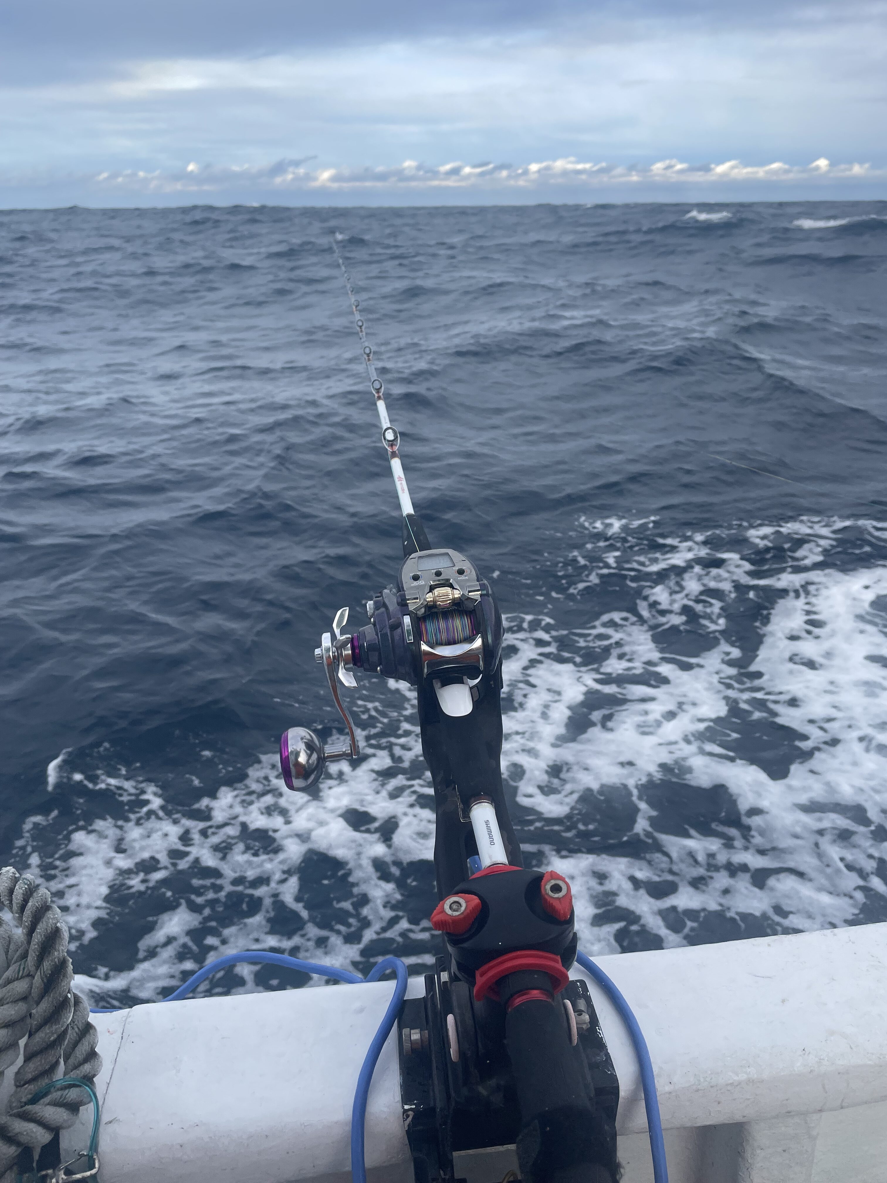 後ろのお客様が1投目で真鯛をゲットしたのち、私の竿にも当たりがあり、上がってきたのは大きなサバでした。
