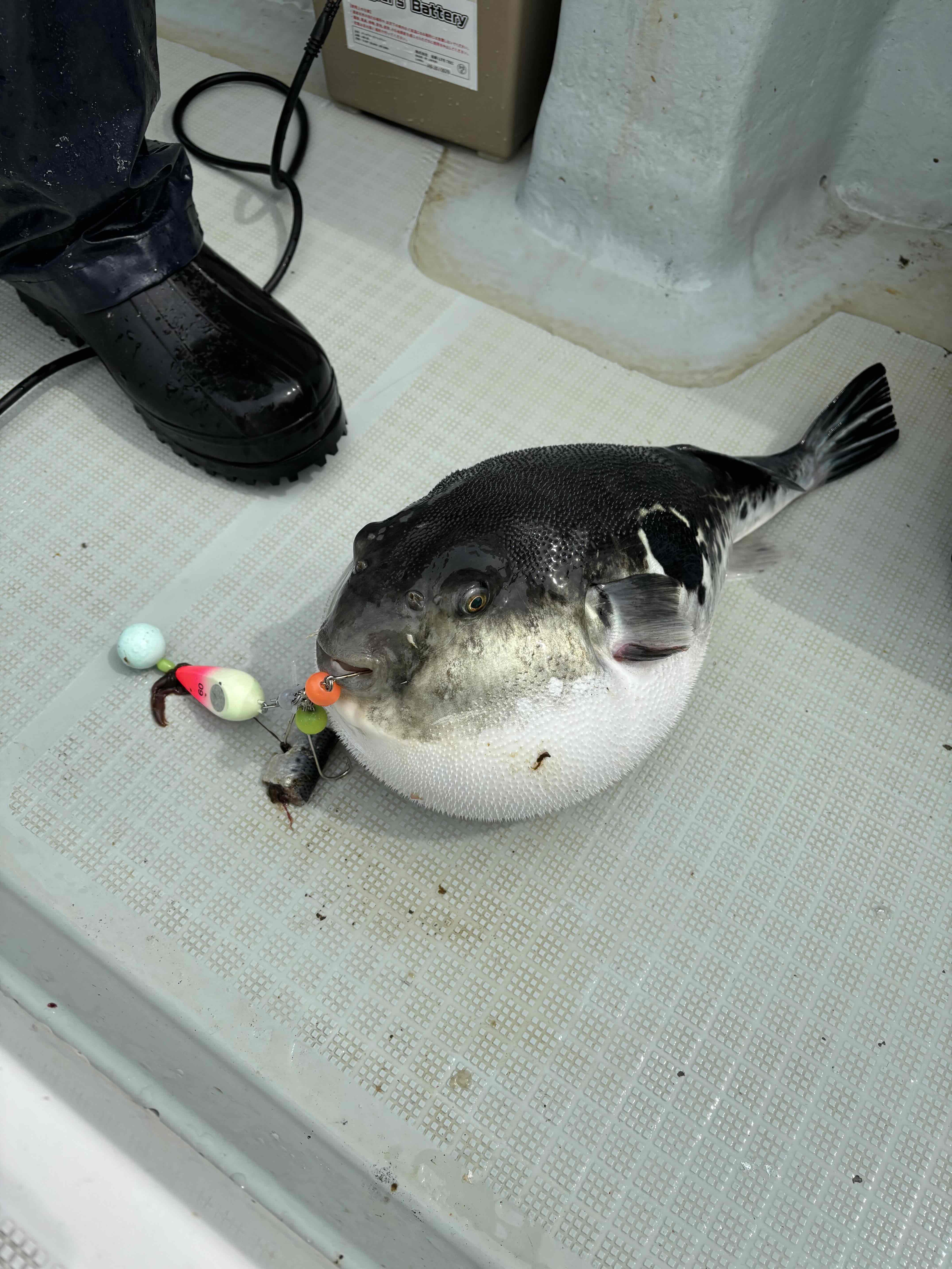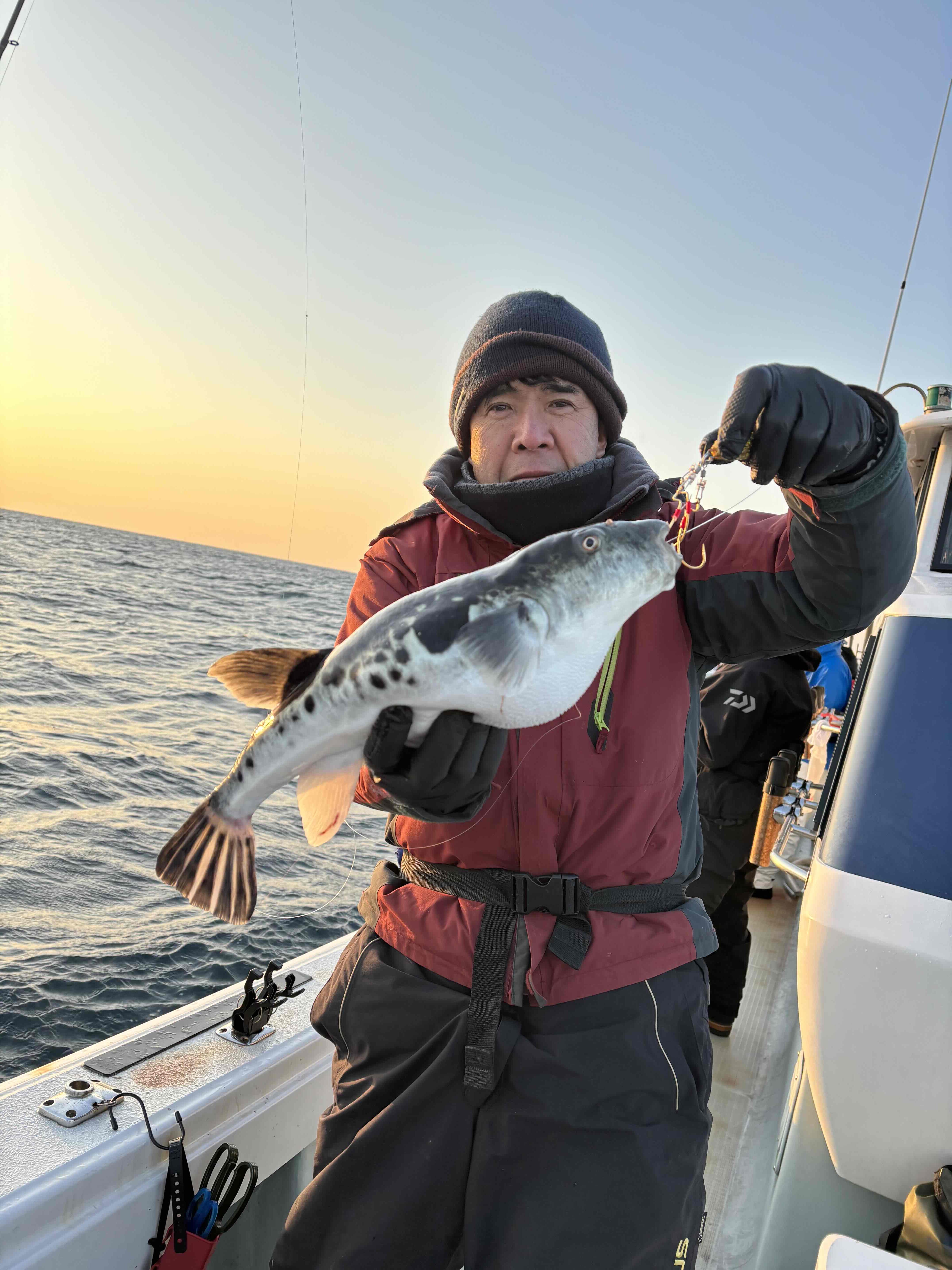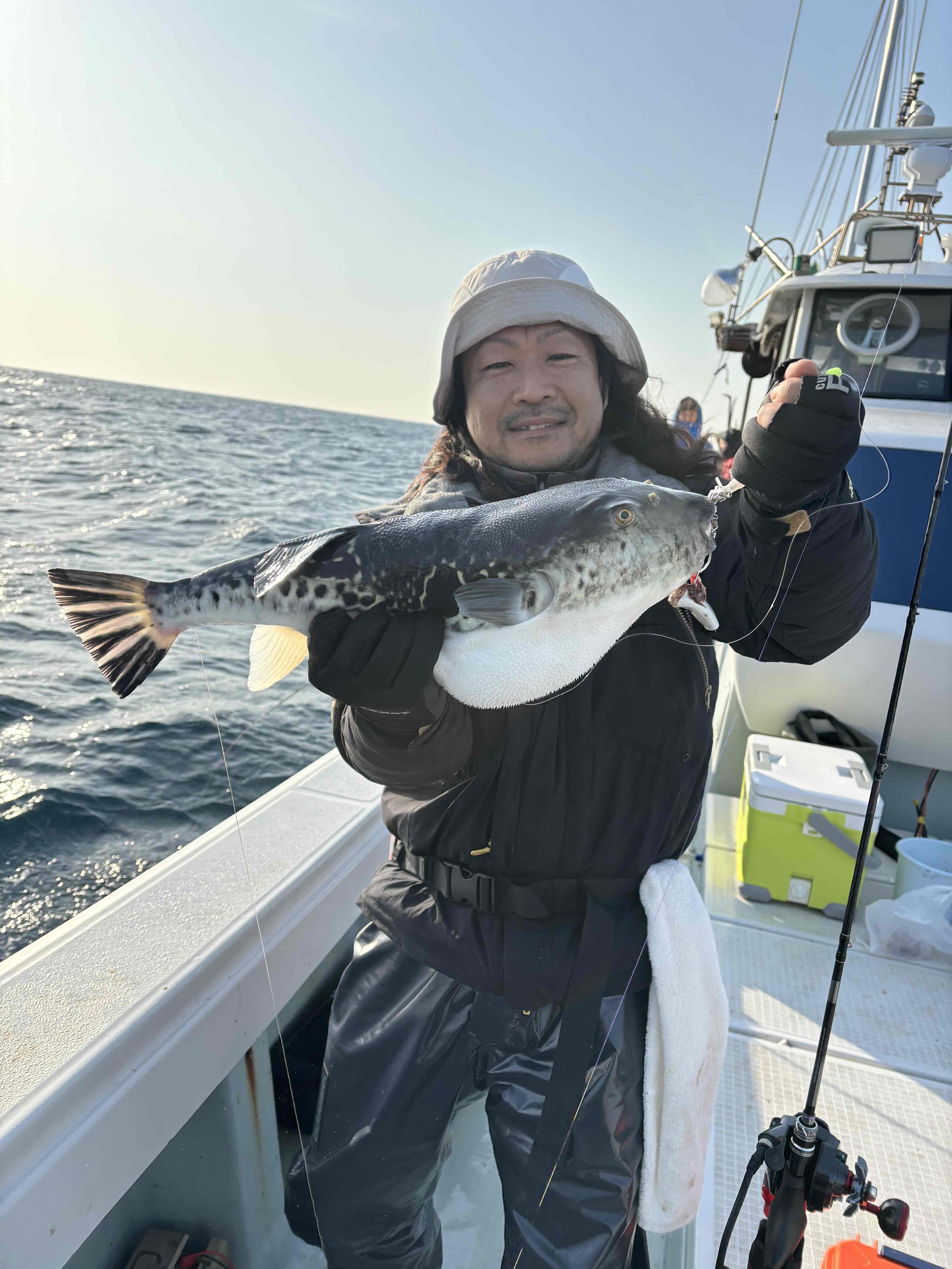 満船12名での出船 この日は釣り日和 風、波の穏やかな日となり釣果も期待したいところ 船中平均5~8匹の釣果が多いトラフグ 船中14匹とかなり良い釣果となりました。 この日の前半ポイントは少し深めのポイントからスタート。錨を下して釣り開始 少ししてヒットの声で上がってきたのは小型なエイ トラフグはサメ、エイなどが釣れると良いと聞きます。早速隣でもヒット!かなりの引きで大きく竿が曲がります。上がってきたのは良型トラフグ ここから午前中のヒットラッシュ 潮がよく走っているのでお祭りも多発しますがしっかり底をとらえて誘いをかけて待っている方がヒットへと持ち込んでいます。バラシも多く前半で2回ほど 8時には落ち着いてアタリがない時間が過ぎます ポイント変更も効果なし。アタリがなくてもエサの交換は必要。お昼前にポイントを浅場に移動して水深も30m前後 早速ヒット!後半の時合がきたのか?アタリが多くなり良型トラフグが上がってきます。後半で3ヒット3キャッチの方もいました。 13時になり納竿となりましたが釣果もよく楽しいトラフグ釣行会となりました。 港に帰り捌いてもらうと大きな白子はとても美味しそうでした。