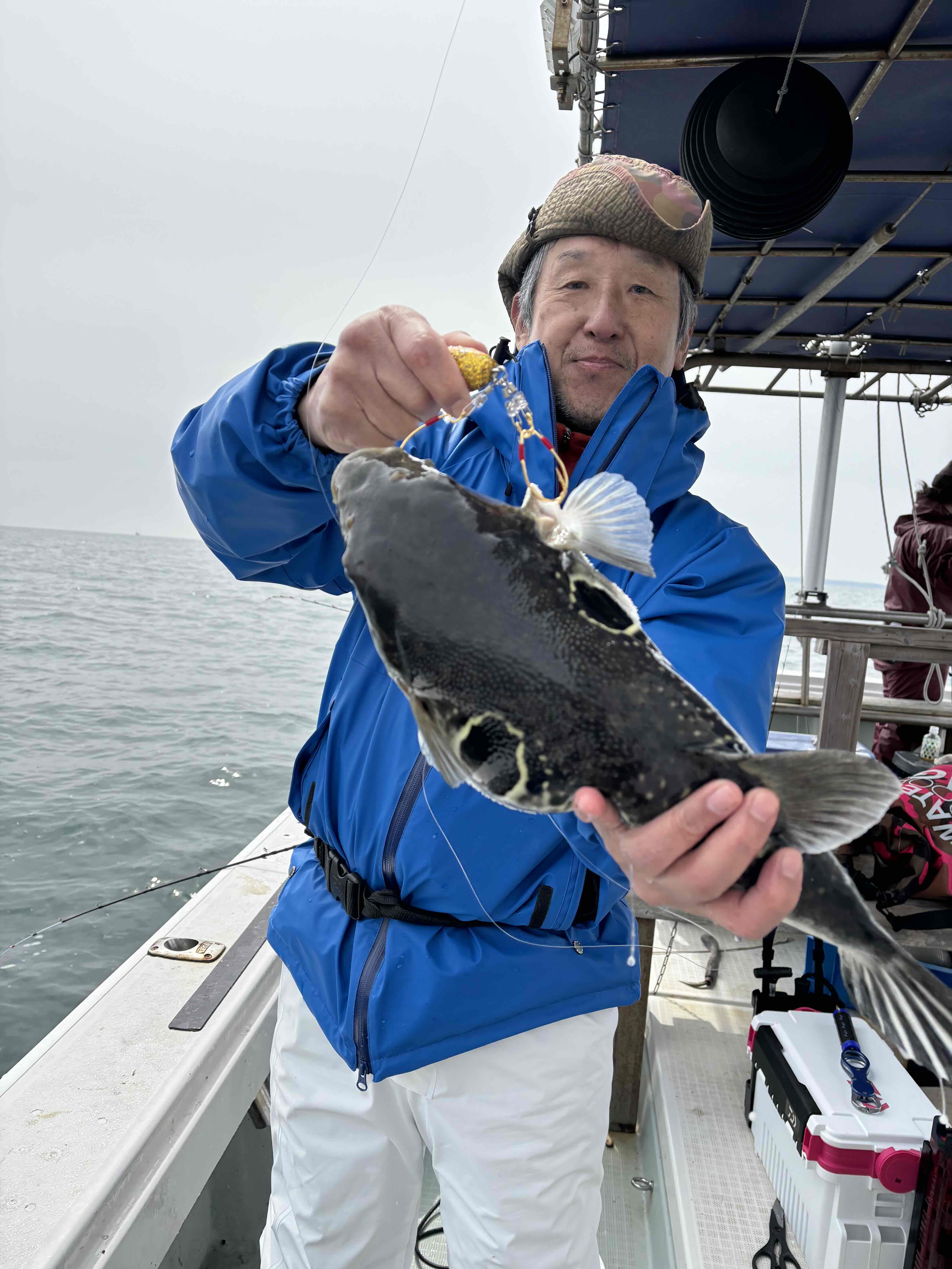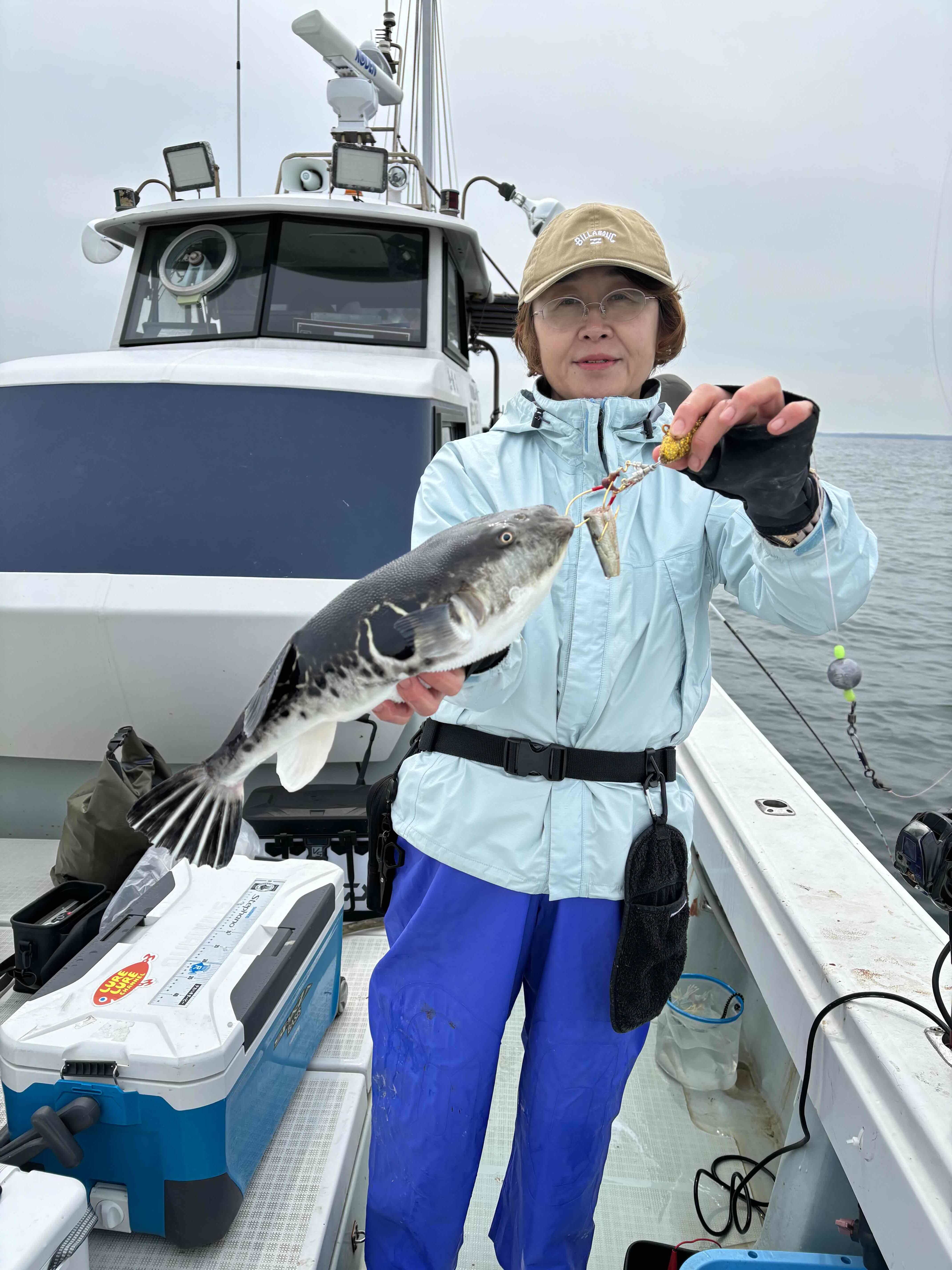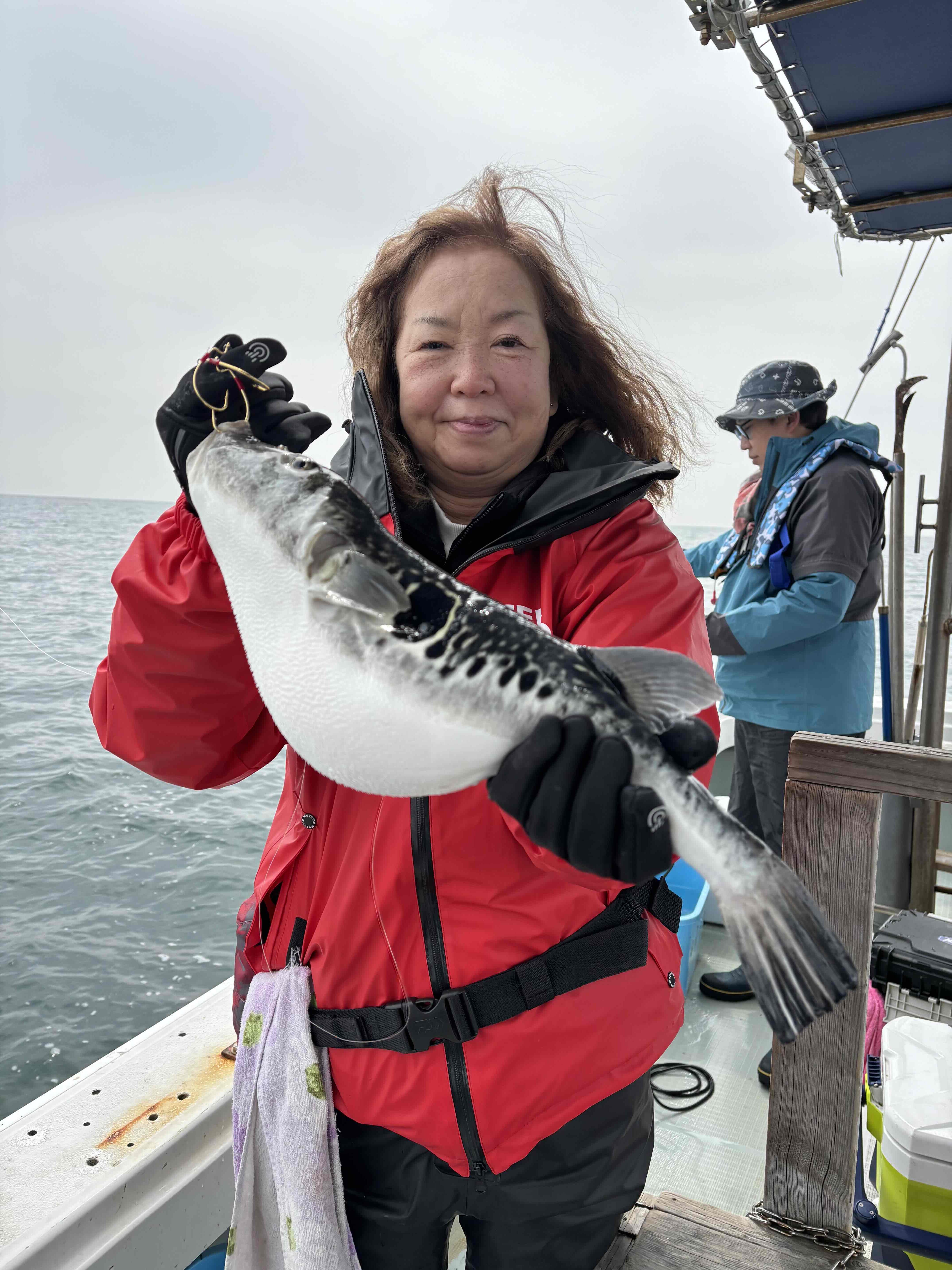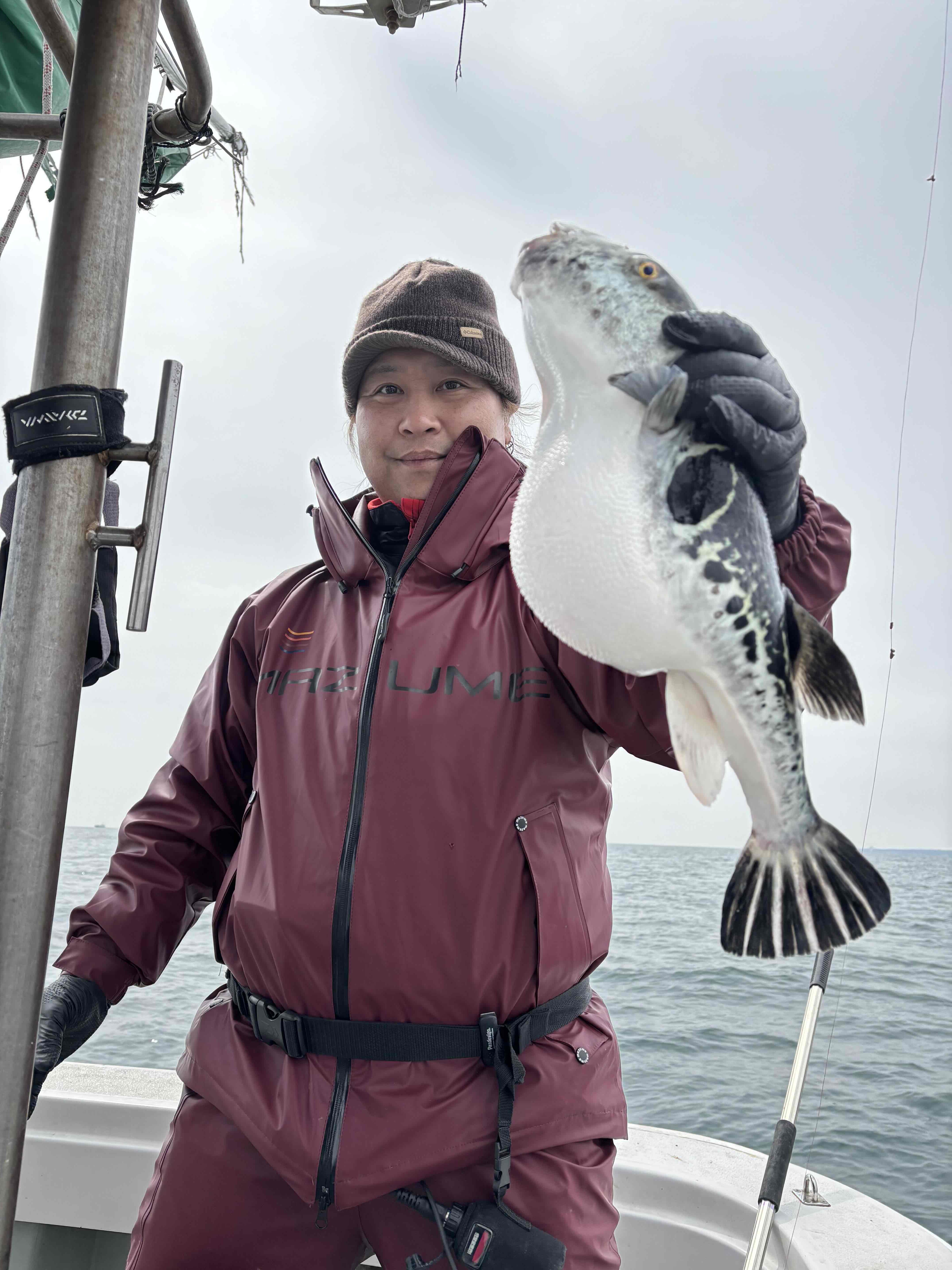 満船12名での出船 この日は釣り日和 風、波の穏やかな日となり釣果も期待したいところ 船中平均5~8匹の釣果が多いトラフグ 船中14匹とかなり良い釣果となりました。 この日の前半ポイントは少し深めのポイントからスタート。錨を下して釣り開始 少ししてヒットの声で上がってきたのは小型なエイ トラフグはサメ、エイなどが釣れると良いと聞きます。早速隣でもヒット!かなりの引きで大きく竿が曲がります。上がってきたのは良型トラフグ ここから午前中のヒットラッシュ 潮がよく走っているのでお祭りも多発しますがしっかり底をとらえて誘いをかけて待っている方がヒットへと持ち込んでいます。バラシも多く前半で2回ほど 8時には落ち着いてアタリがない時間が過ぎます ポイント変更も効果なし。アタリがなくてもエサの交換は必要。お昼前にポイントを浅場に移動して水深も30m前後 早速ヒット!後半の時合がきたのか?アタリが多くなり良型トラフグが上がってきます。後半で3ヒット3キャッチの方もいました。 13時になり納竿となりましたが釣果もよく楽しいトラフグ釣行会となりました。 港に帰り捌いてもらうと大きな白子はとても美味しそうでした。
