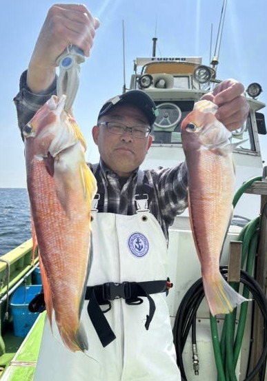今回は浅場のシロアマダイは狙わず、近況で中型が口を使っている水深70m台のラインを流すと右舷トモは連発、左舷ミヨシ寄りでもアタリが出てボウズ脱出。