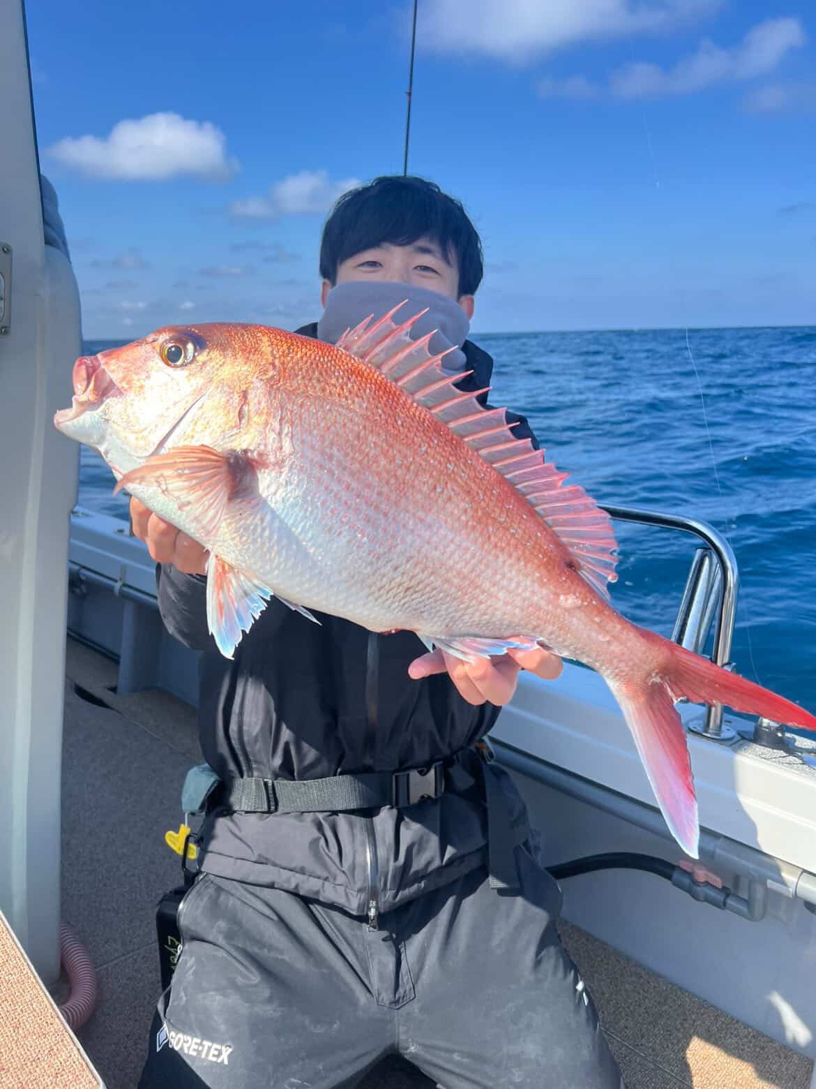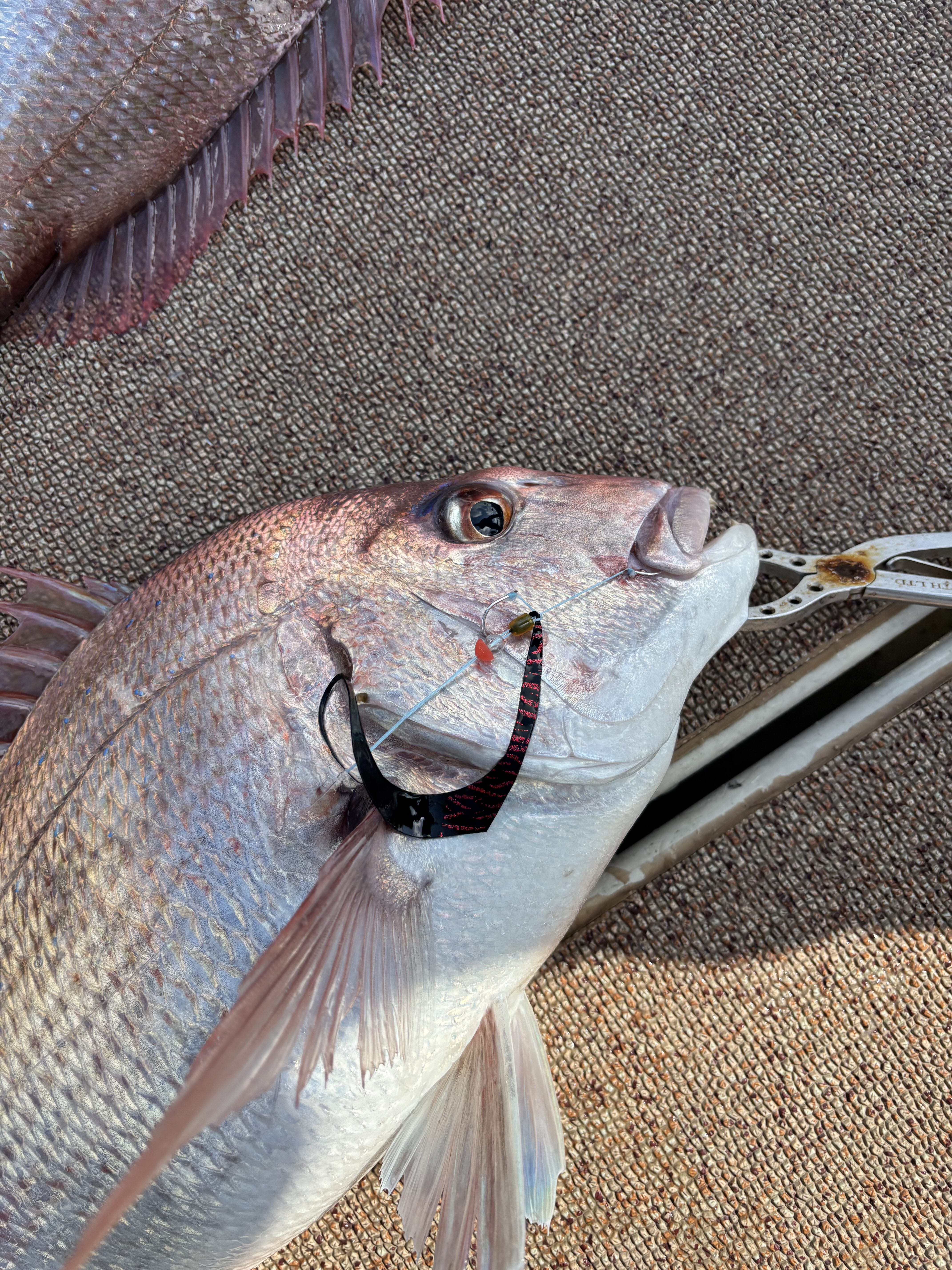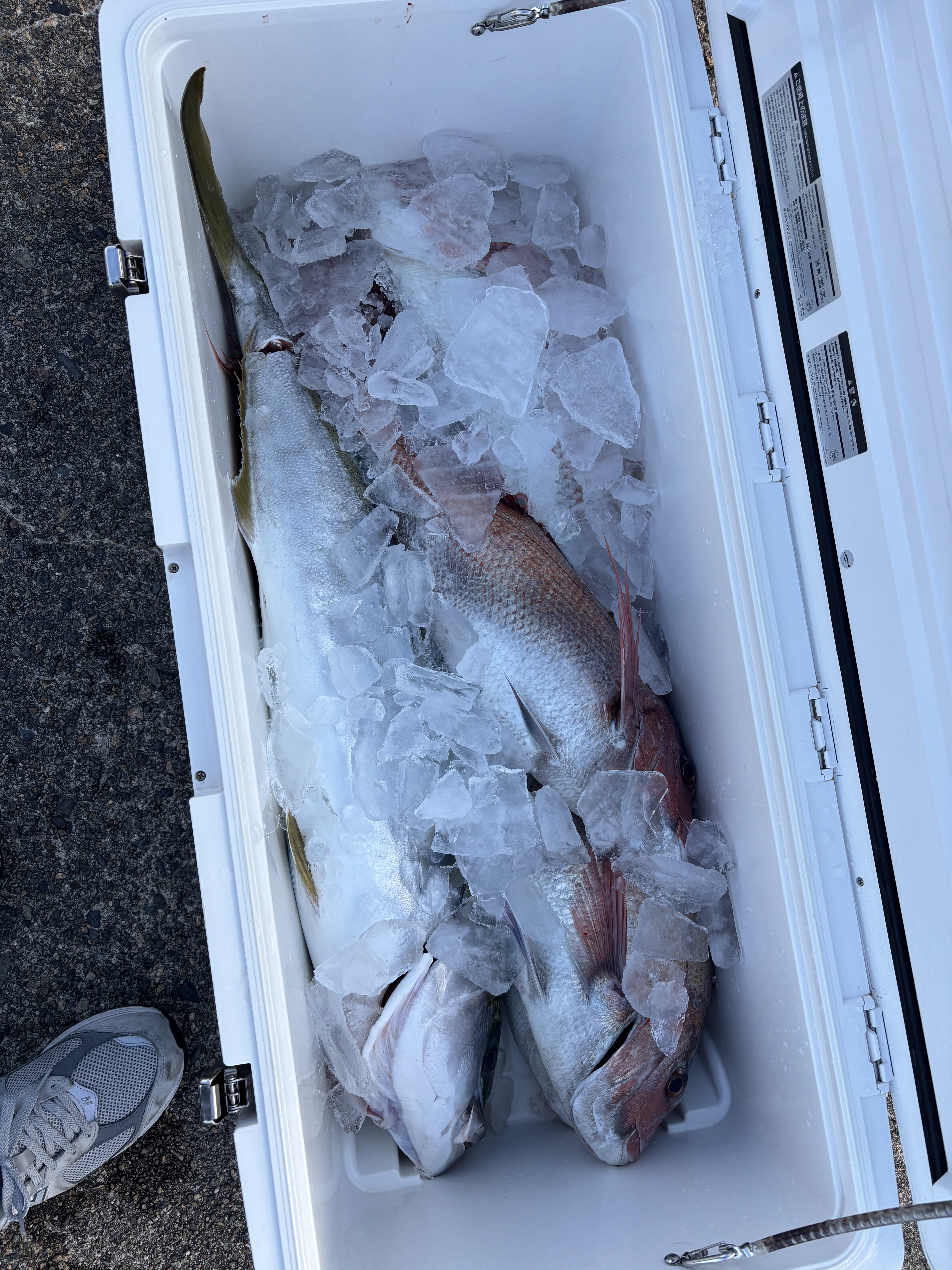 ポツポツ拾い釣りで、あたりも多数あり、バラしもあり、終わってみれば2人で真鯛6枚、小鰤1と満足な釣果となりました🐟