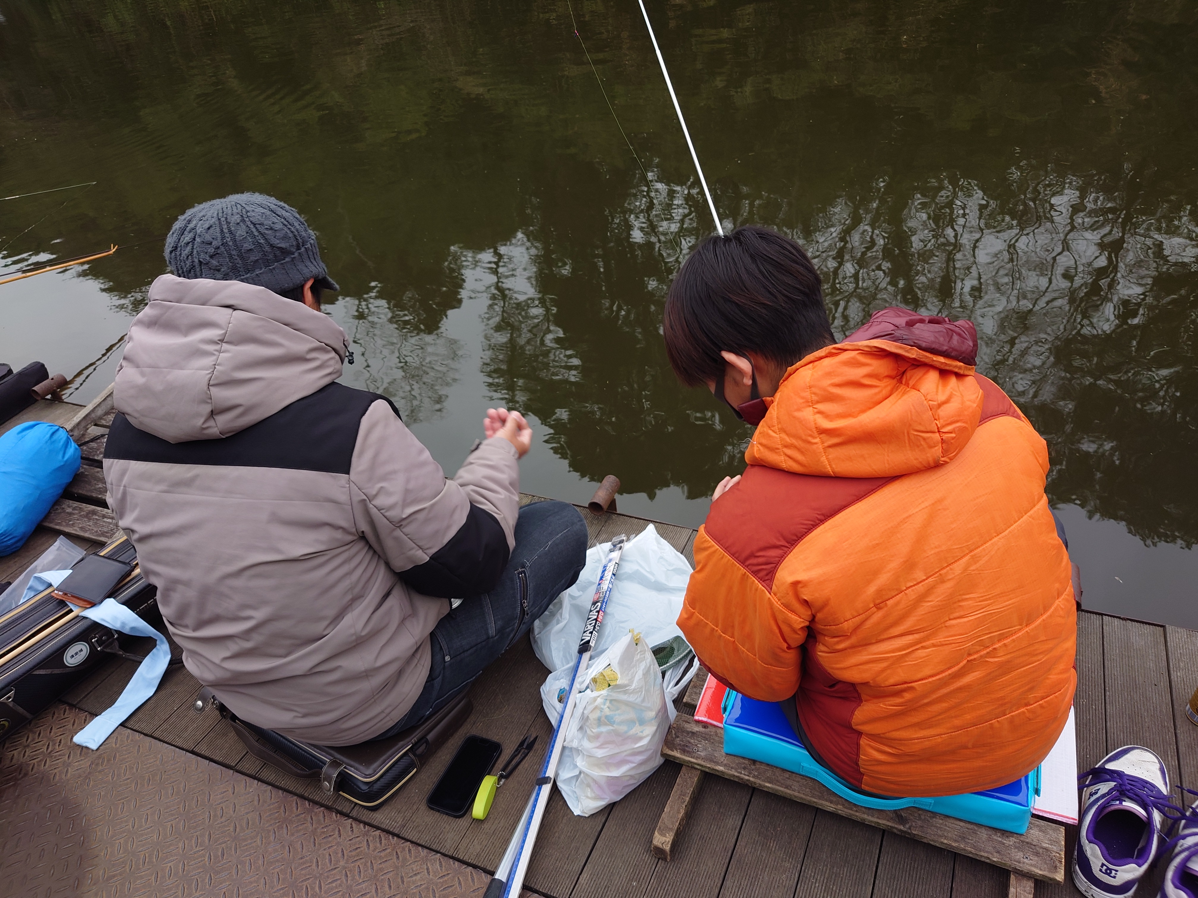 中央桟橋北向き、R平さんとYさんの間に釣り座を構え実釣スタート!釣り方は12尺のメーターセットです。