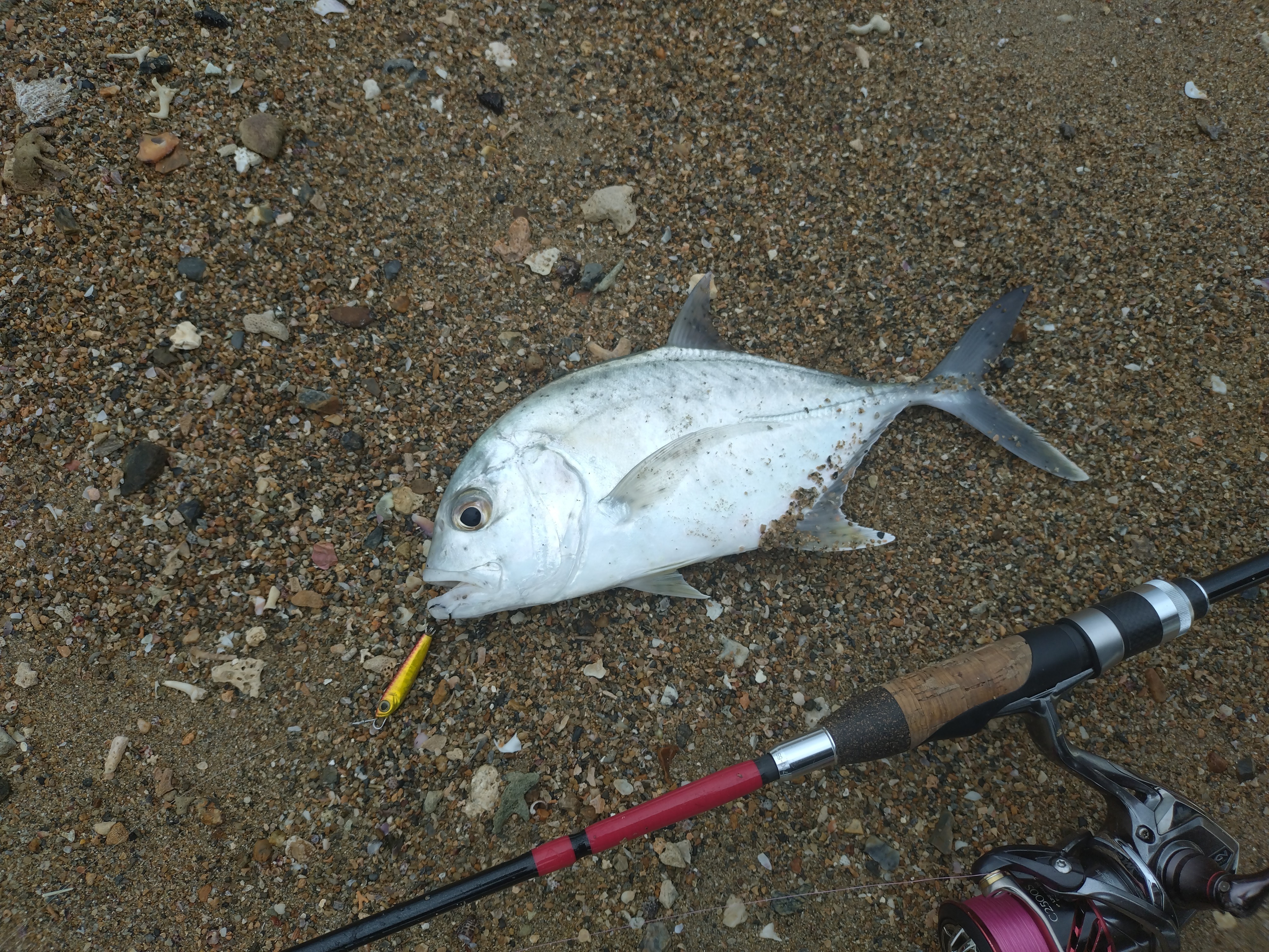 2026.04.01 印刷する 石垣島遠征DAY3 河口部のライトゲーム 魚種 その他 サイズ 20cm 数 ロウニンアジ/1匹 セダカクロサギ/1匹 釣り方 ☆ライトゲーム 場所 沖縄県 天候 雨/曇り スタッフ 沼田武志 店舗 埼玉狭山店 釣行日 2026.03.27 コメント こんにちは狭山店沼田です 石垣島遠征3日目この日は前日にレンタルバイクを借りたので夜明け前の早朝から島の内陸部にある川へオオクチユゴイを狙いに行きました。 小雨が降る中まだ薄暗い時間に到着し少し明るくなるまで待ちいざキャスティングをしようとしたところ川がかなり濁っている… 雨は降っていたもののそこまで本降りではなかったので想定外。よくよく辺りを見回してみると田んぼには田植えしたばかりの稲が 雨の影響ではなく田んぼの代掻きの影響でした。 その後少しでも影響の少ない上流部をランガンしましたが反応を得ることはできず雨も強くなってきたので一旦宿に戻り夕方に出直しました。 夕方になり雨もやんだので海岸線を走らせていると河口エリアのシャローでライズを発見 すぐに準備してルアーをキャストしてみると魚の正体はターポンでした ターポンはライズするときに特徴的な背びれが出るのでわかりやすいです しかしどれだけドンピシャでキャストが入っても反応なし いろいろ手持ちのルアーを片っ端からローテーションしようやくメッキがヒット! その後セダカクロサギを追加し終了 本命ターポンは釣ることが出来ませんでしたが非常にゲーム性の高いターゲットなのでいつかご紹介できればと思います。 使用した釣具 ロッド フエルコ 700MG-5S リール ストラディック C2500S