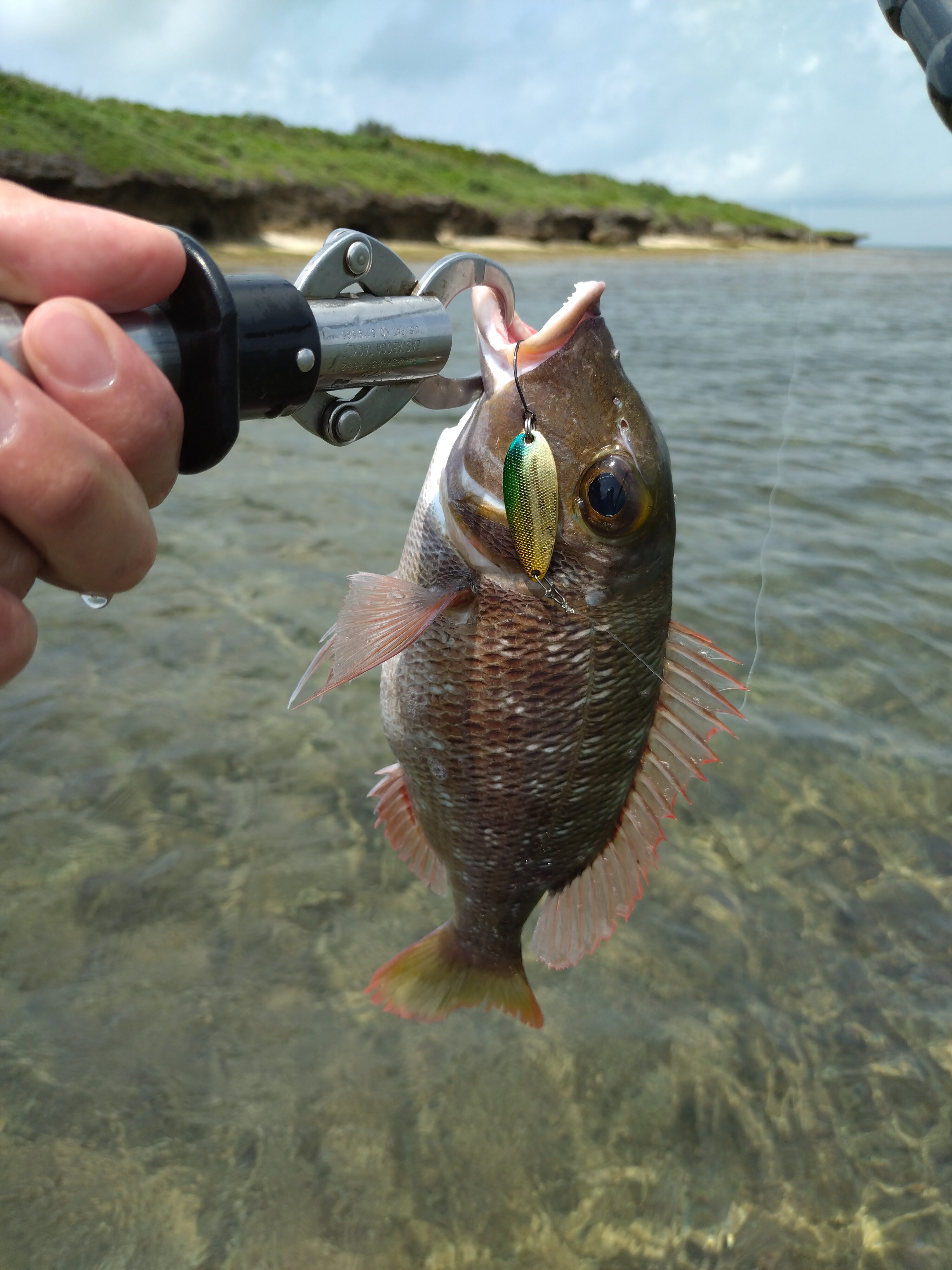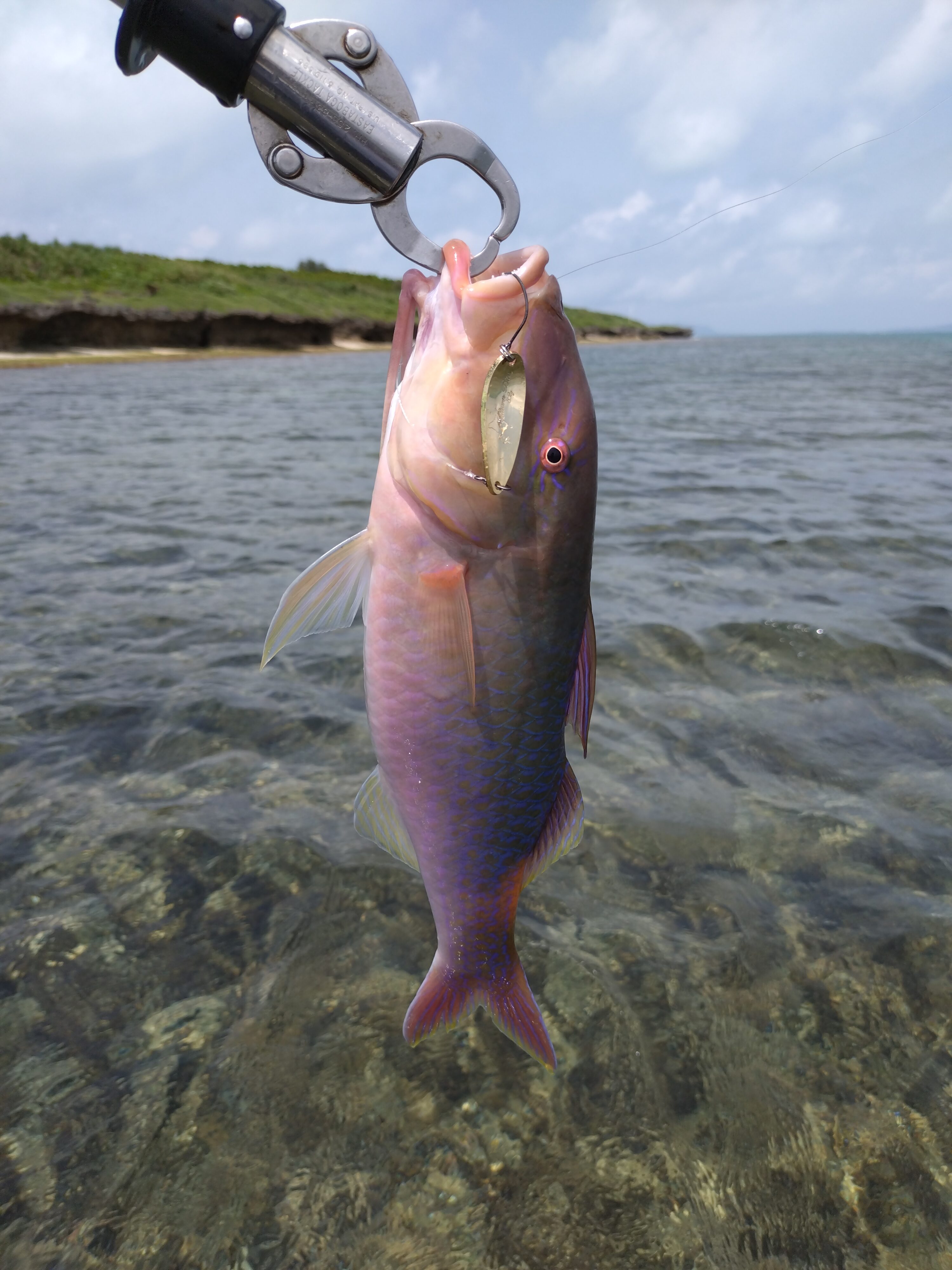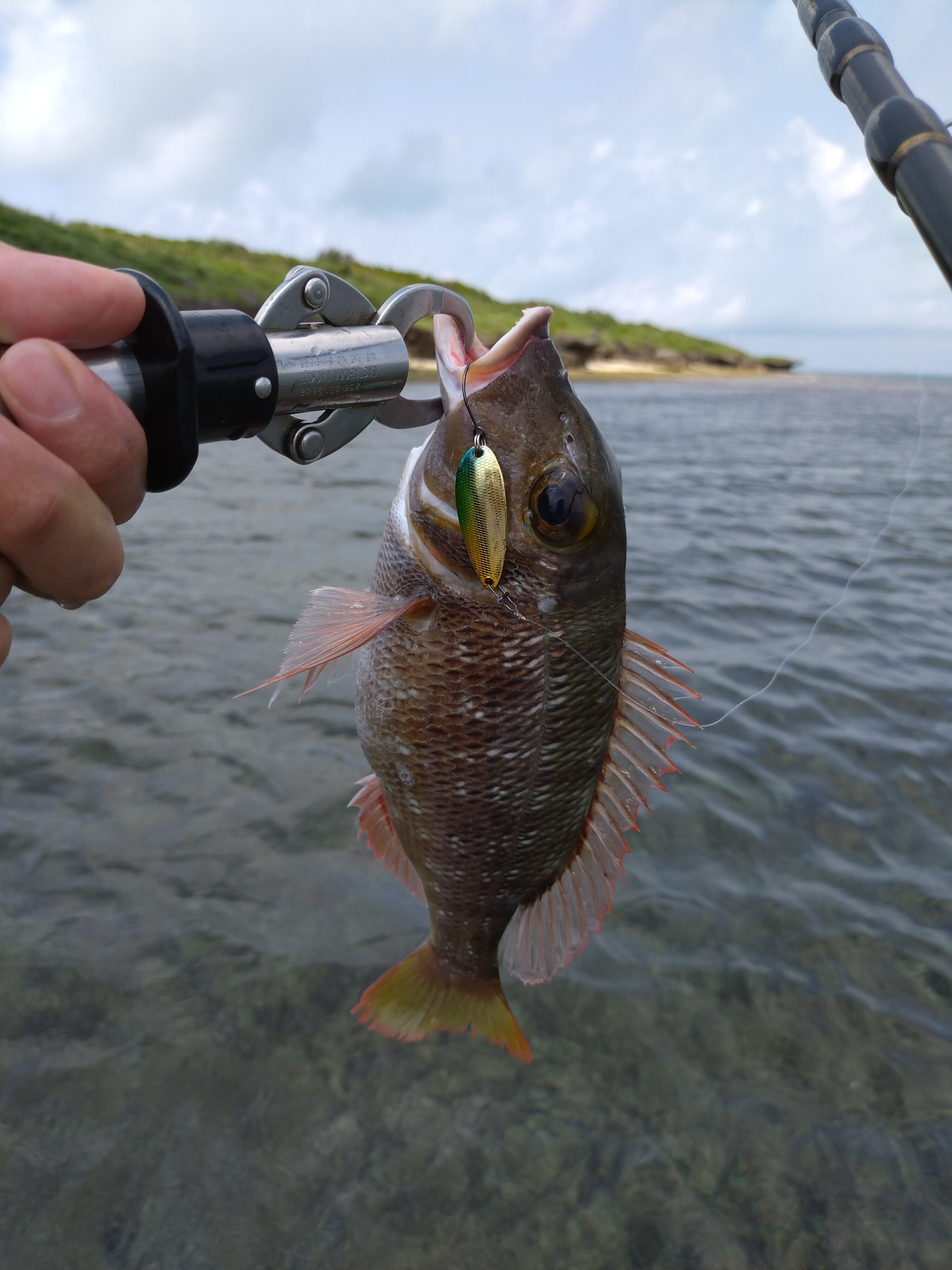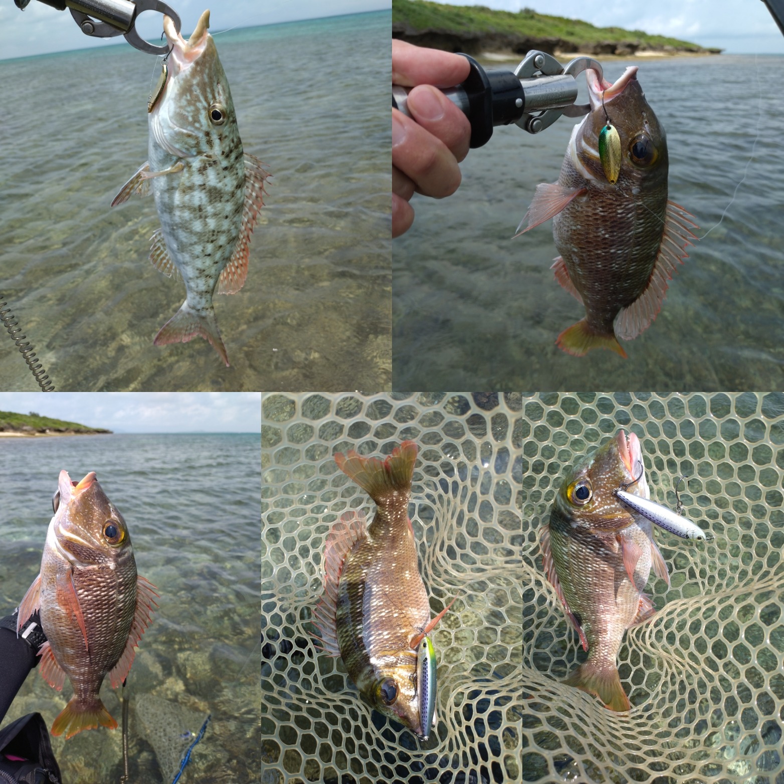 2026.04.01 印刷する 石垣島遠征DAY4 黒島リーフフィッシング 魚種 その他 サイズ 20cm~30cm 数 アミメフエダイ/5匹 イソフエフキ/4匹 キツネフエフキ/1匹 ミツバモチノウオ/1匹 釣り方 ☆その他SWルアー 場所 沖縄県 スタッフ 沼田武志 店舗 埼玉狭山店 釣行日 2026.03.28 コメント こんにちは狭山店沼田です この日は石垣島からフェリーで25分ほどで行ける黒島へ、リーフフィッシングへ行ってきました。 往復で¥3,000程で今回は時間の都合で行きは八重山観光フェリー帰りは安栄観光フェリーを利用しました。 黒島は牛の島と言われるぐらいで人口より牛が多い島です。 港に着いてすぐレンタサイクル屋さんがあるので自転車を借りてすぐに出発。(4時間¥1,300でした) 潮の高さによりポイントは変わりますがお昼に最干潮で50cm以下になる下げがお勧めです それぐらいだとちょうど膝下ぐらいの水深でちょうど魚の多いリーフエリアを攻めることが出来ます ルアーはスプーンの5~10gでフックを太めのシングルに変えます。 タマンなどのフエフキ系を狙う場合でしたら15~20gの流れに強い本流トラウト系のスプーンがお勧めです。 いいサイズがヒットするも一瞬でフックを伸ばされバラシてしまいました そのほかシンキングペンシルでフォールを多用するのもフエフキ系にはお勧めです。 9時から13時の短時間釣行でしたが十分な釣果を得ることが出来たので大満足の釣行でした。 石垣島にもリーフフィッシングが出来るところはたくさんありますが魚影の濃さは黒島の方が段違いです。 今回もパックロッドと小さなケース一つで行ける釣りですので興味のある方は挑戦してみてはいかがでしょうか。 使用した釣具 ロッド ディアモンスター MX7S リール ツインパワーC5000XG ライン ピットブル8+ 1,5