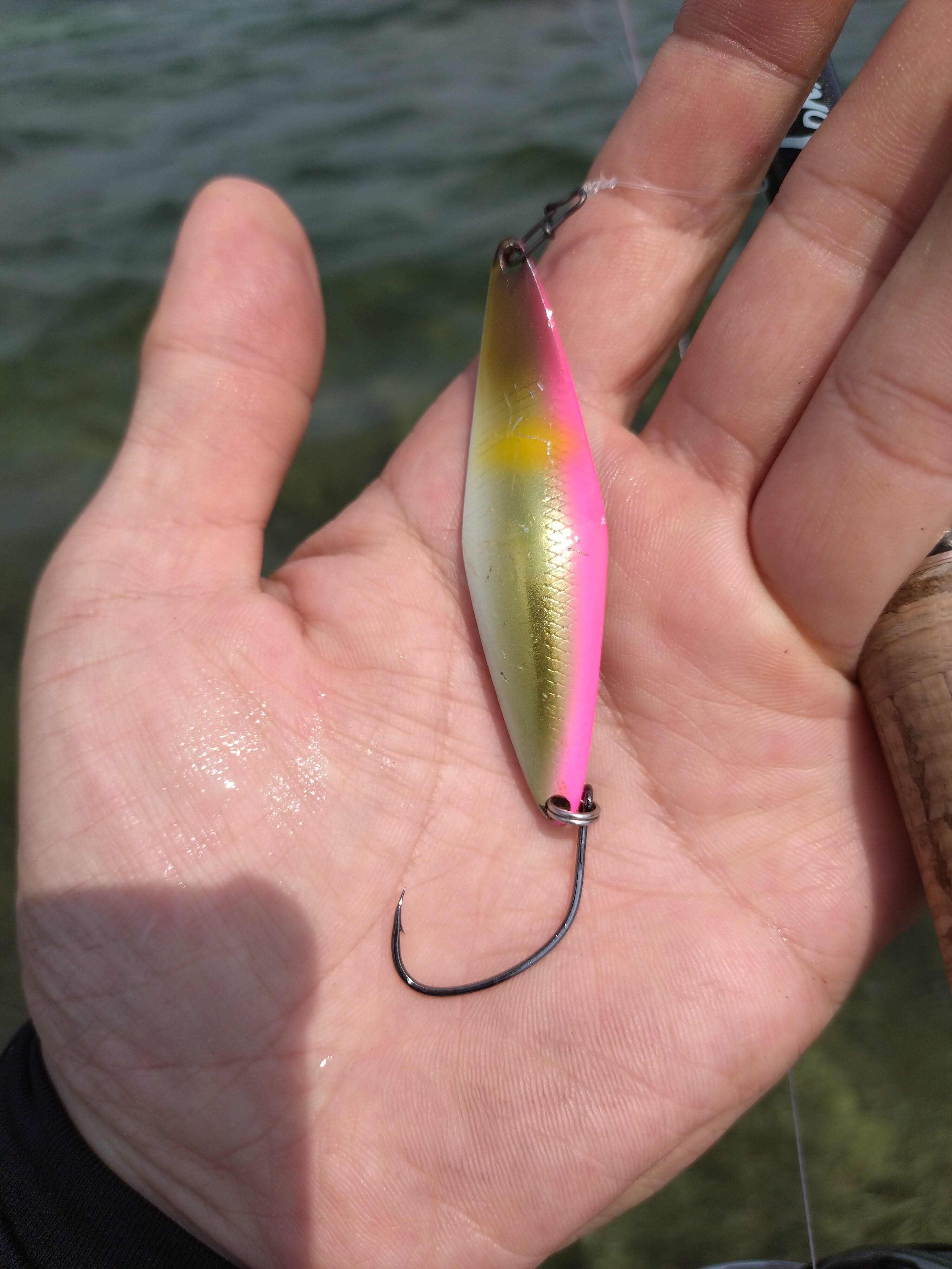 ルアーはスプーンの5~10gでフックを太めのシングルに変えます。