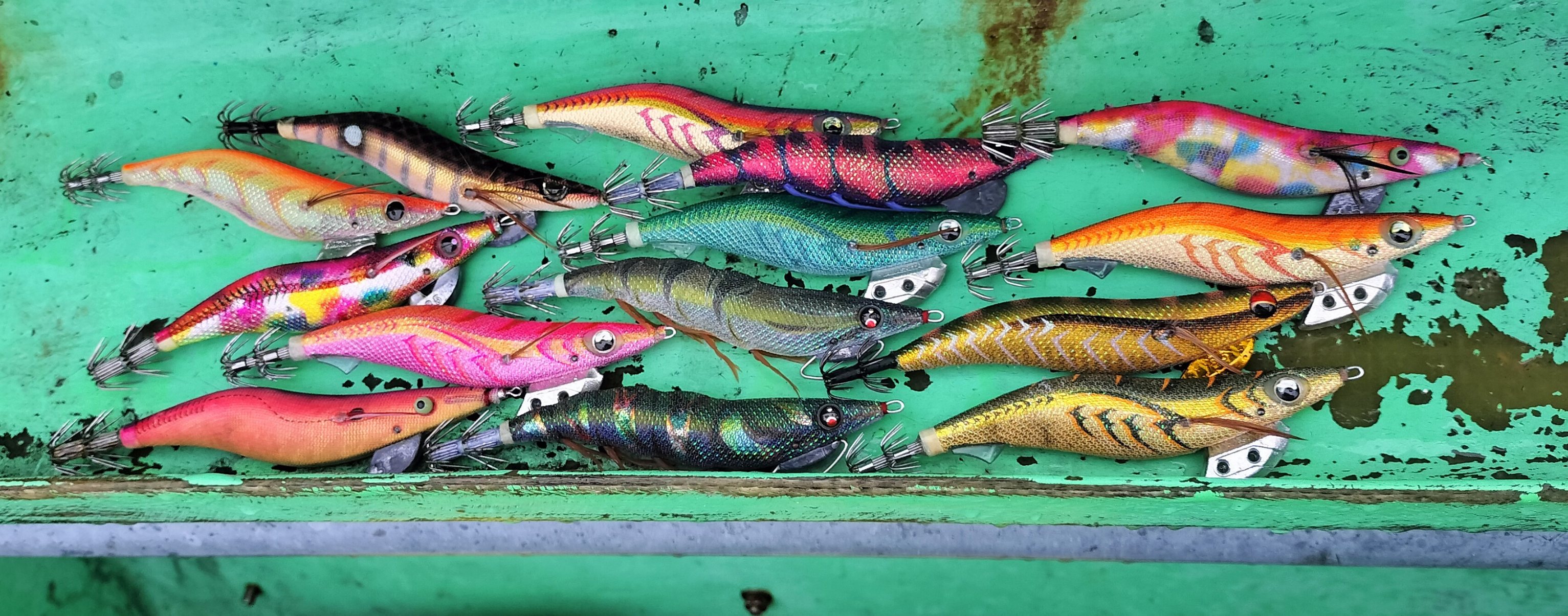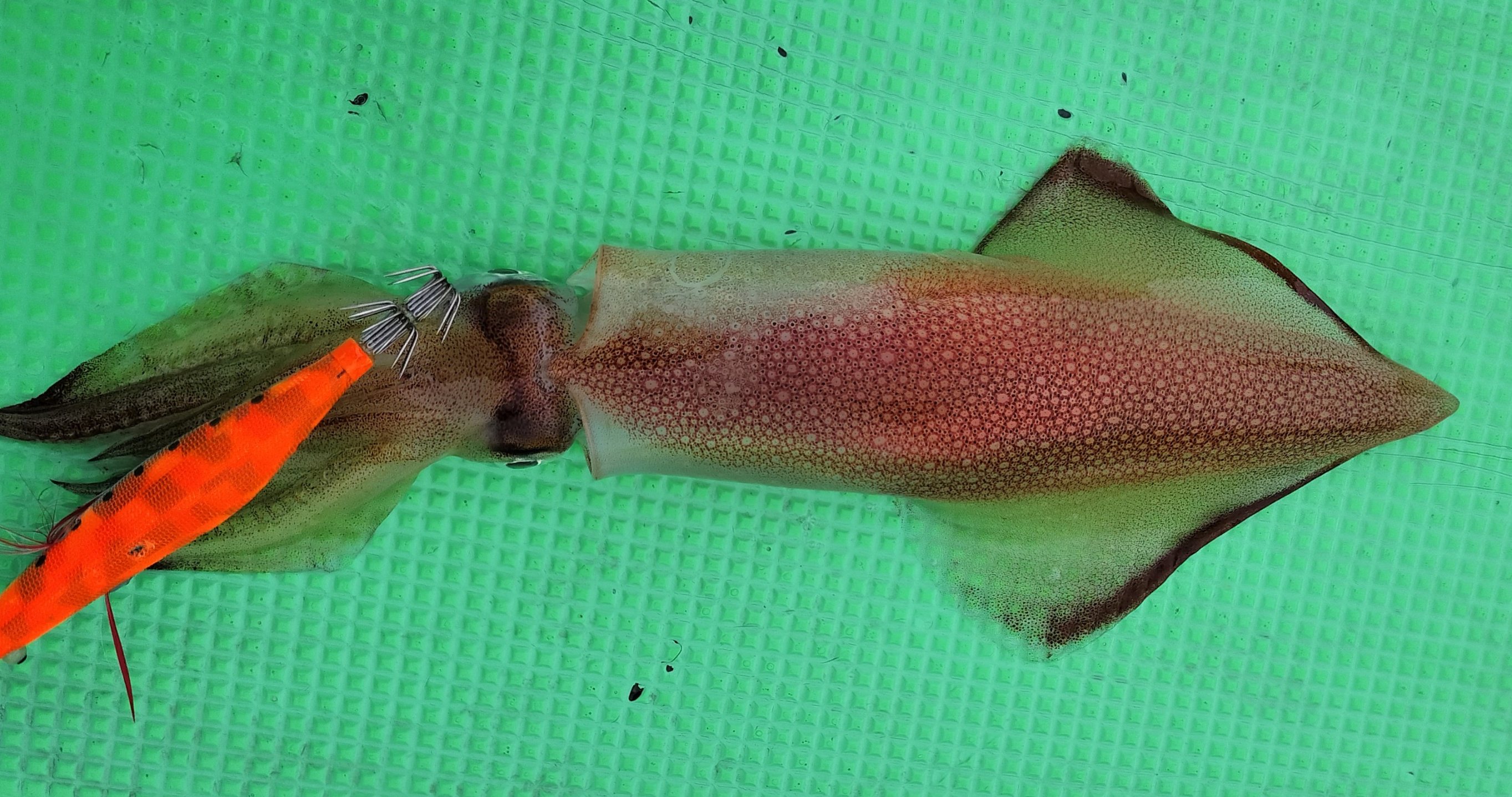 船長が広範囲にポイントを探ってくれましたが、潮の濁り/澄み加減はポイント毎に微妙に違うので、ポイントの状態に合わせてエギを選択した方が良さそうでした!!