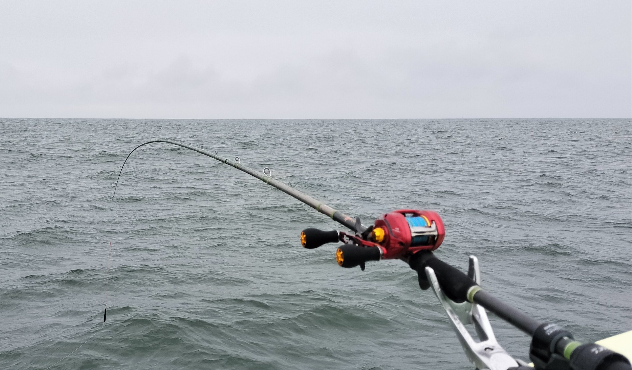 沖上がりまで30分を残し、船長は乗っ込みらしい個体を狙って10m台の浅場を流すもウネリの影響が濃く出て船中でロッドが曲がる事は無くストップフィッシング。